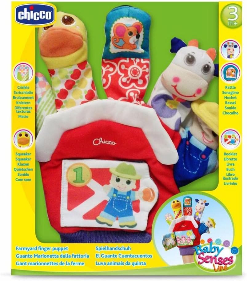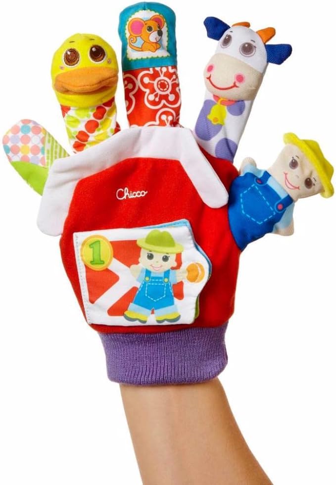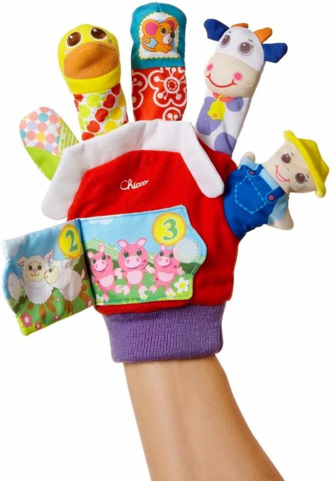 Metti il guanto della marionetta sulla tua mano per intrattenere il tuo bambino. Adorerà vedere la fattoria prendere vita davanti ai suoi occhi mentre racconti le tue storie: la pannocchia di mais fruscia, l'anatra suona il clacson mentre il topo e la mucca tintinnano. Grazie al libro illustrato potrete contare insieme: 1 contadino, 2 pecore e 3 porcellini. Lavabile in lavatrice. Prodotto in Cina