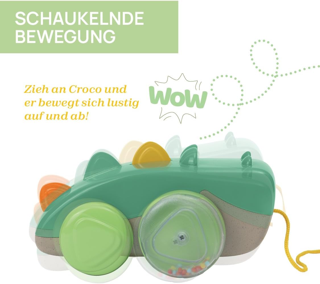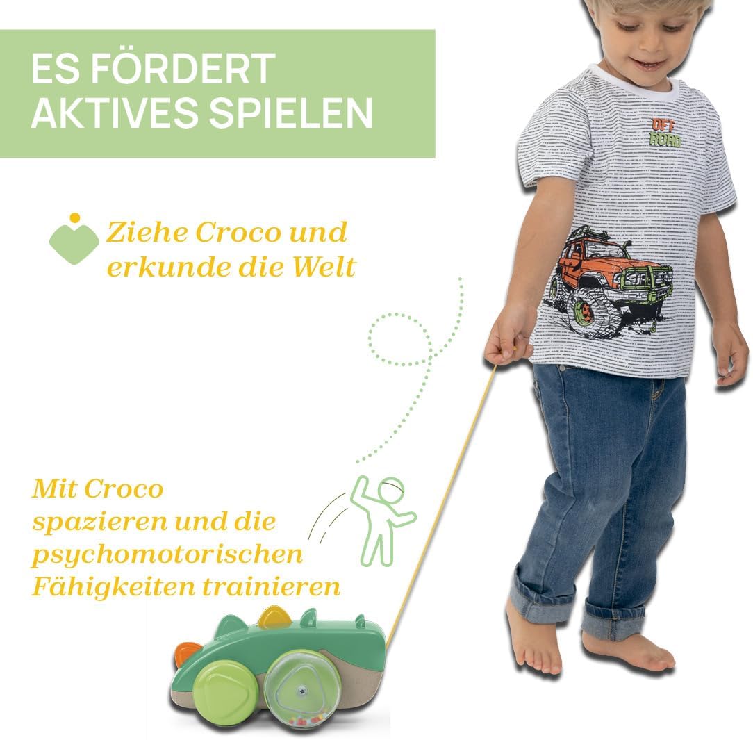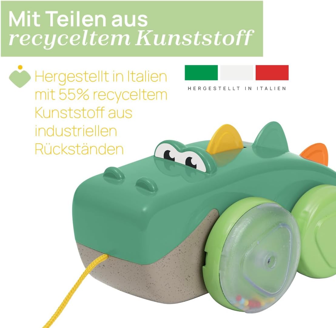 UN SIMPATICO COCCODRILLO progettato per incoraggiare il bambino a camminare. Croco si muove in modo divertente, muovendo il corpo e le creste su e giù. Realizzato in plastica riciclata. TIRA IL COCCODRILLO e le palline si muovono all'interno delle ruote con divertenti effetti sonori e visivi SVILUPPA ABILITÀ PSICOMOTORIE: Portare in giro il coccodrillo incoraggia il bambino a muoversi e giocare attivamente. AMICO DEL PIANETA: Realizzato con il 55% di plastica riciclata da residui industriali IMBALLAGGIO RICICLABILE: Il nostro imballaggio è riciclabile e realizzato con carta certificata FSC. In tal modo, sosteniamo la conservazione delle foreste, della biodiversità, delle persone e degli ecosistemi che dipendono da esse.