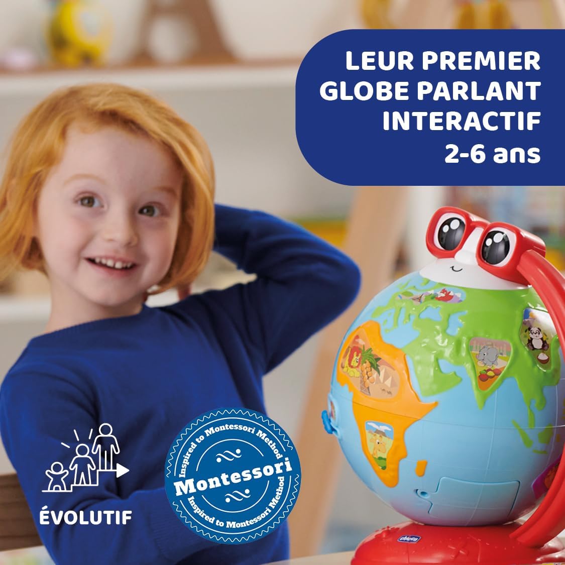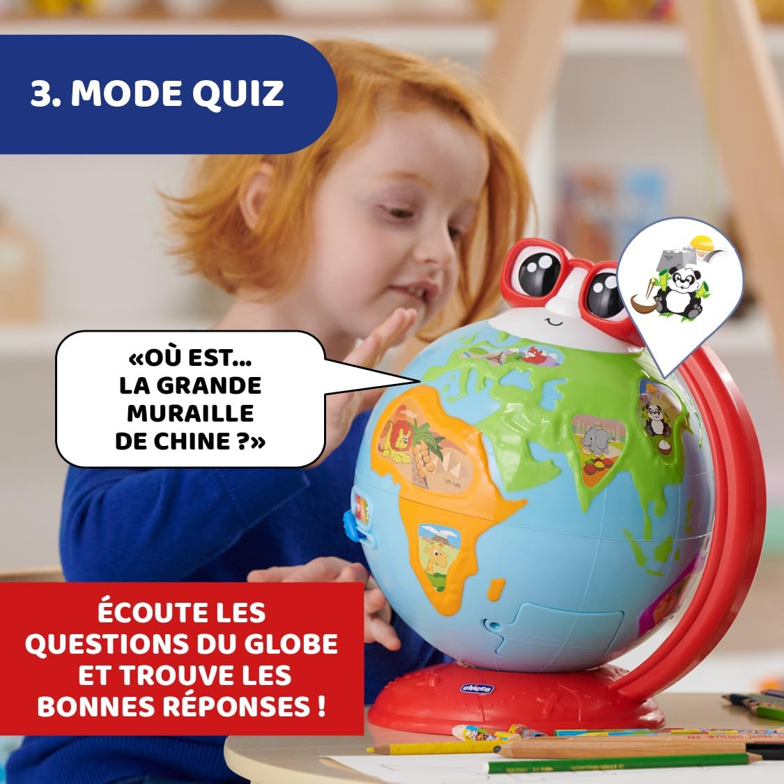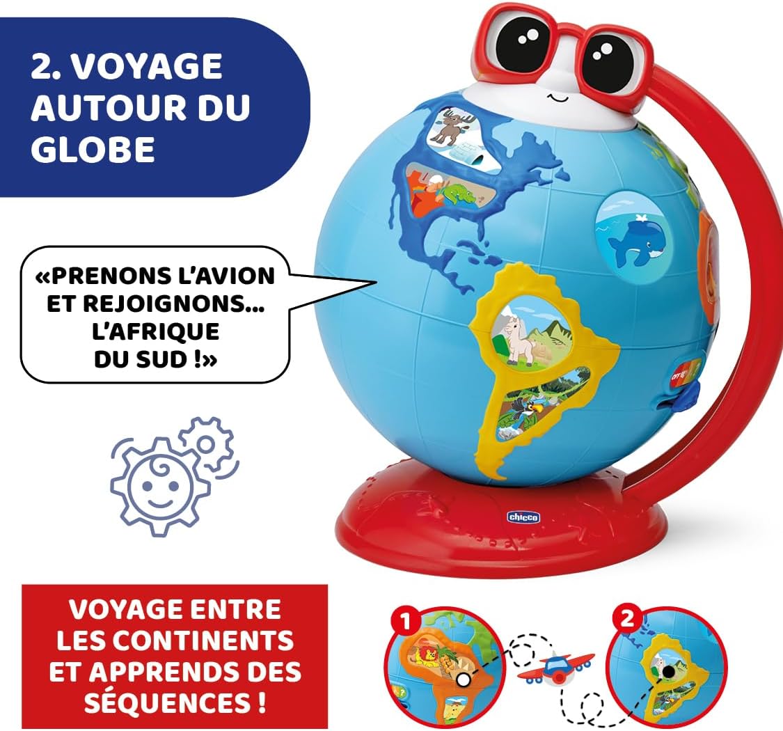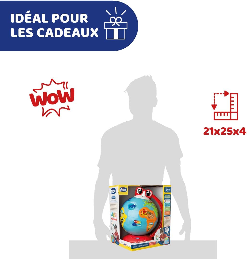 Globo elettronico: il globo Chicco Edu è un globo interattivo con cui i tuoi figli imparano a conoscere la geografia: va in viaggio dove scoprono le meraviglie del nostro pianeta CONTENUTI INTERATTIVI: Edu Globe permette ai tuoi bambini di scoprire continenti, animali esotici, monumenti impressionanti e mezzi di trasporto, con oltre 300 contenuti, canzoni e 12 tasti interattivi GIOCO DI APPRENDIMENTO: ispirato al metodo Montessori, Edu Globe aiuta a sviluppare il pensiero logico, l'immaginazione spaziale e l'autonomia attraverso quiz e 3 modalità di gioco Scopri la modalità Pianeta: i tuoi bambini potranno ruotare il globo e premere i 12 tasti interattivi per scoprire le meraviglie di ogni continente attraverso canzoni, suoni e curiosità Modalità "giro per il mondo": segui Justus's indicazioni da continente a continente con tutti i mezzi di trasporto, dalla moto al sottomarino, sviluppando così il pensiero logico del tuo bambino Modalità QUIZ: i giochi interattivi a quiz allenano la conoscenza dei tuoi bambini: trova la risposta giusta e premi il continente giusto per ascoltare la promessa di Justus e continuare a giocare Giocattolo per bambini: scopri tutti i giocattoli di Chicco e quindi la grande varietà di giocattoli e regali per la prima infanzia per ragazze e ragazzi