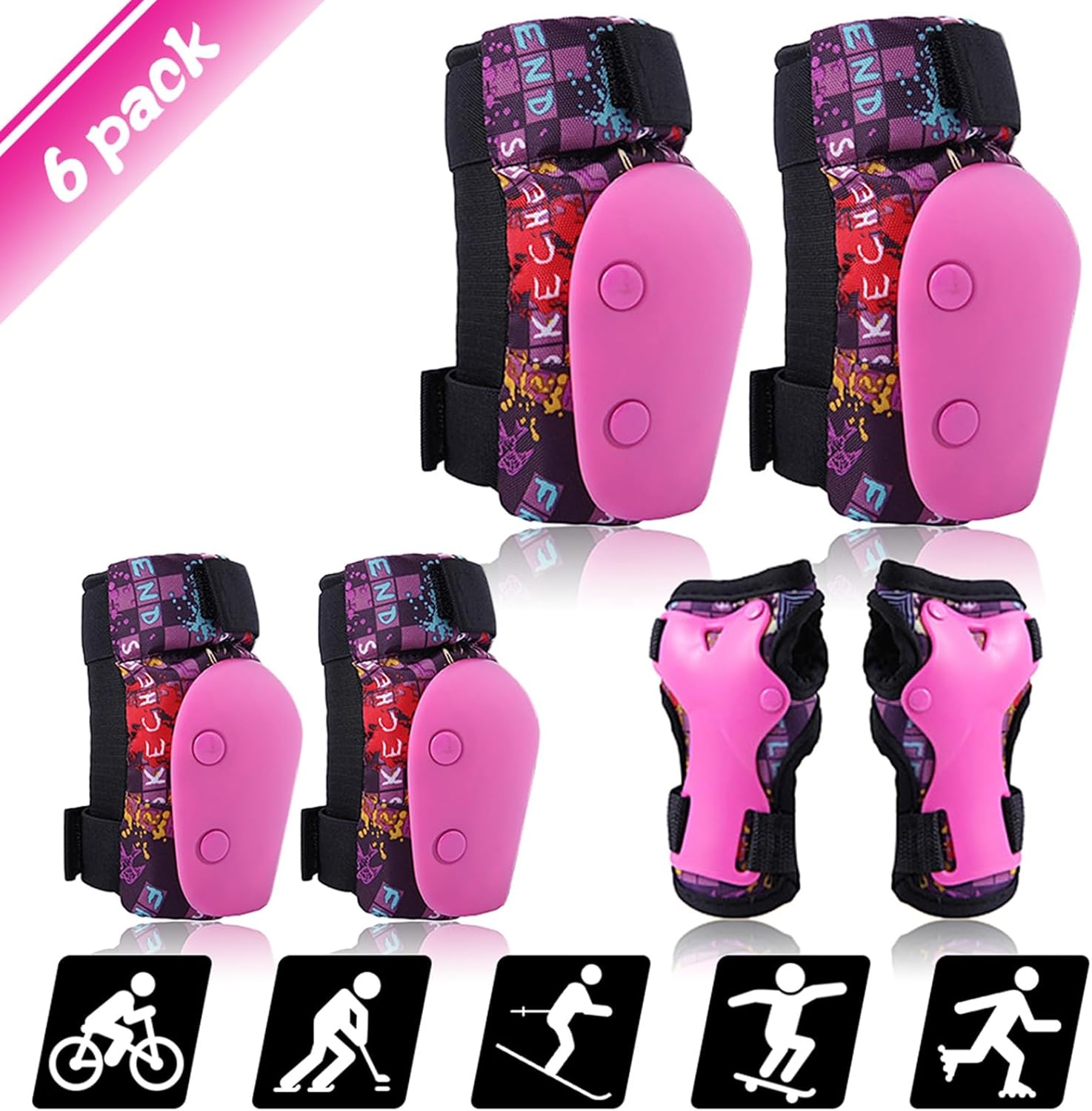 [Protezione a tutto tondo] Mantieni i tuoi bambini al sicuro durante gli sport con questo set di attrezzature protettive a 6 pezzi tra cui ginocchieri, padignine e guardie da polso. [Confortevole e resistente] realizzato in tessuto in poliestere e guscio addominali resistenti per il massimo comfort e durata, con imbottitura in schiuma morbida per l'assorbimento di ammortizzatori. [Design traspirante] Il tessuto a rete consente traspirabilità e comfort, ideale per le calde giornate estive. Cinghie regolabili per adattamento personalizzato. [Uso versatile] Ideale varietà di attività come bicicletta, , scooter e altro ancora. Adatto a bambini di età compresa tra 3 e 12 anni. [Facile da indossare] Due opzioni di condimento - manica con bendaggio per sicurezza o bendaggio per traspirabilità. Facile da mettere e decollare.