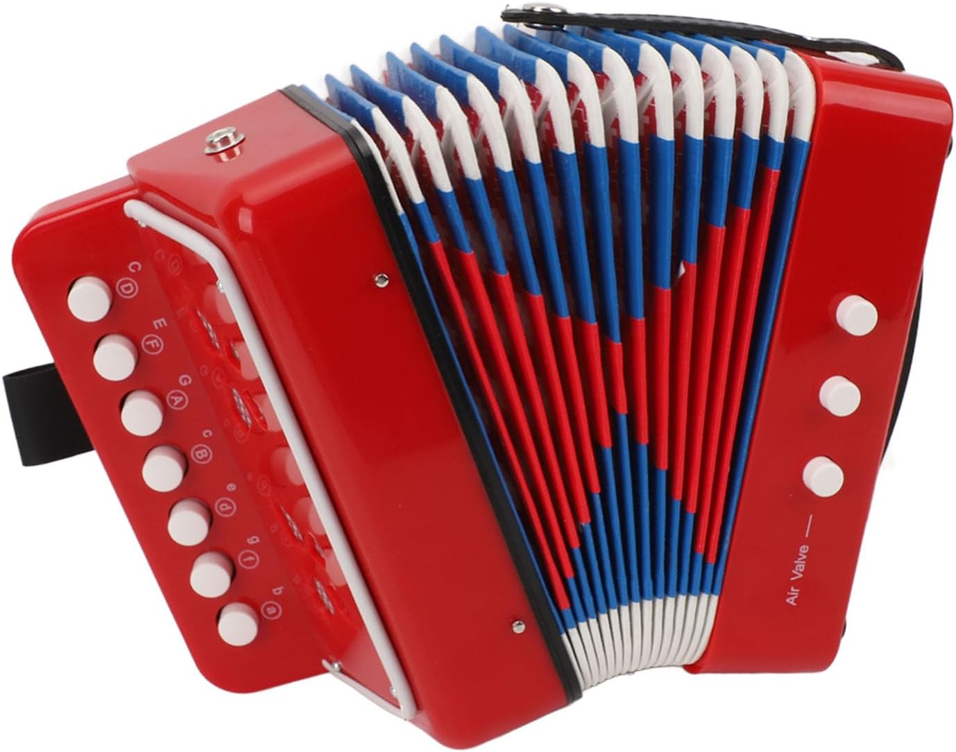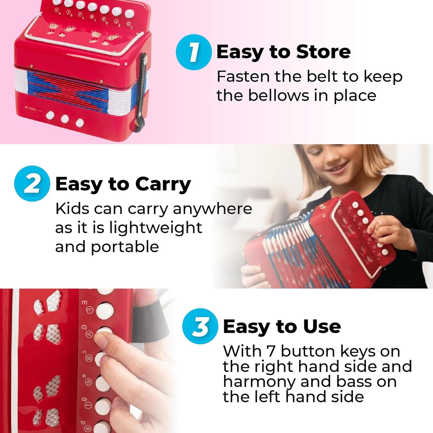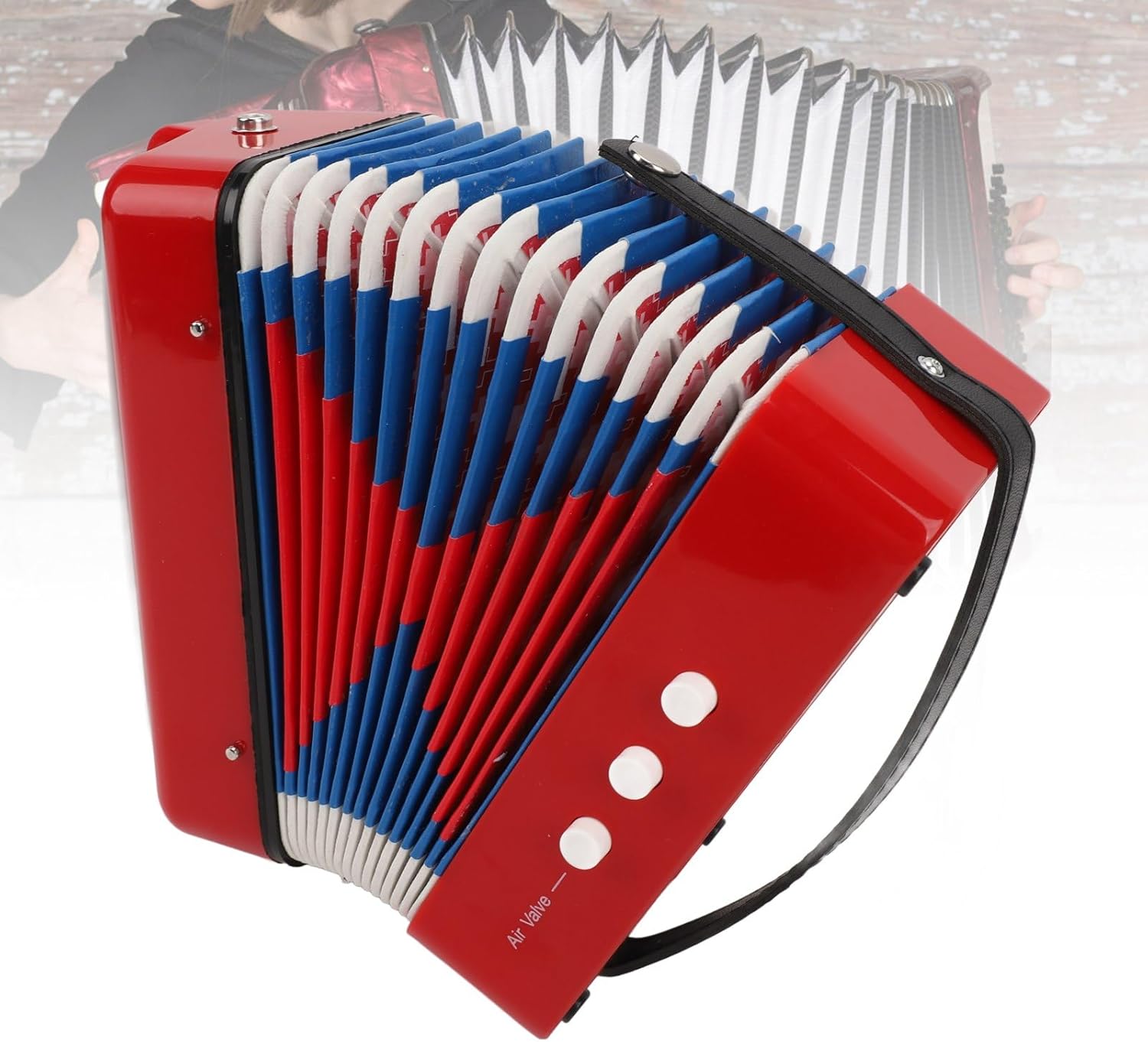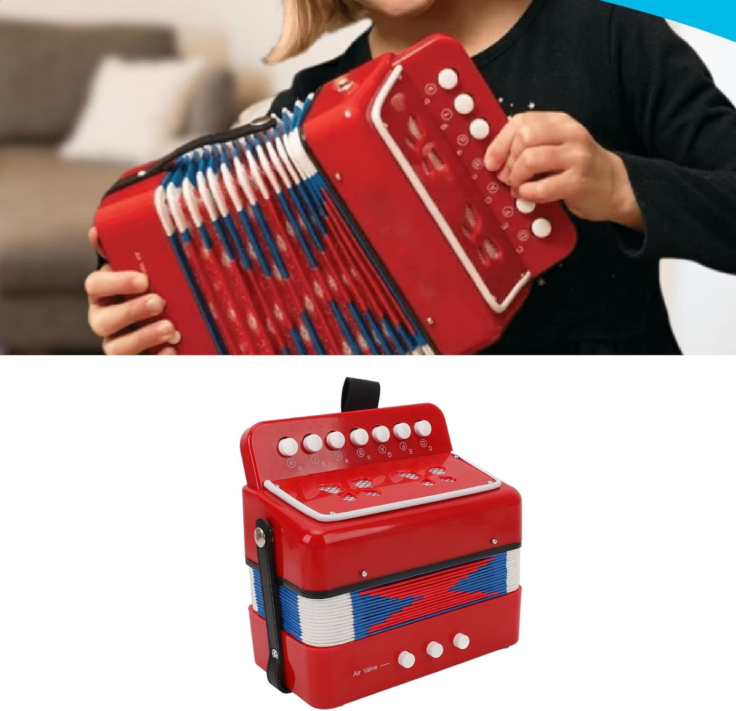 [Educazione musicale] - Questa fisarmonica affascina i principianti con bellissimi toni, aiutando in senso musicale e sviluppo del coordinamento occhio -mano. [Costruzione durevole] - Fatto in ABS, pelle, carta kraft e tessuto per longevità e prestazioni affidabili. [Design portatile] - Formo leggero con fibbia della cintura laterale per un facile trasporto, ideale per la pratica musicale in movimento. [Per principianti] - Include una guida di apprendimento per i musicisti alle prime armi da imparare e suonare, perfetta per quelli nuovi allo strumento. [Impara a giocare] - Porta a pulsante con 7 chiavi e 2 pulsanti di basso, consentendo ai principianti di giocare 14 note allungando o comprimendo il soffietto.