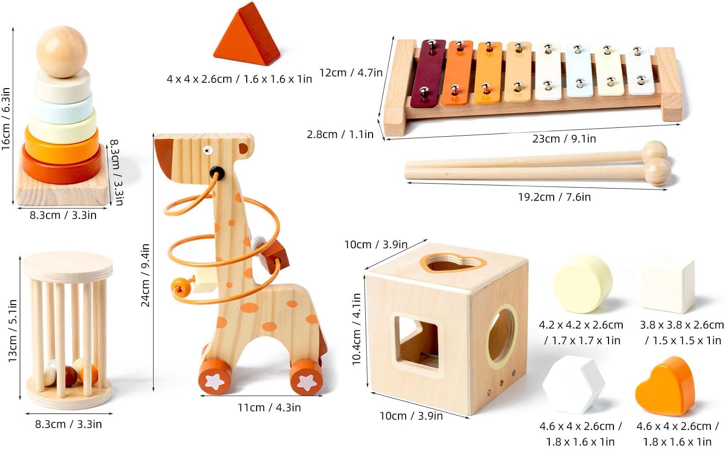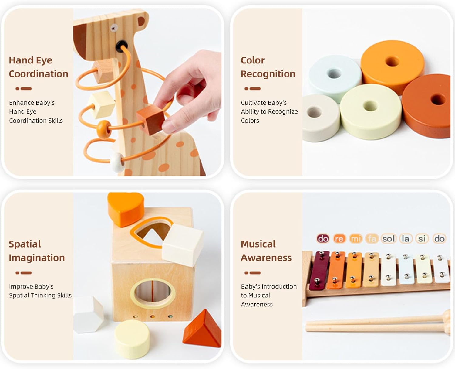 [Set unico]: il design accattivante promuove l'interazione genitore-figlio, rendendo il tempo di musica piacevole per tutti. [Materiale in legno di qualità]: realizzato in legno premium, garantendo un ambiente di gioco sicuro per i bambini. [Early Education Music Combo]: coltiva il senso musicale dei bambini e l'interesse fin dalla giovane età. [Progettazione di strumenti a percussione]: migliora le esperienze sensoriali e il coordinamento occhio-mano in modo divertente ed educativo. [Funzionalità di assistenza all'insegnamento]: strumento efficace per gli istruttori per insegnare concetti musicali tradizionali e favorire l'amore per la musica.
