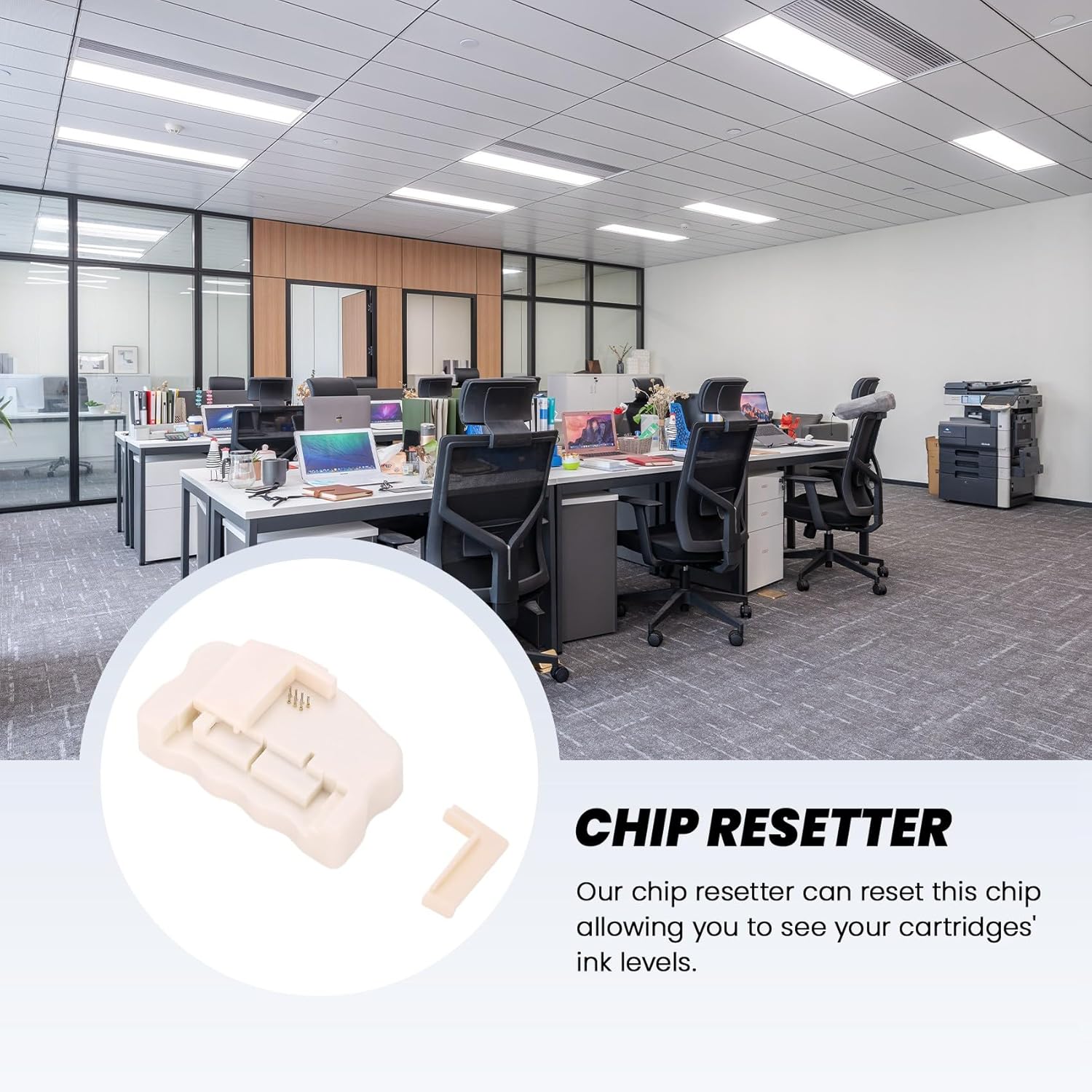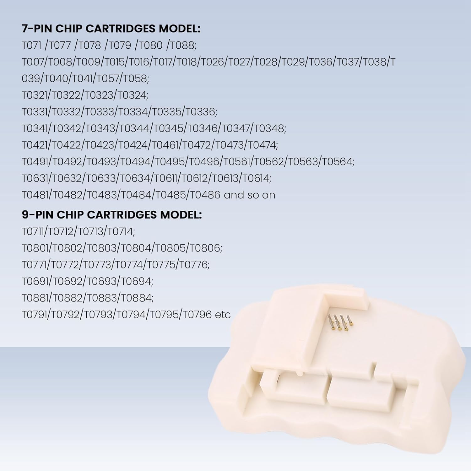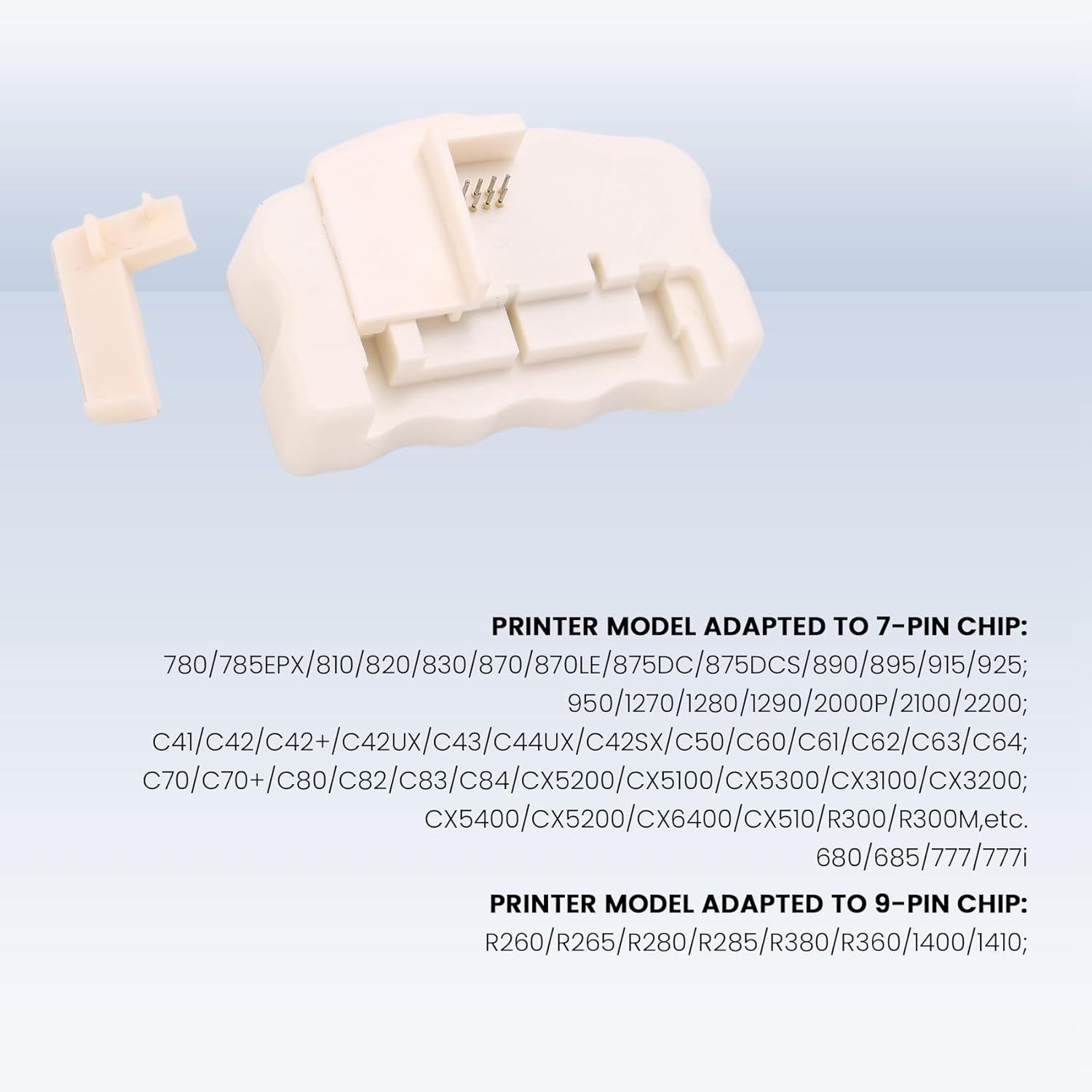 Basta allineare i perni e verso il basso per alcuni secondi per completare il Il resetter è garantito per funzionare su chip a 7 e 9 pin e su "chip compatibili" prodotti da terze parti. Il nostro chip resetter può resettare questo chip consentendo di vedere i livelli di inchiostro delle cartucce. Questo chip resetter è compatibile con le seguenti cartucce e stampanti: