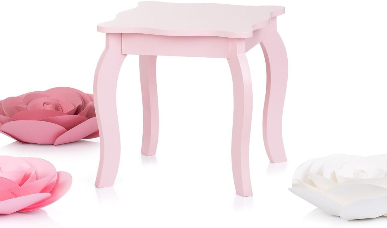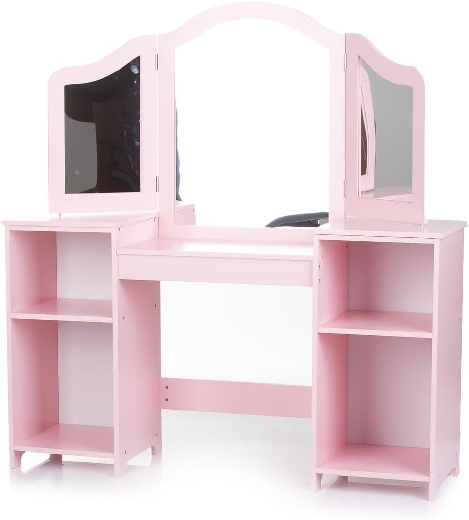 Tavolino da toilette per bambini a partire da 3 anni Tavolino da toilette con sgabello, vani portaoggetti grande specchio a tre luci ampi ripiani aperti, in legno Utilizzabile anche senza specchio, ad esempio come scrivania