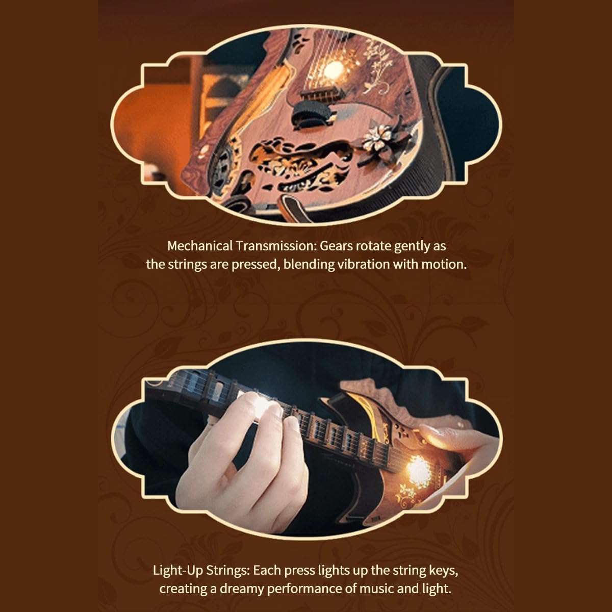Doppia modalità di riproduzione e corde LED interattive: questo kit di montaggio per chitarra fai-da-te presenta due modalità di riproduzione distinte: passa facilmente tra melodie a nota singola e modalità accordo. Le luci a LED integrate illuminano le corde durante il gioco, aggiungendo un magico elemento visivo alla tua creatività musicale Squisita fattura e durata: ogni modello di chitarra Dream in legno 3D è realizzato in legno liscio di alta qualità con motivi dettagliati stampati UV, garantendo sia un aspetto estetico che una lunga durata. Perfetto per collezionisti di modelli e appassionati Design portatile e versatile: leggero e compatto, questo modello di chitarra suonabile è ideale per molteplici scenari: visualizzalo come elegante arredamento da scrivania, usalo a casa per rilassarti o portalo con te mentre viaggi per goderti la musica in viaggio Coinvolgente esperienza di costruzione fai-da-te: con 70 pezzi tagliati con precisione, questo kit di modelli offre un processo di costruzione gratificante e coinvolgente. Combina l'estetica classica dello strumento con la meccanica funzionale a ingranaggi, rendendolo un progetto appagante per adulti e menti creative Idea regalo unica: presentato come un kit tutto in uno, questo kit di montaggio per chitarra fai da te è un regalo premuroso ed educativo per compleanni, vacanze o occasioni speciali. Si rivolge agli amanti della musica, agli appassionati di puzzle e a coloro che cercano un pezzo decorativo ma funzionale