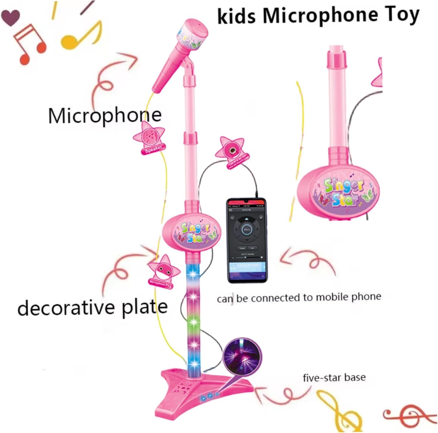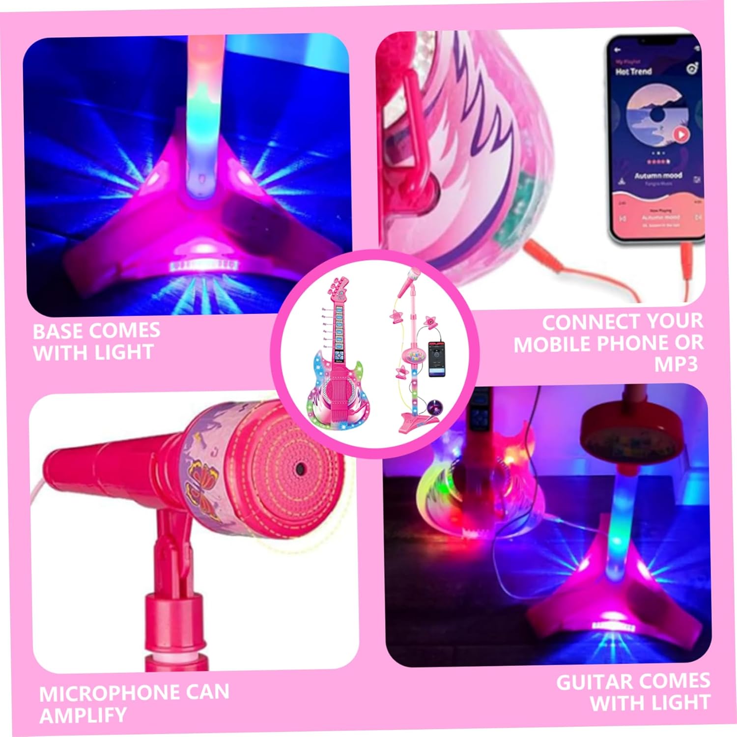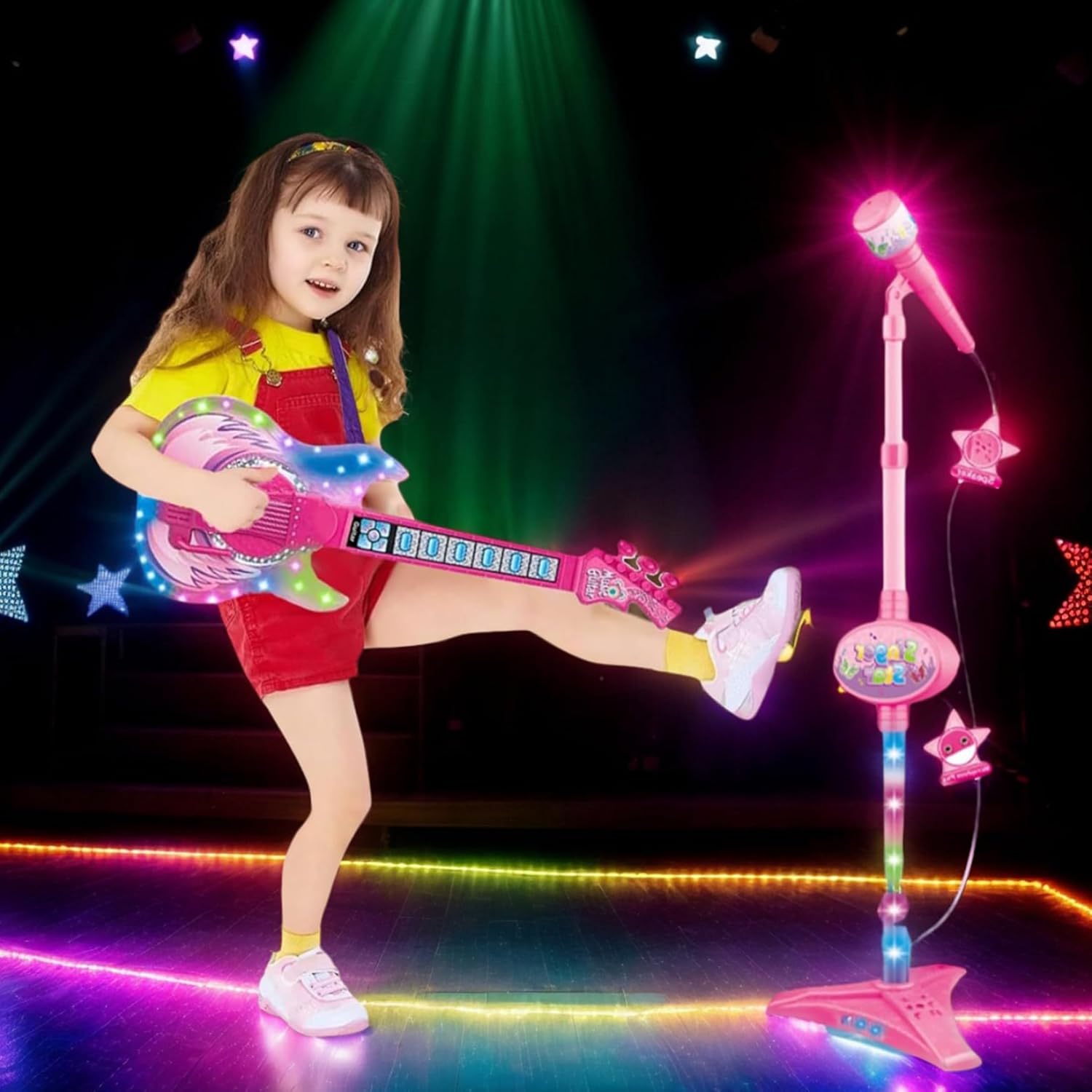 Divertimento musical interattivo: questo set di chitarra e microfono per bambini 2 in 1 incoraggia i bambini a esplorare la musica e sviluppare la creatività attraverso il canto e il suonare, fornendo intrattenimento avvincente che stimola la loro immaginazione. Chitarra e microfono set per bambini chitari Regolabile e adatto ai bambini: progettato con un supporto di altezza regolabile, questo giocattolo adatta facilmente ai bambini di età compresa tra 5-9, garantendo comfort e postura corretta durante il gioco, rendendolo perfetto per i bambini in crescita e un uso prolungato..Chitarra per bambini chitarra elettrica Luci intense ed effetti sonori: dotato di luci colorate e autentici suoni di chitarra, questa chitarra per bambini elettrici porta l'eccitazione e un'esperienza sensoriale in ogni sessione di gioco, migliorando il divertimento e l'apprendimento..Chitarra elettrica per bambini per bambini di età compresa tra 5 e 9 anni Sviluppo educativo: questo set di strumenti giocattolo aiuta a migliorare il coordinamento degli occhi della mano, le abilità ritmiche e la fiducia attraverso il gioco musicale interattivo, rendendolo un giocattolo di apprendimento ideale per lo sviluppo della prima infanzia..Chitarra per bambini di età compresa tra 5 e 9 giocattoli di apprendimento Materiali stabili e sicuri: realizzati con materiali di qualità, non tossici, la chitarra e il microfono sono costruiti per resistere alle sessioni di gioco energetico garantendo al contempo la sicurezza e la durata che ogni genitore desidera..Imparare i giocattoli