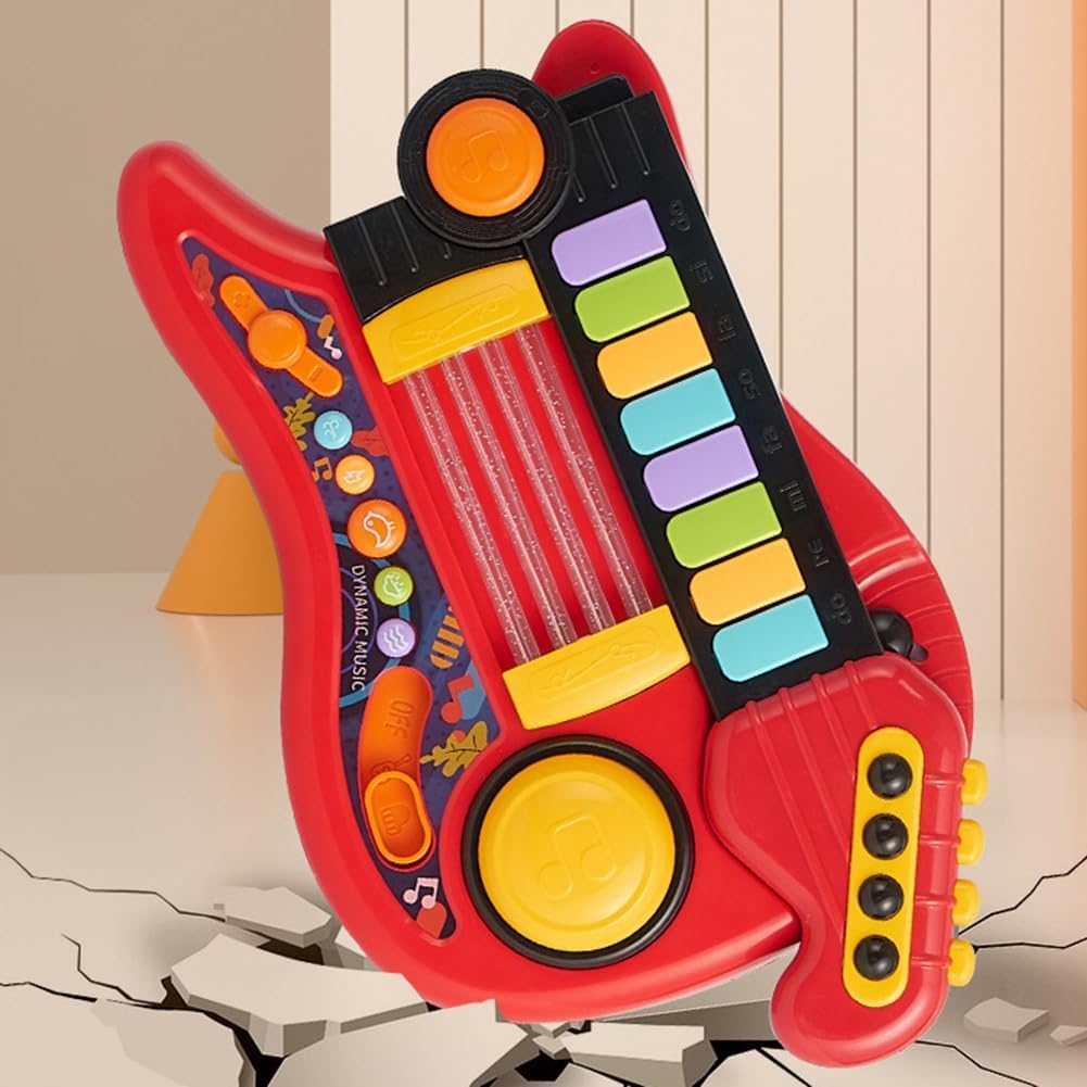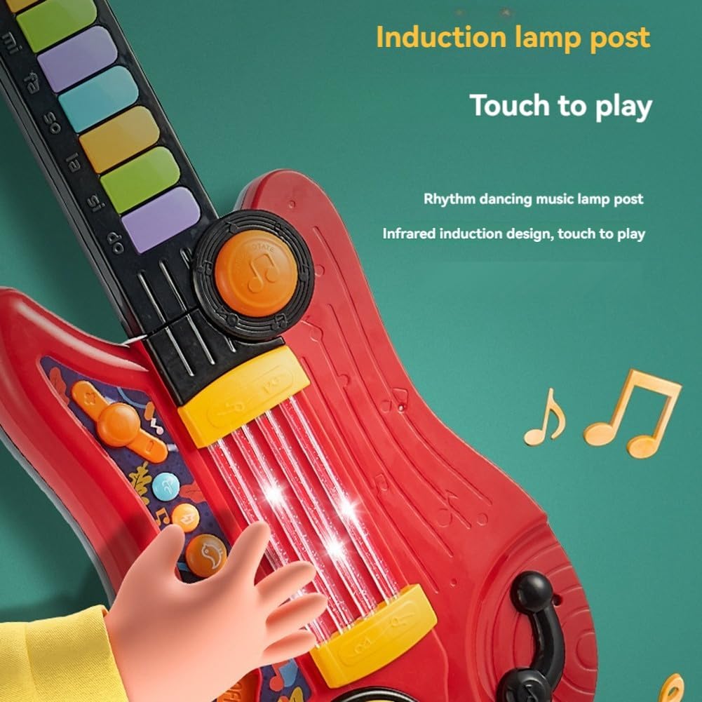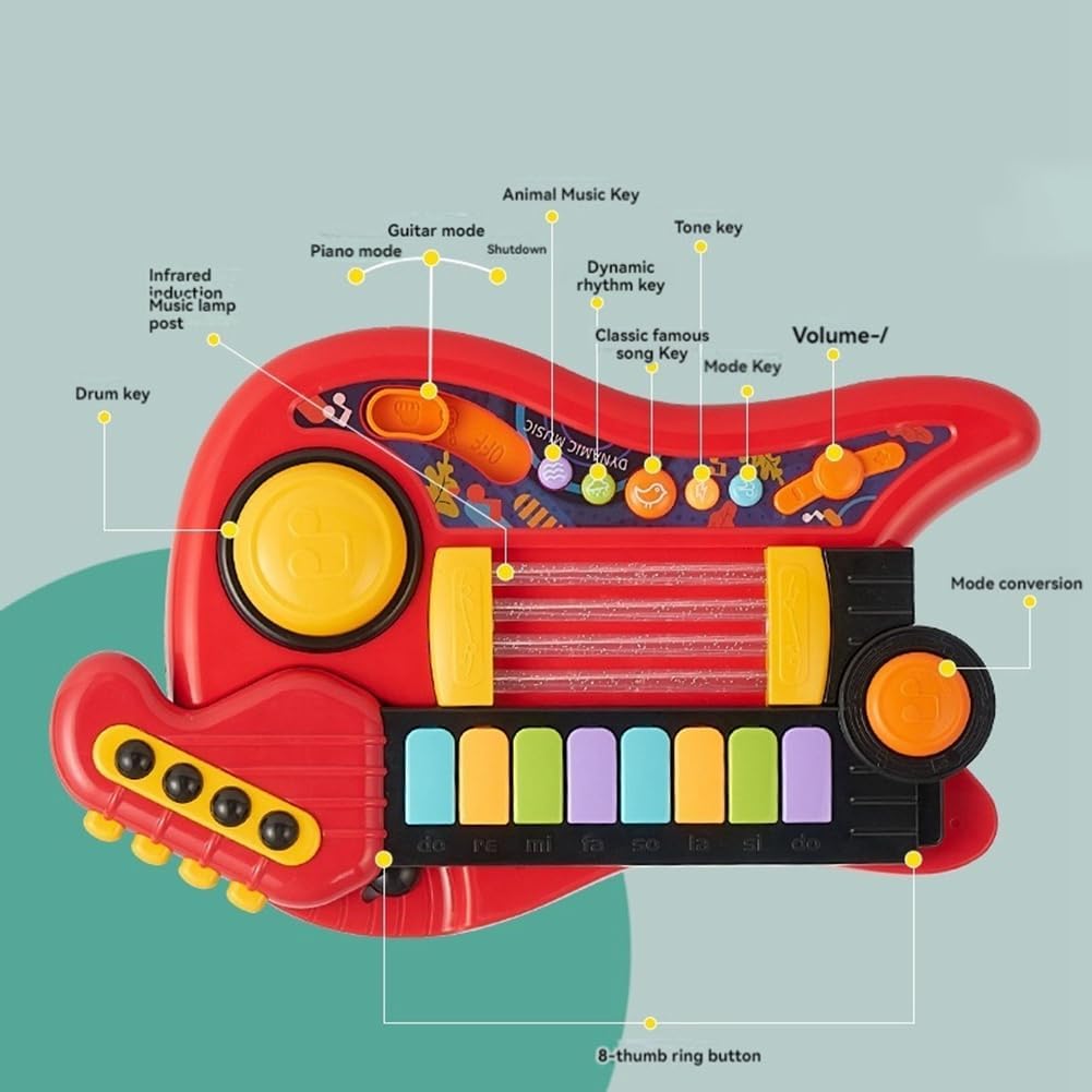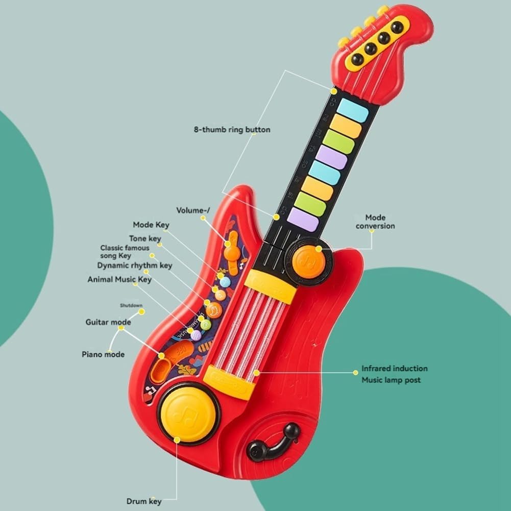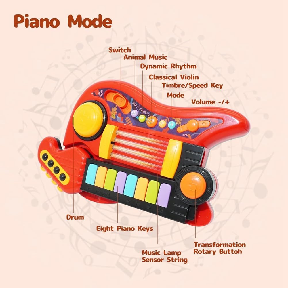 La chitarra giocattolo per bambini combinata con una tastiera di pianoforte per i più piccoli è un eccellente giocattolo per insegnare concetti musicali come ritmo e teoria. Questa chitarra elettrica per bambini incoraggia il legame interattivo tra genitori e figli, stimolando lo sviluppo cognitivo dei bambini e rafforzando la relazione genitore-figlio. i bambini interagiscono con la chitarra, non solo affinano le loro capacità esecutive, ma sviluppano anche abilità cognitive cruciali. I più piccoli esplorano con entusiasmo musica suonando batteria, strimpellando chitarre e tintinnando pianoforti. 5 suoni strumenti musicali (chitarra, pianoforte, violino, batteria, flauto) possono aumentare significativamente loro interesse musicale migliorando allo stesso tempo l'attenzione, e creatività. Questo simula più giocattoli musicali per i più piccoli non solo soddisfa loro curiosità, ma incoraggia anche conoscere diverse espressioni musicali e sperimentare combinazioni suoni. Effetti di luce soffusa lo valorizzano, aggiungendo un tocco accattivante al momento del gioco. Indossati schiena o tenuti in mano, i bambini possono creare melodie e sentirsi delle star sul palco. Con colori vivaci e bordi arrotondati, promuove anche lo sviluppo della percezione del colore nei bambini. è ideale per qualsiasi occasione regalo per il tuo neonato, bambino piccolo, nipote o nipoti. Il bambino è indispensabile per le attività al chiuso o all'aperto, alle feste o in classe. Giocattoli per bambini perfetti per compleanni, Natale, feste tropicali Luau, Halloween, ecc.