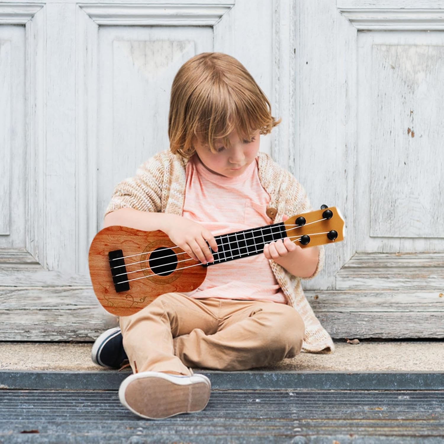 Replica l'aspetto di veri strumenti: con un'imitazione di texture di venature del legno, questo ukulele per bambini è progettato per stimolare l'amore dei bambini per la musica e l'arte ricreando l'aspetto autentico di strumenti reali. Si adatta alle mani dei bambini: Build for Children, questo mini ukulele viene fornito con corde in nylon morbido al tatto che proteggono le dita delicate. Le sue dimensioni compatte e il design ergonomico consentono ai bambini di gestire facilmente. MATERIALI ANTISSORI: Costruito con materiali ecologici, questo ukulele per bambini può resistere all'uso quotidiano con la sua struttura robusta e le superfici anti-uso. Un compagno musicale affidabile e duraturo per un maggiore divertimento. Arricchire l'educazione musicale: la passione dei bambini per la musica con la teoria di base e il semplice repertorio, migliorando il coordinamento e rafforzando il ritmo e la sensibilità solida. Buon regalo: eleva il percorso musicale di tuo figlio con l'ukulele per bambini, ospitato in una lussuosa confezione regalo. Rafforzare i legami genitori-figlio e fare ricordi indimenticabili mentre suonano melodie commoventi.