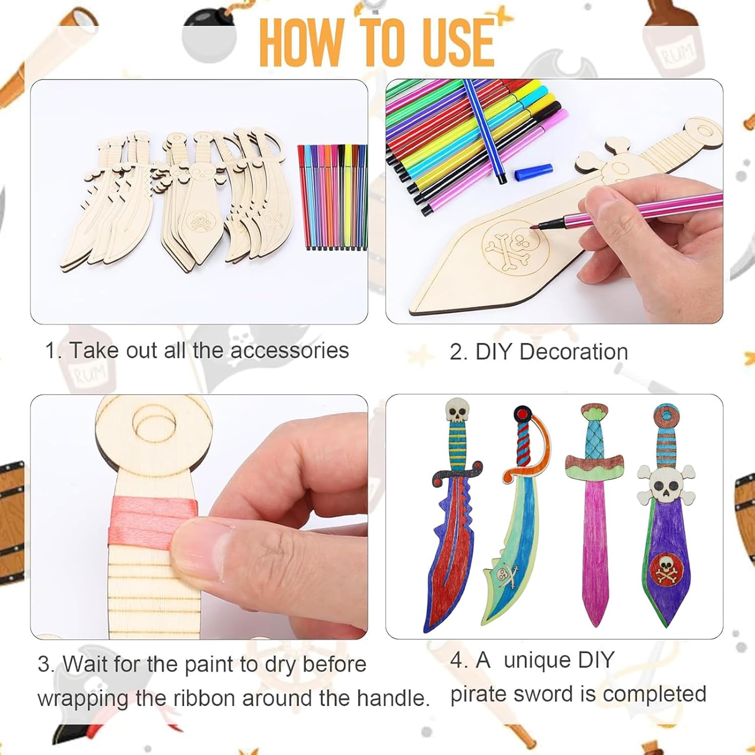 Contenuto Ricco Del Set: questo set creativo contiene 16 spade da pirata in legno, disponibili in 4 modelli diversi, e 12 pennelli colorati. la superficie in legno mantiene la sua consistenza naturale, rendendola perfetta per la pittura creativa. con una vasta gamma di modelli e una quantità sufficiente, è la scelta ideale per il fai da te in famiglia Materiali Sicuri E Di Alta Qualità: spade pirata in legno realizzato in legno levigato, senza residui né sbavature, è molto sicuro per i bambini. la sua struttura robusta lo rende resistente e durevole, anche quando i bambini giocano liberamente ai pirati. i pennelli colorati in dotazione sono atossici e innocui, hanno una forte adesione alla superficie del legno e si asciugano rapidamente, rendendoli ideali per i bambini Stimola La Creatività Fai Da Te: con queste spade da pirata dipingibili è possibile creare opere uniche. sia lo stile classico che i disegni dai colori vivaci stimolano la creatività. questo set di spade di legno per bambini è facile da usare e anche i principianti possono ottenere ottimi risultati Aiuta La Crescita E Lo Sviluppo: questo spade pirata in legno allena le capacità motorie fini dei bambini, migliora la creatività e arricchisce l'immaginazione. mentre decorano le spade, i bambini inventano storie avvincenti come la caccia al tesoro e la vita dei pirati, rendendo il gioco di ruolo più vivace. è adatto sia per la scuola materna e la scuola elementare che per la casa Ampia Gamma Di Applicazioni: questo set spade pirata in legno è perfetto per feste di compleanno a tema pirati, progetti scolastici, attività in classe e lezioni di artigianato creativo, ma può anche essere utilizzato come regalo speciale per natale, halloween, compleanni o pasqua, nonché per giochi di ruolo divertenti e abbinamenti di costumi