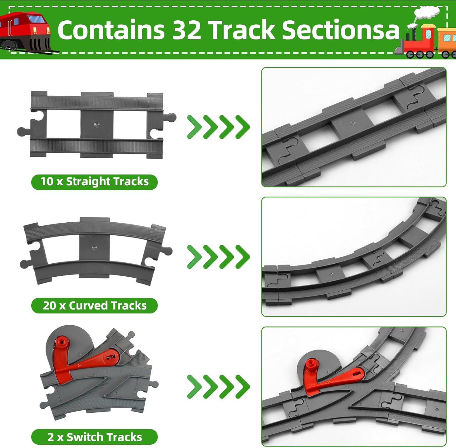 🚂【City Set di Binari】32 Pezzi Treno Binari ferroviari giocattolo include 10 binari diritti, 20 binari curvi e 2 pezzi (ricambi binari + accessori binari). Compatibile con la maggior parte dei binari ferroviari giocattolo in commercio. I binari ferroviari giocattolo di diverse forme possono essere combinati tra loro. I bambini possono dare libero sfogo alla loro immaginazione. 🚂【Materiali sicuri】City Set di Binari è realizzato in ABS di alta qualità, sicuro, resistente e durevole, per garantire ai vostri bambini un gioco sicuro e divertente. Treno Binari ferroviari giocattolo è semplice e pratico, facile da montare e smontare. I bambini possono utilizzarlo e maneggiarlo con facilità. 🚂【Compatibilità】Il City Set di Binari è compatibile con molti marchi presenti sul mercato e può essere collegato senza problemi ad altri mattoncini. Con il City Set di Binari è possibile costruire binari e scenari più grandi e complessi, ampliando così l'esperienza dei bambini. 🚂【Stimola l'immaginazione】City Set di Binari può essere assemblato in vari modi per creare binari e scenari più grandi e complessi, offrendo più divertimento nella costruzione e nel gioco. I bambini possono migliorare le loro capacità manuali e di pensiero spaziale e stimolare la loro immaginazione e creatività durante il gioco. 🎁【Il regalo perfetto】Il City Set di Binari è ideale anche per compleanni, feste in famiglia, festività e altre occasioni. Il City Set di Binari è facile da montare ed è adatto a bambini dai 3 anni in su. Giocattolo ferroviario per bambini, adatto sia a maschietti che a femminucce.
