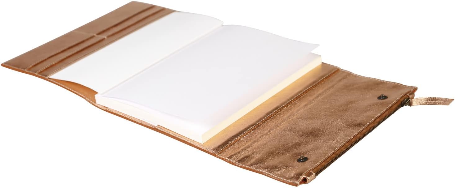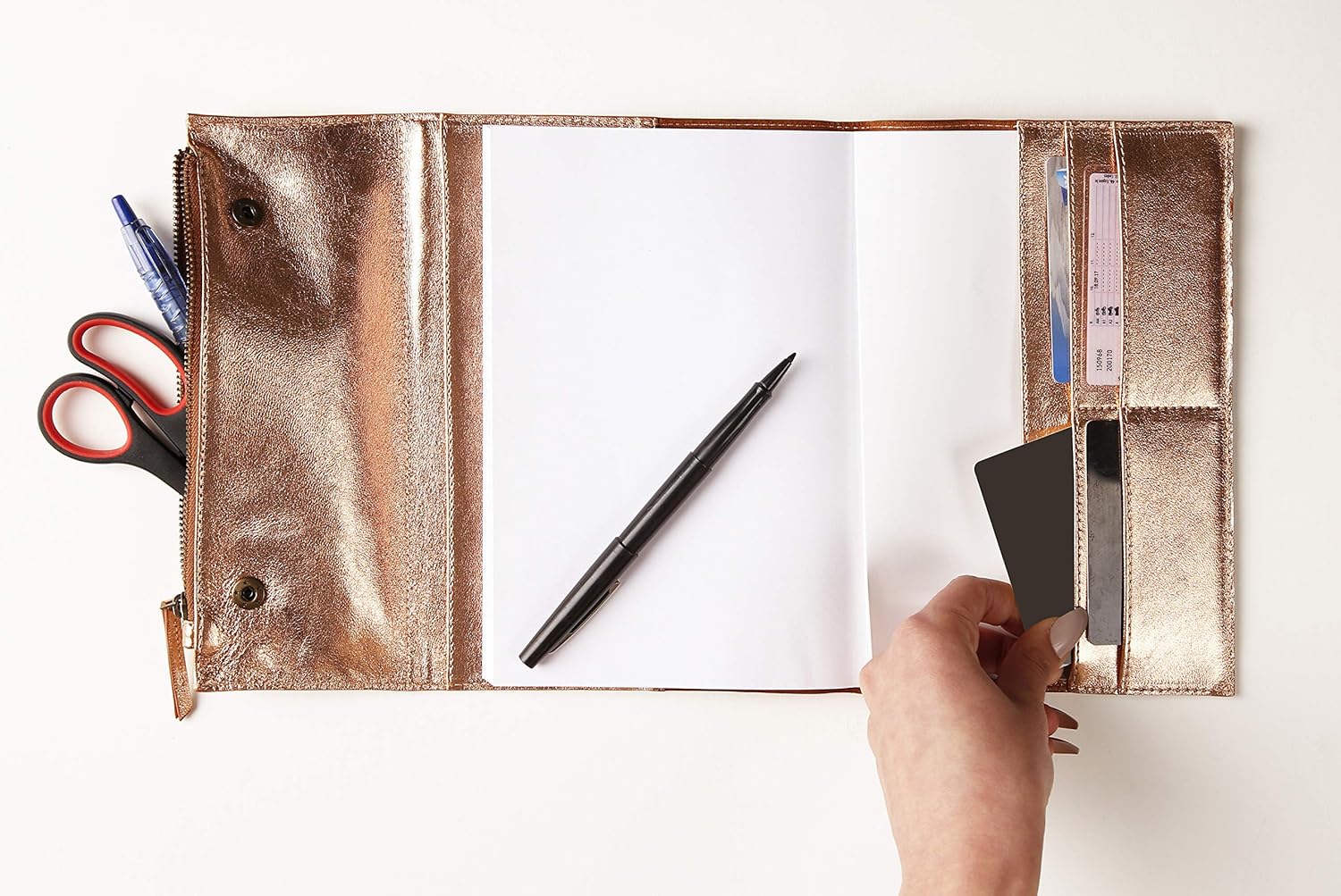 DIMENSIONE: 17x22x2,5 cm MATERIALE: Vera pelle di agnello premium, solida, pratica e piacevole al tatto Pelle di facile manutenzione ECOLOGICO: Concia vegetale della pelle, senza cromo né arsenico per preservare l'ambiente e gli operatori dei nostri laboratori di produzione DETTAGLI: Include un taccuino di 120 pagine A5 a righe all'interno La patta del porta taccuino si trasforma in un astuccio integrato grazie alla chiusura con cerniera Sul lato sono presenti 4 slot per riporre le carte PRATICO: Questo portadocumenti è compatibile con qualsiasi quaderno o quaderno formato A5 (14,8x21 cm)