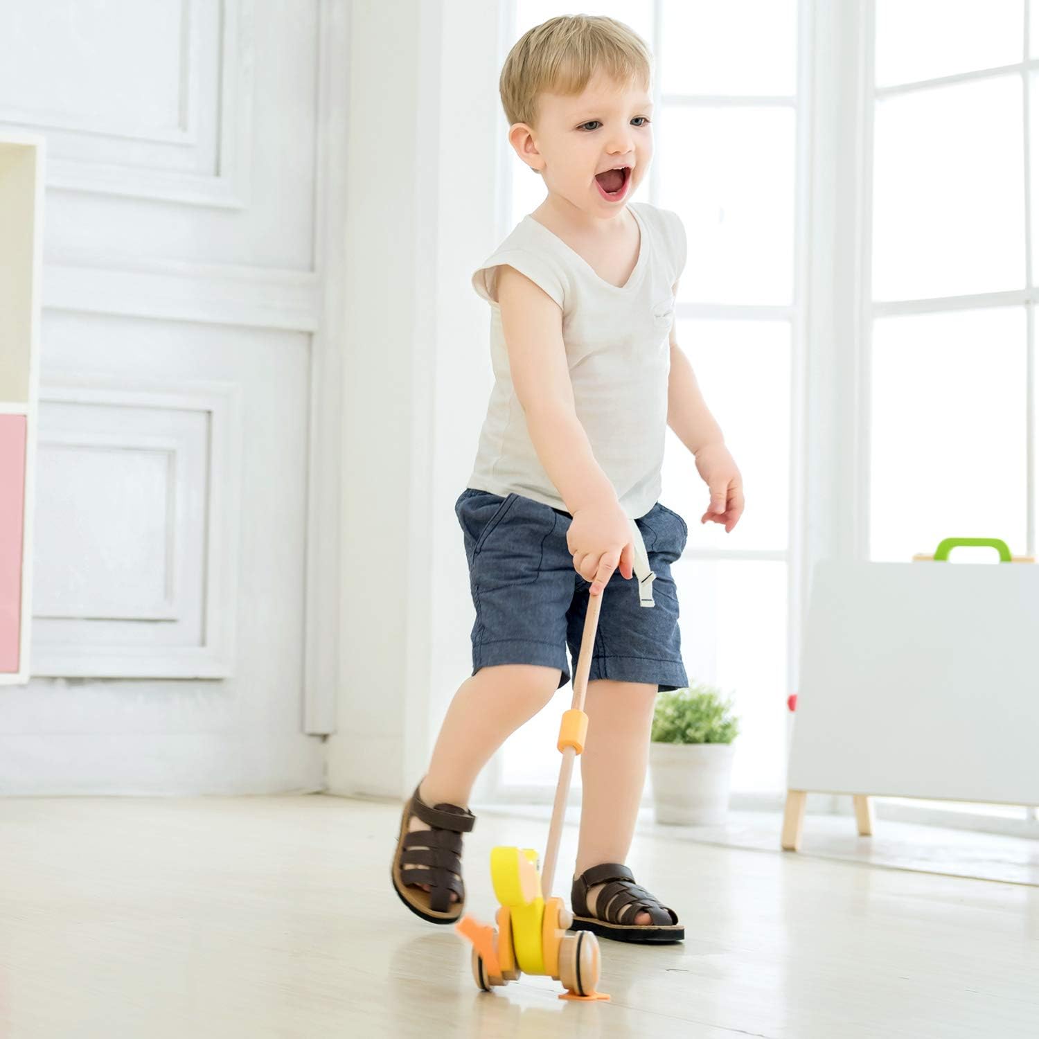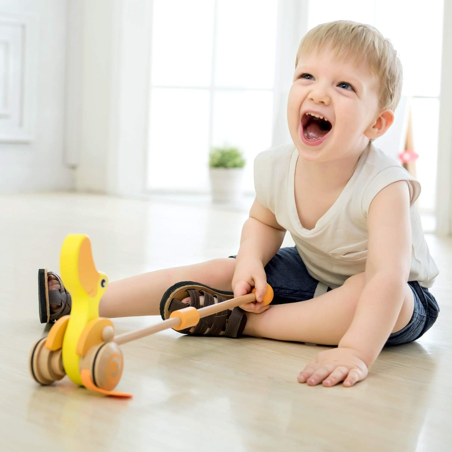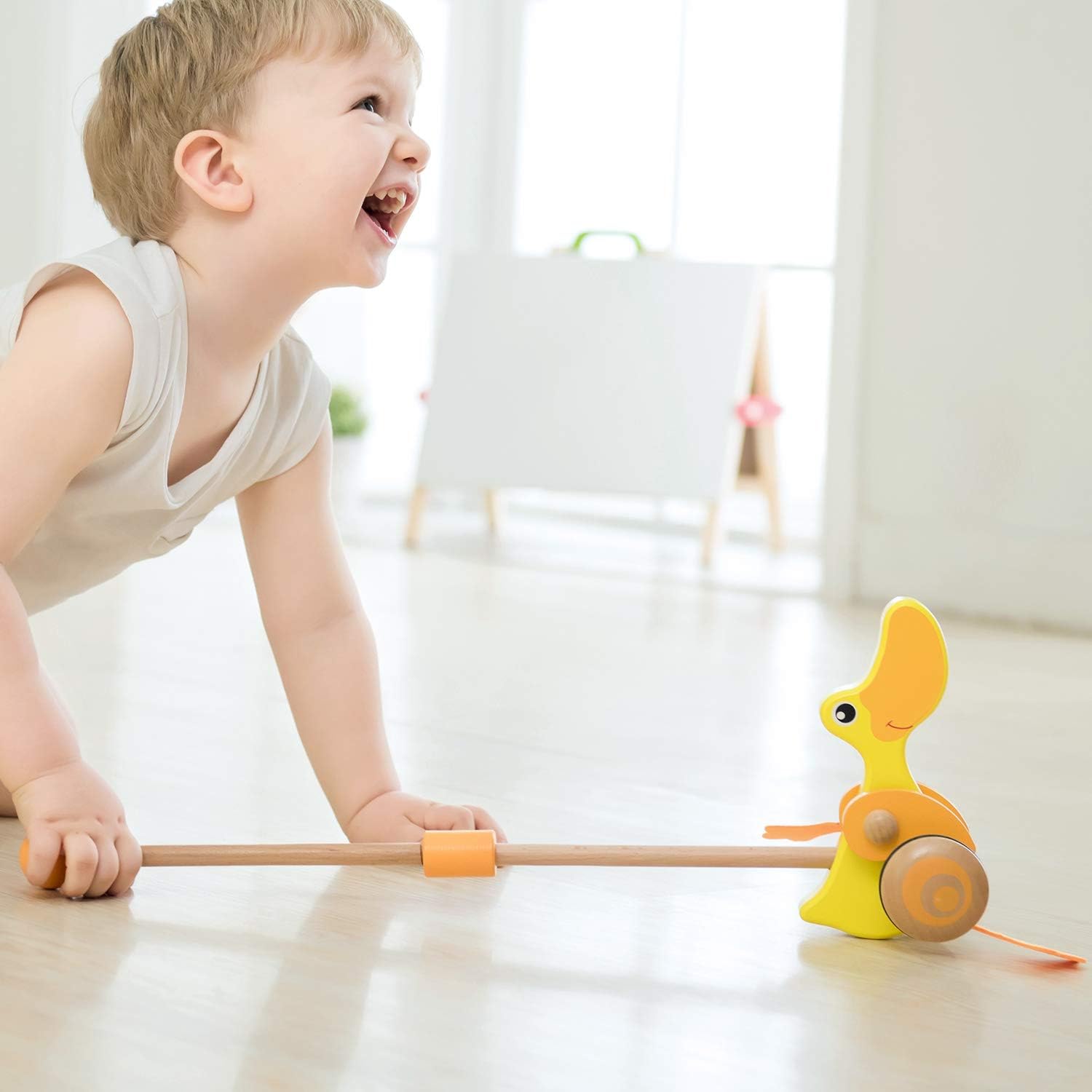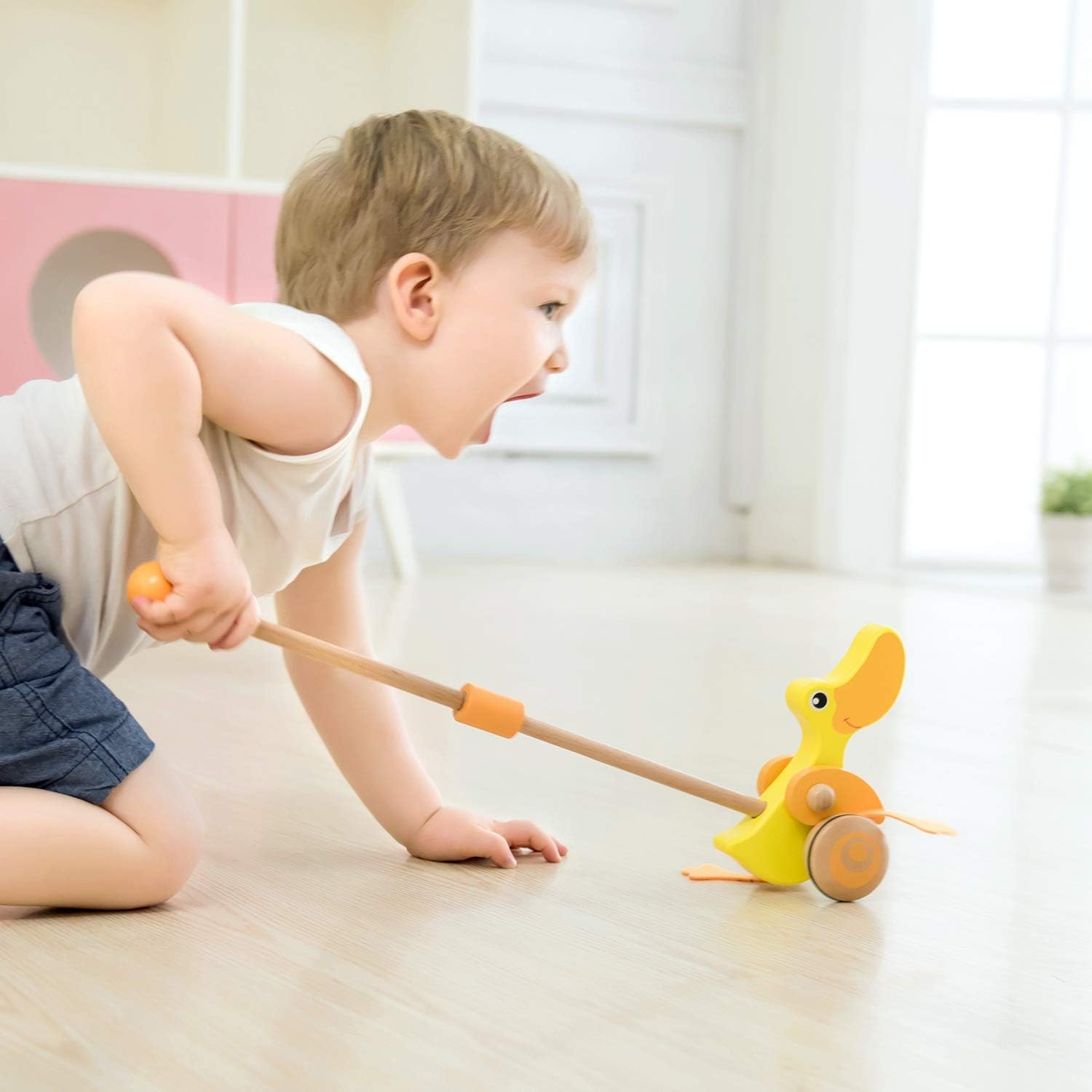 Adatta per invogliare il bambino a camminare, la simpatica papera gialla in legno si spinge facilmente grazie al pratico manico in legno ad altezza bambino piccolo Durante il movimento, le ruote fanno girare le zampine creando un simpatico suono e azionano le ali Favorisce lo sviluppo della coordinazione e dell'equilibrio Dimensione prodotto cm 38 x 47 x 11; da 12 mesi