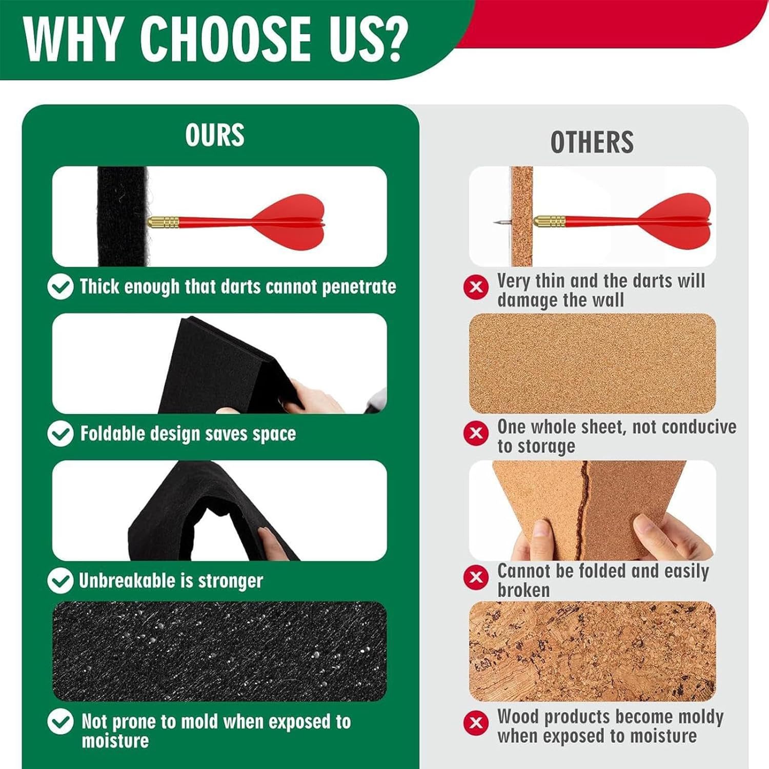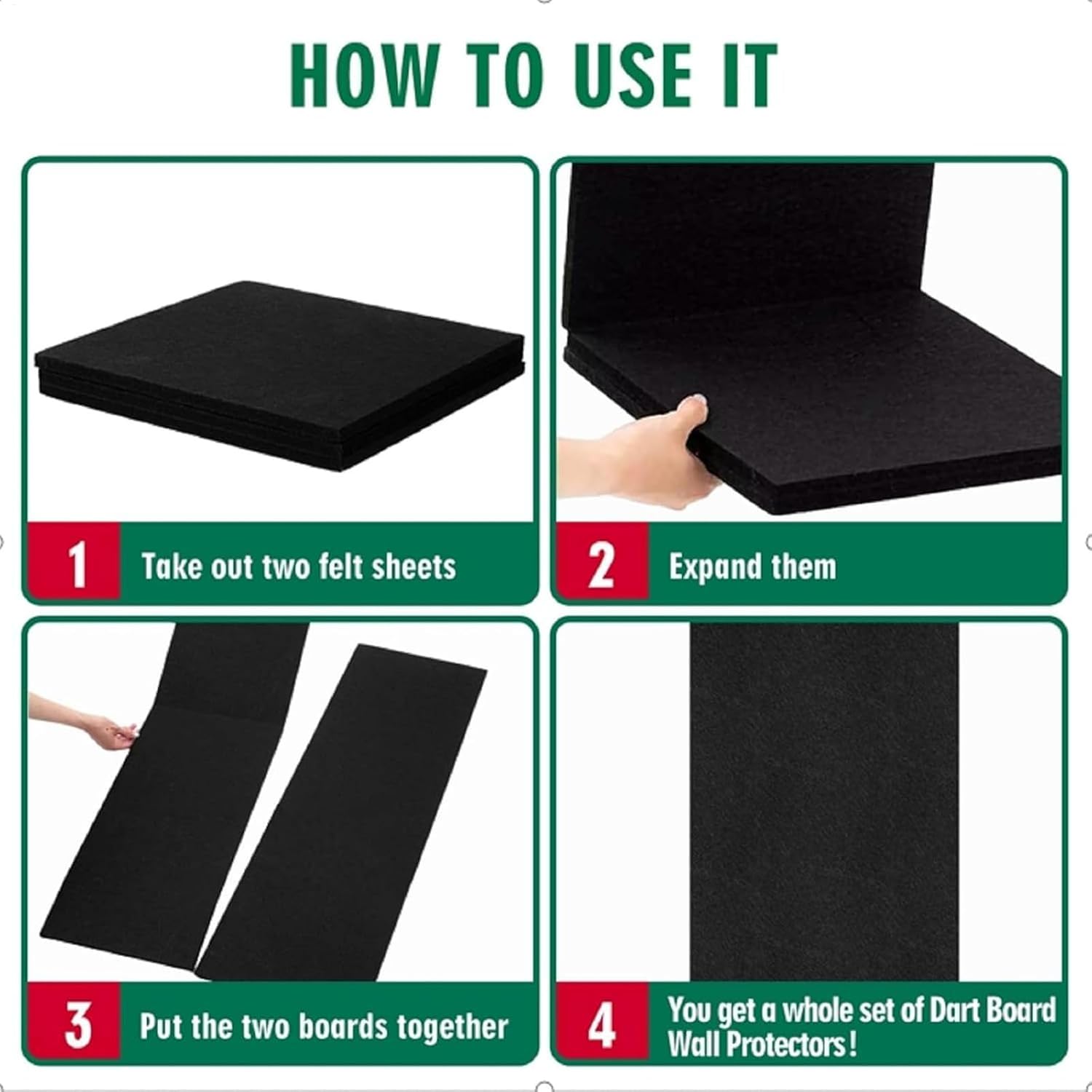 Schermatura da parete affidabile: realizzata in feltro spesso, forma un robusto strato protettivo sulla parete, prevenendo graffi e fori assorbendo efficacemente gli impatti delle freccette attraverso la sua struttura tampone ad alta resistenza per garantire una sicurezza e una manutenzione durature della parete Comoda soluzione per riporre le freccette: questa protezione da parete per bersaglio vanta un design innovativo salvaspazio, ripristinando rapidamente la sua forma piatta dopo essere piegata, offre una facile conservazione in più tipi di armadietti e soddisfa le esigenze di accesso frequenti Protezione completa della parete: previene efficacemente i danni alla parete attraverso un'ampia superficie protettiva, fornendo un'esperienza di gioco coinvolgente che si allinea notevolmente con le dimensioni standard del bersaglio per sollevare la configurazione di gioco senza sforzo Design adattabile: progettato per adattarsi a più tipi di pareti e conforme a diversi layout spaziali, questa protezione da parete per freccette offre un'installazione senza sforzo in salotti e sale giochi, garantendo facilità d'uso senza la necessità di strumenti o procedure complesse Fissaggio facile e veloce: le protezioni da parete per freccette sono dotate di nastro biadesivo per una rapida installazione, garantendo una presa salda alla parete, eliminando la necessità di strumenti complicati
