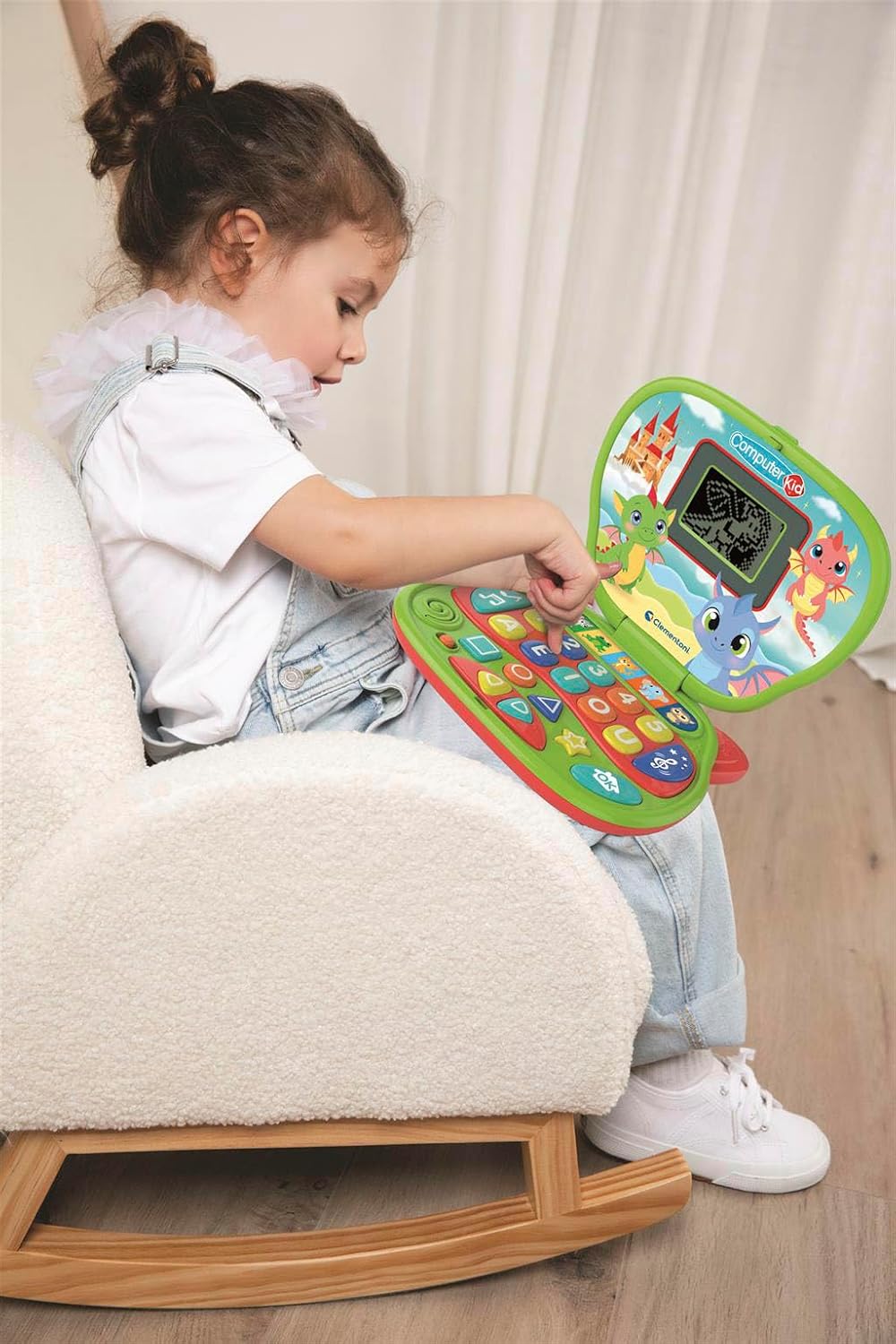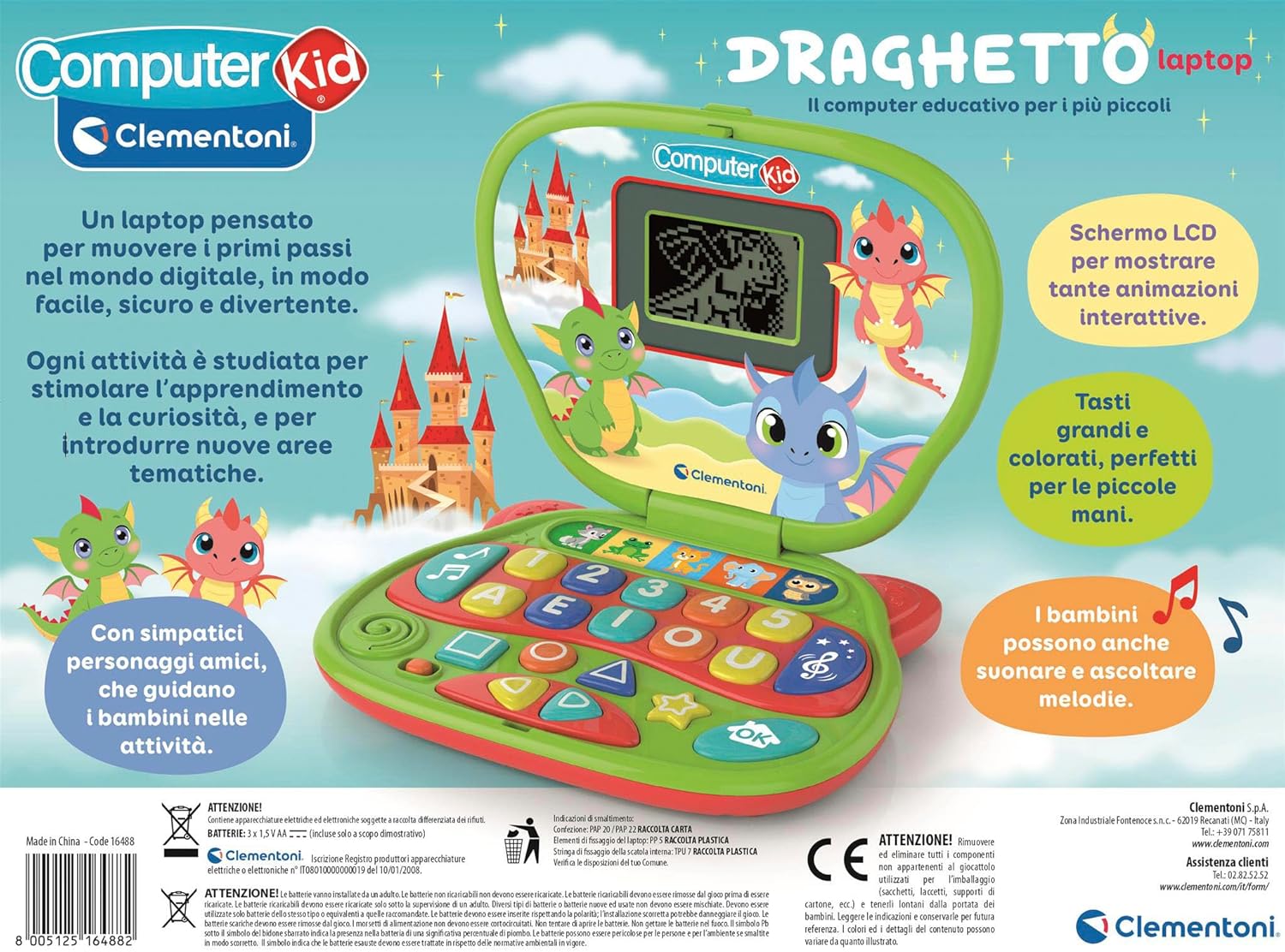UNICORNO LAPTOP: un computer educativo con 10 attività interattive che stimola l’apprendimento di lettere, numeri, forme, colori e direzioni, studiato per accompagnare i bambini nei primi passi digitali con attività divertenti e coinvolgenti IMPARARE GIOCANDO: attraverso 10 attività interattive il laptop favorisce lo sviluppo del linguaggio con lettere e parole, stimola la memoria e l’attenzione con giochi divertenti e aiuta a imparare colori, forme, direzioni e semplici melodie COME GIOCARE: grazie a 10 modalità di gioco, i bambini imparano lettere, numeri, forme, colori e direzioni attraverso attività guidate che stimolano la curiosità, schermo LCD animato, tasti grandi, suoni divertenti che rendono l’apprendimento coinvolgente COSA CONTIENE: gioco ideato, progettato e sviluppato in Italia, per bambini dai 2 anni in su; include laptop interattivo Computer Kid Draghetto con 10 attività educative integrate, schermo LCD con animazioni, tastiera colorata, batterie incluse CLEMENTONI LAPTOP: una gamma di computer educativi per bambini sullo stile di un vero laptop da portare con sé, per imparare ovunque esercitandosi in vari argomenti, come lettere, matematica, logica, musica e le basi della lingua inglese