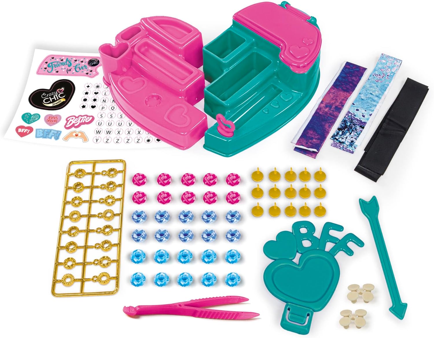 BFF JEWELLERY STUDIO: un set completo con base per la costruzione, attrezzi e perline, pensato per esplorare il mondo della bellezza creando gioielli unici e colorati in modo sicuro e divertente SFOGO ALLA CREATIVITÀ: il set permette alle bambine di sperimentare con la manualità in modo sicuro e divertente, sviluppando la loro creatività mentre creano gioielli personalizzati COME GIOCARE: il kit include tutto il necessario per creare gioielli diversi, con accessori, adesivi e perline, le bambine possono seguire i propri gusti e sperimentare in modo semplice e sicuro DIVERTIMENTO PER BAMBINI: gioco Made in Italy per bambine dai 7 anni in su, include una base per costruire i gioielli, strumento in plastica e pinzette per applicare gli adesivi, set di perline, charms e adesivi CLEMENTONI CRAZY CHIC: una gamma di giochi creativi per esprimersi attraverso moda, makeup, tatuaggi e gioielli e sviluppare manualità e fantasia giocando