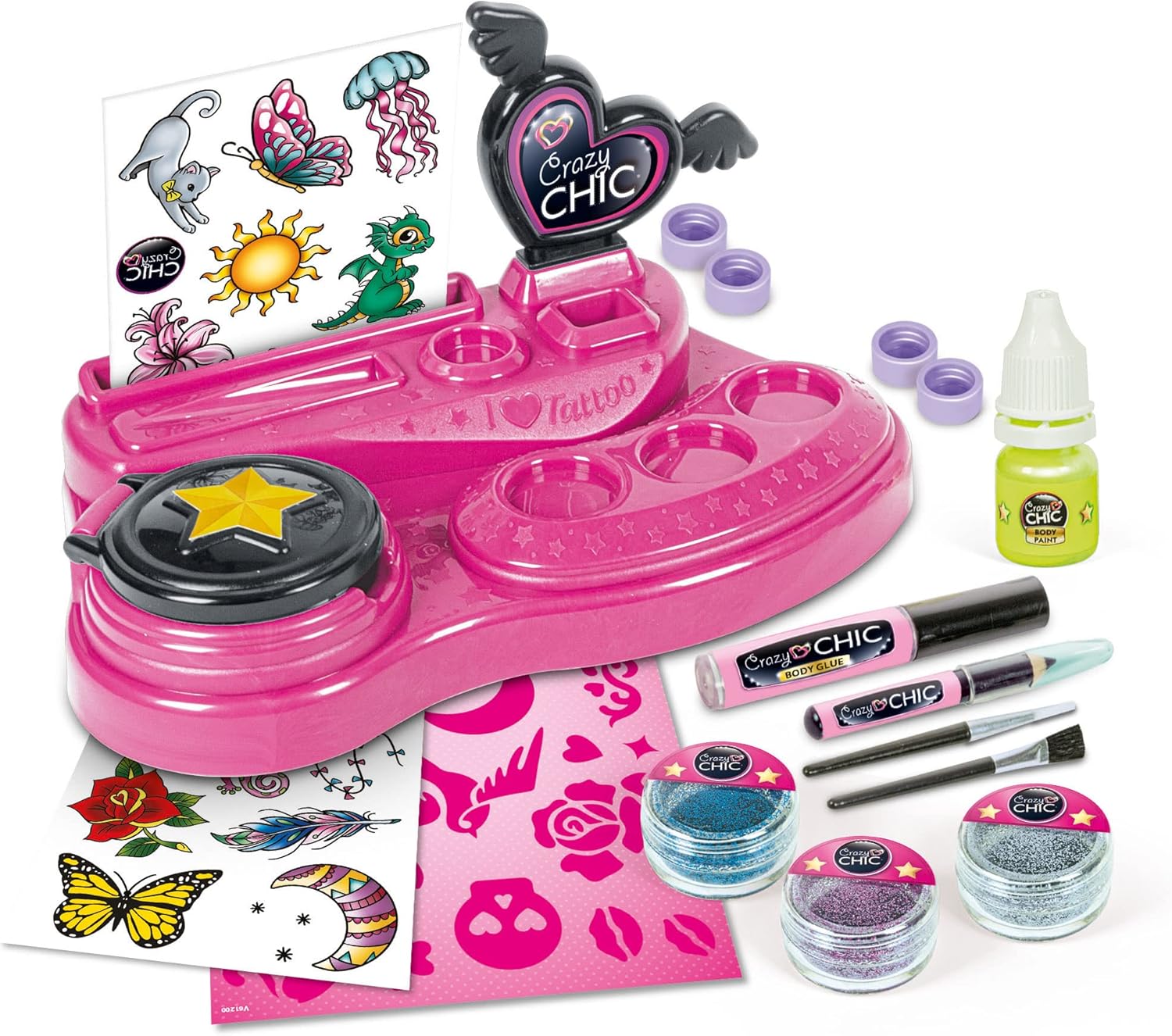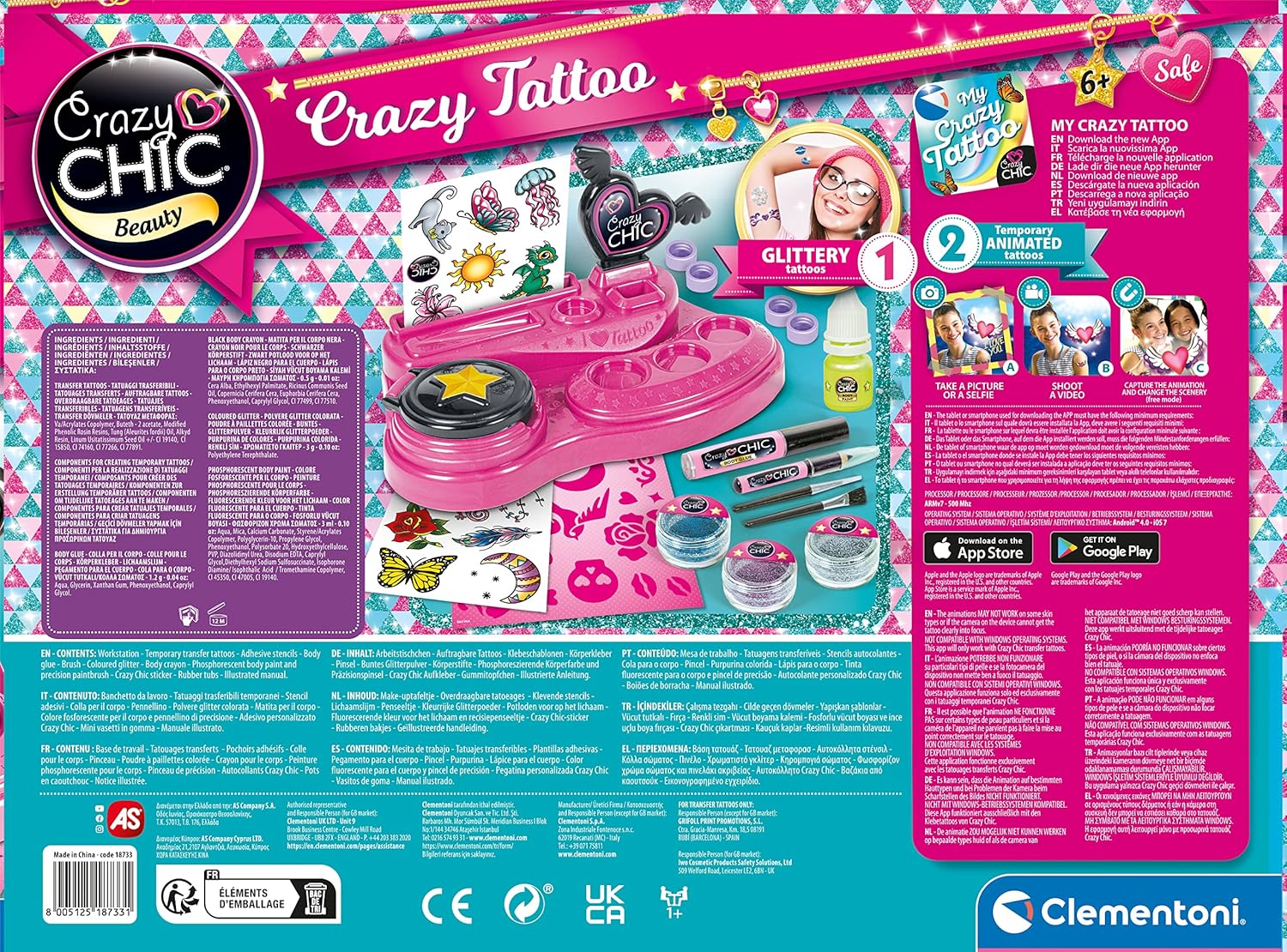CRAZY TATTOO: un kit completo per creare tatuaggi temporanei e glitterati per esprimere la propria creatività con disegni unici e scintillanti SFOGO ALLA CREATIVITÀ: i bambini creano i propri tatuaggi Glow in the Dark, sviluppando abilità manuali e immaginazione; con l'app, i tattoo diventano magicamente 3D, per fotografarli, personalizzarli e condividerli con gli amici attraverso i social COME GIOCARE: il set include tutto il necessario per realizzare tatuaggi temporanei in modo semplice e sicuro; basta scegliere uno stencil adesivo, applicare il colorante e il glitter, e personalizzare il tattoo con l’effetto glow in the dark DIVERTIMENTO PER BAMBINI: gioco creativo ideato, progettato e sviluppato in Italia per bambine dai 6 anni in su, include stencil adesivi, glitter colorati, colorante corpo Glow in the Dark, banchetto porta accessori e app dedicata per creare tatuaggi 3D CLEMENTONI CRAZY CHIC: una gamma di giochi creativi per esprimersi attraverso moda, makeup, tatuaggi e gioielli e sviluppare manualità e fantasia giocando