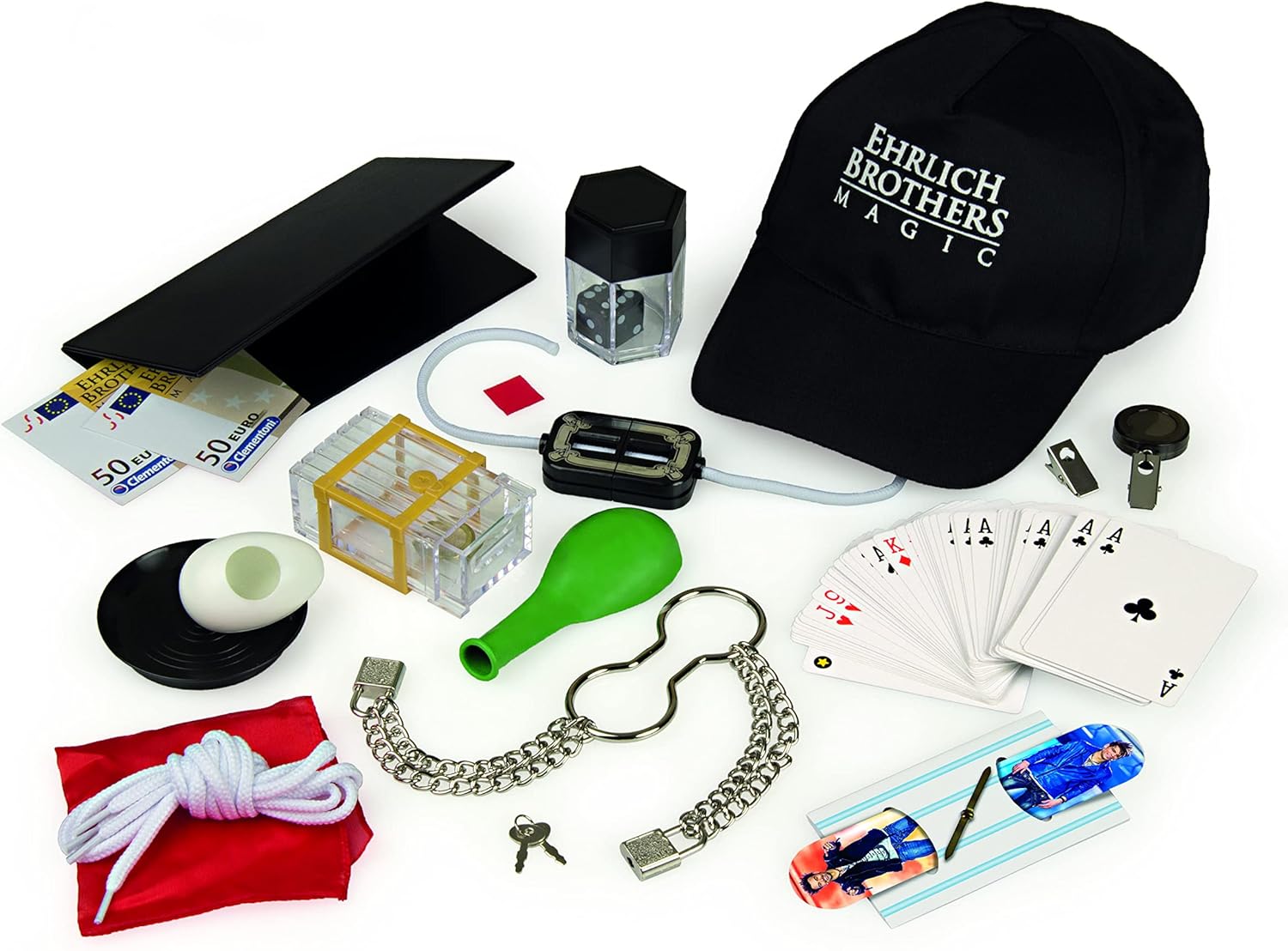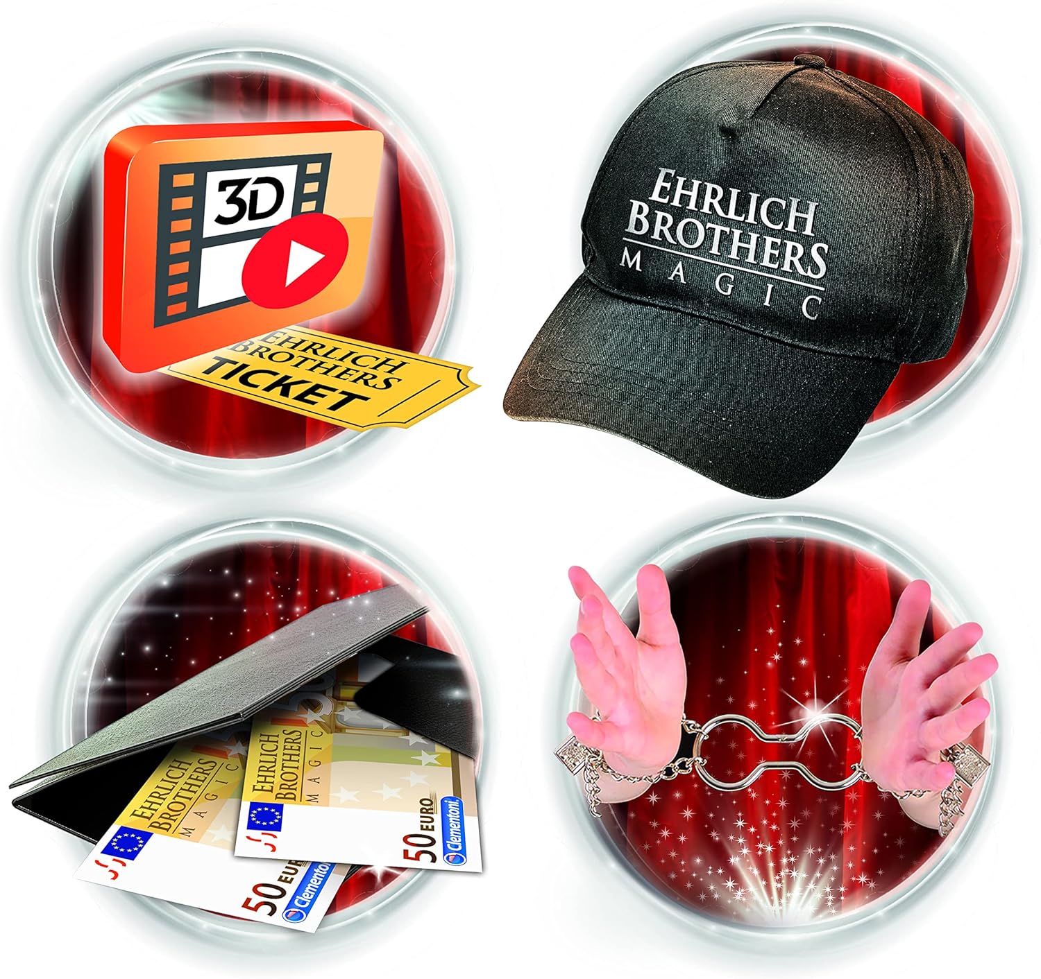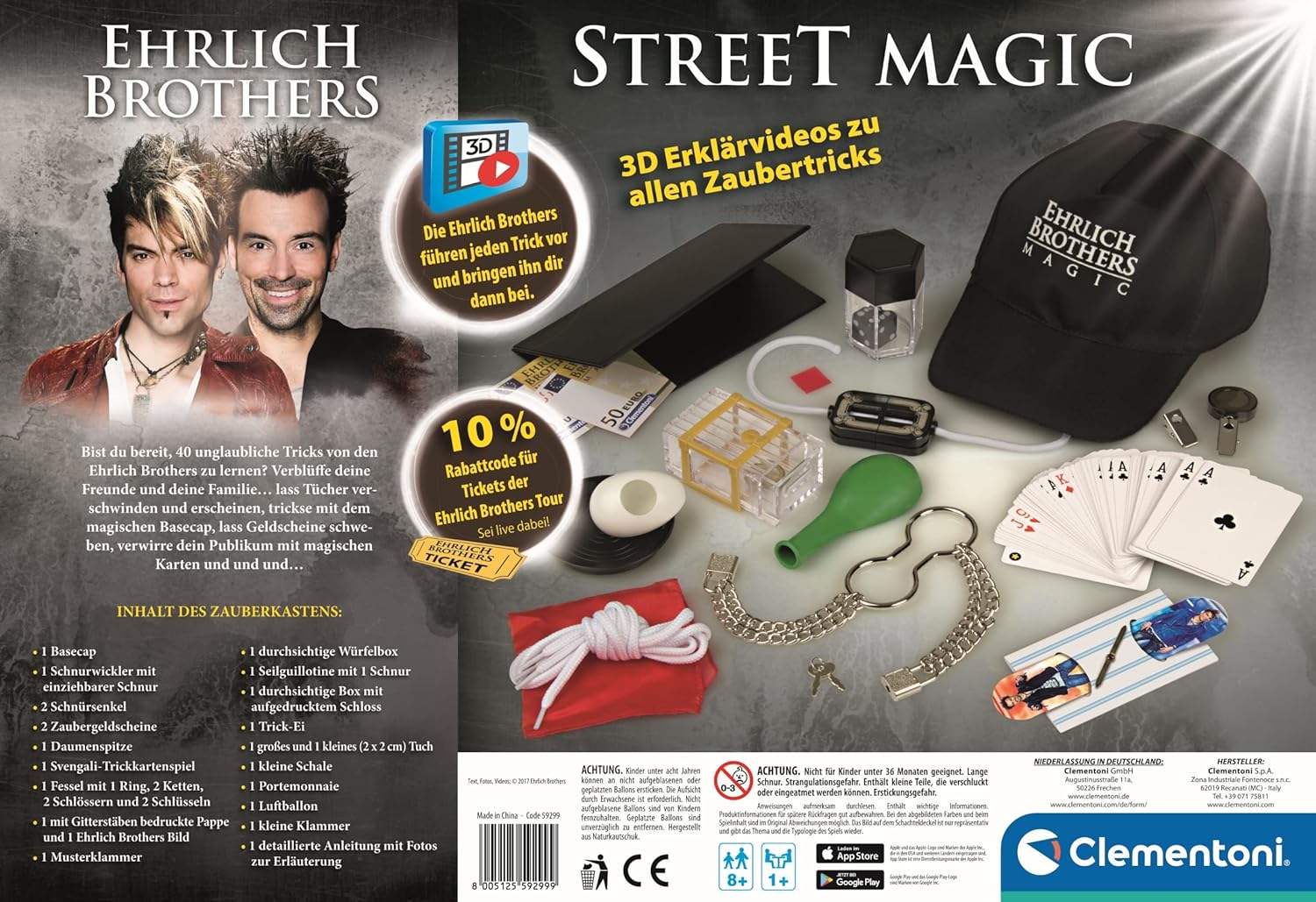 Immergetevi nel mondo delle illusioni: con questa scatola magica creativa il vostro bambino potrà dare un'occhiata dietro le quinte dei grandi maghi insieme ai fratelli Ehrlich e imparare i trucchi più sorprendenti. 40 spettacolari trucchi magici da fare a casa: che si tratti di un berretto da baseball magico, manette magiche, dadi che esplodono, un portafoglio magico, incredibili trucchi con le carte o molte altre manovre, impara a rendere possibile l'impossibile. Impara giocando: con istruzioni dettagliate e illustrate e istruzioni approfondite Con video 3D scaricabili, i fratelli Ehrlich insegnano personalmente ai tuoi bambini come fare la magia, allenando allo stesso tempo la loro destrezza e concentrazione. Lo spettacolo magico: in ogni cofanetto è contenuto un codice sconto del 10% per i biglietti per l'Ehrlich Brothers Tour Fascination, con i cui trucchi scenici vostro figlio potrà presto stupire passo dopo passo il proprio pubblico, i suoi amici e la sua famiglia. Fornitura: 1 x Ehrlich Brothers Street Magic, scatola magica per bambini dagli 8 anni in su della marca Clementoni - ideale anche come regalo per Pasqua, Natale o compleanno