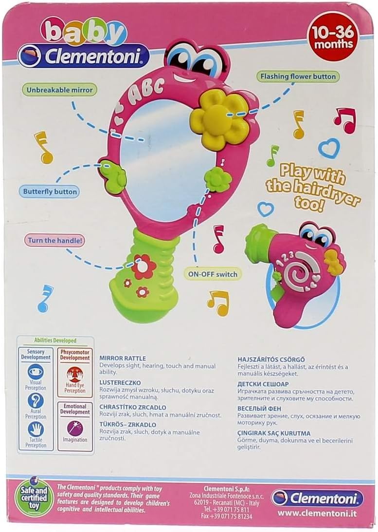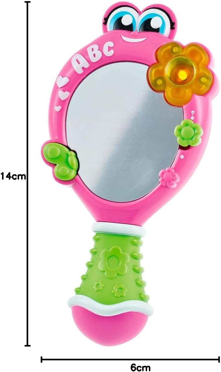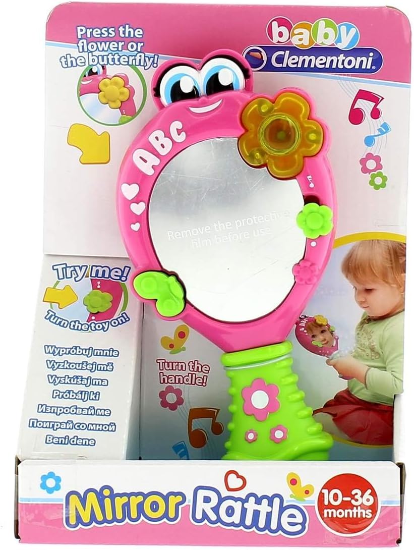 Un vero specchio elettronico: uno specchio amichevole e interattivo che riflette davvero l'immagine del bambino con musica e suoni. Interattivo ed elettronico con molte melodie. Adatto a bambini dai 10 mesi Lo specchio elettronico viene fornito completo di due pulsanti interattivi a forma di farfalla e un fiore. Giocattolo elettronico