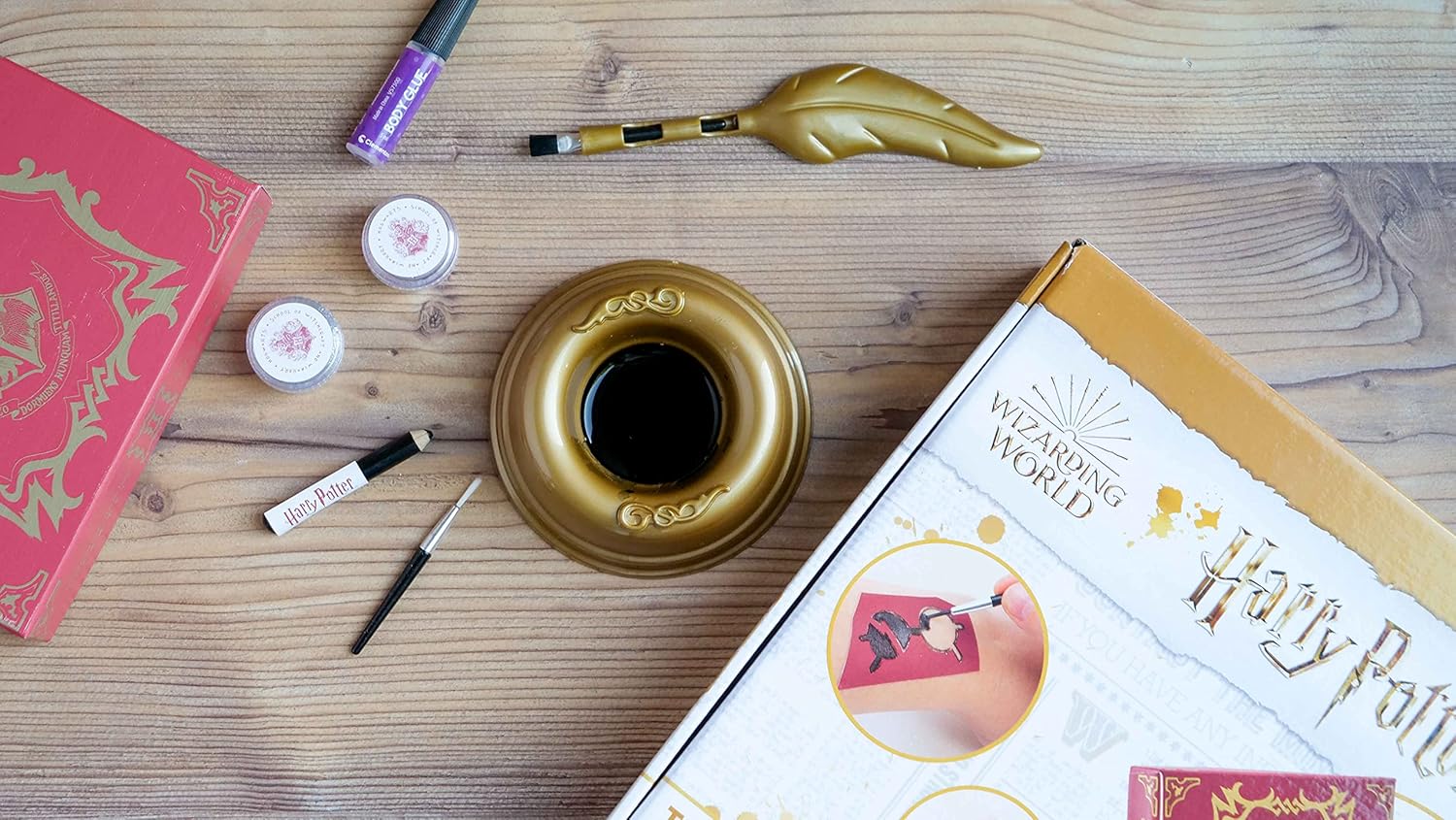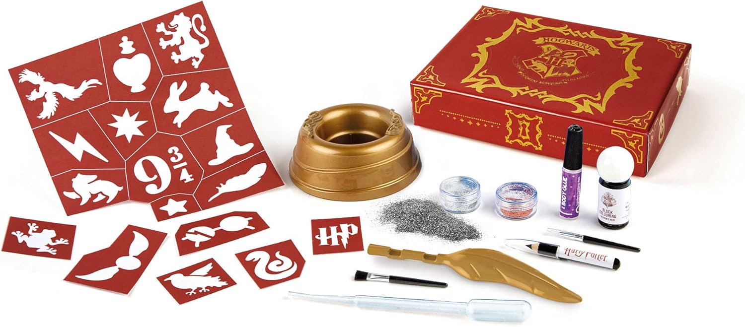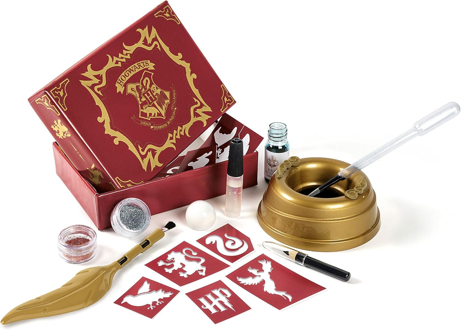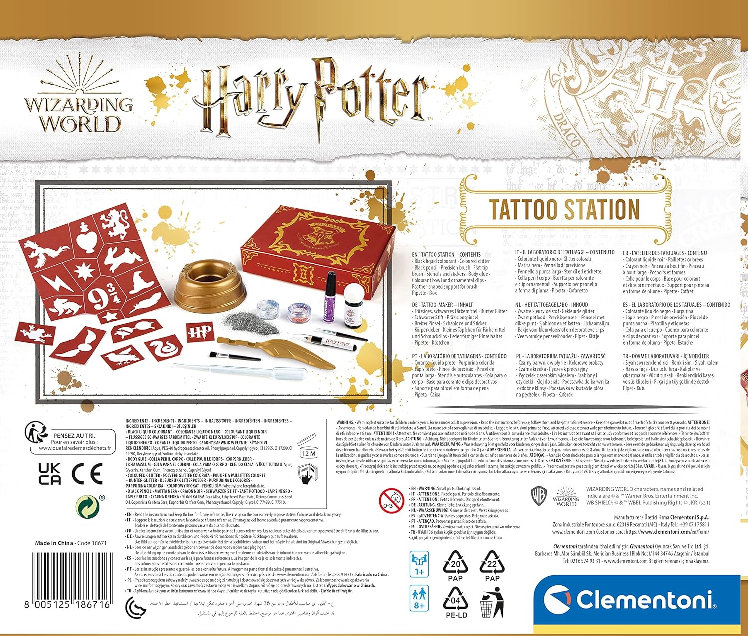 Uno scrittoio speciale con tutto l'occorrente per realizzare fantastici tatuaggi di Harry Potter! Contiene glitter, stencil, pennellino e matite per realizzare magici tatuaggi e vivere l'incanto di Harry Potter sulla pelle! Lo speciale pennellino a forma di piuma magica è perfetto per applicare la polvere di glitter sugli stencil e realizzare i propri tatuaggi personalizzati. Il pratico banchetto è pensato per riporre tutti i componenti del gioco. Un kit unico e divertente per sviluppare la propria creatività e divertirsi con la magia di Harry Potter! Un laboratorio di tatuaggi temporanei consigliato per bambini a partire dai 7 anni.