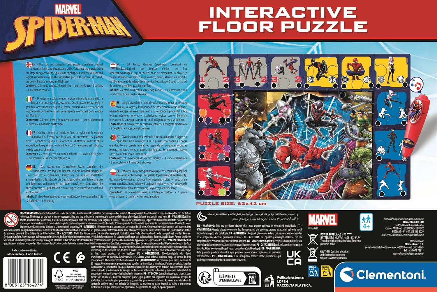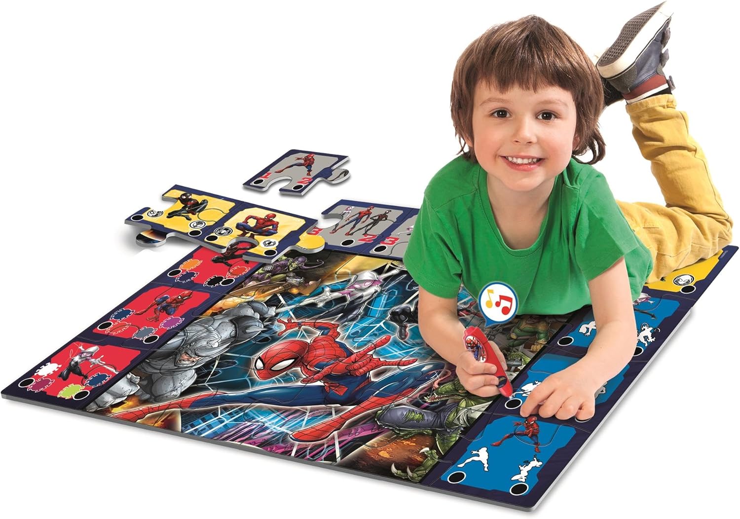 SPIDERMAN INTERACTIVE FLOOR PUZZLE: un divertente puzzle composto da 24 pezzi interattivi dedicato al cartone animato, con penna interattiva per rispondere ai fantastici quizi sui tuoi personaggi preferiti IMPARARE GIOCANDO: grazie alle attività interattive, i bambini possono sviluppare memoria, logica e manualità, scoprendo i temi tipici dell'età prescolare COME GIOCARE: screa il puzzle incastrando le grandi tessere e rispondi ai quiz su forme, numeri, colori e associazioni logiche con la penna interattiva; Se la risposta è corretta la penna suona e si illumina COSA CONTIENE: gioco educativo Made in Italy; adatto per bambini dai 3 anni in su, include un puzzle da 24 maxi tessere in cartone robusto, una Penna elettronica interattiva, 2 Adesivi e il Manuale di Istruzioni CLEMENTONI INTERACTIVE FLOOR PUZZLES: divertenti puzzle interattivi dedicati ai personaggi più amati dai bambini, per scoprire le nozioni del mondo prescolare attraverso diverse attività di gioco educative