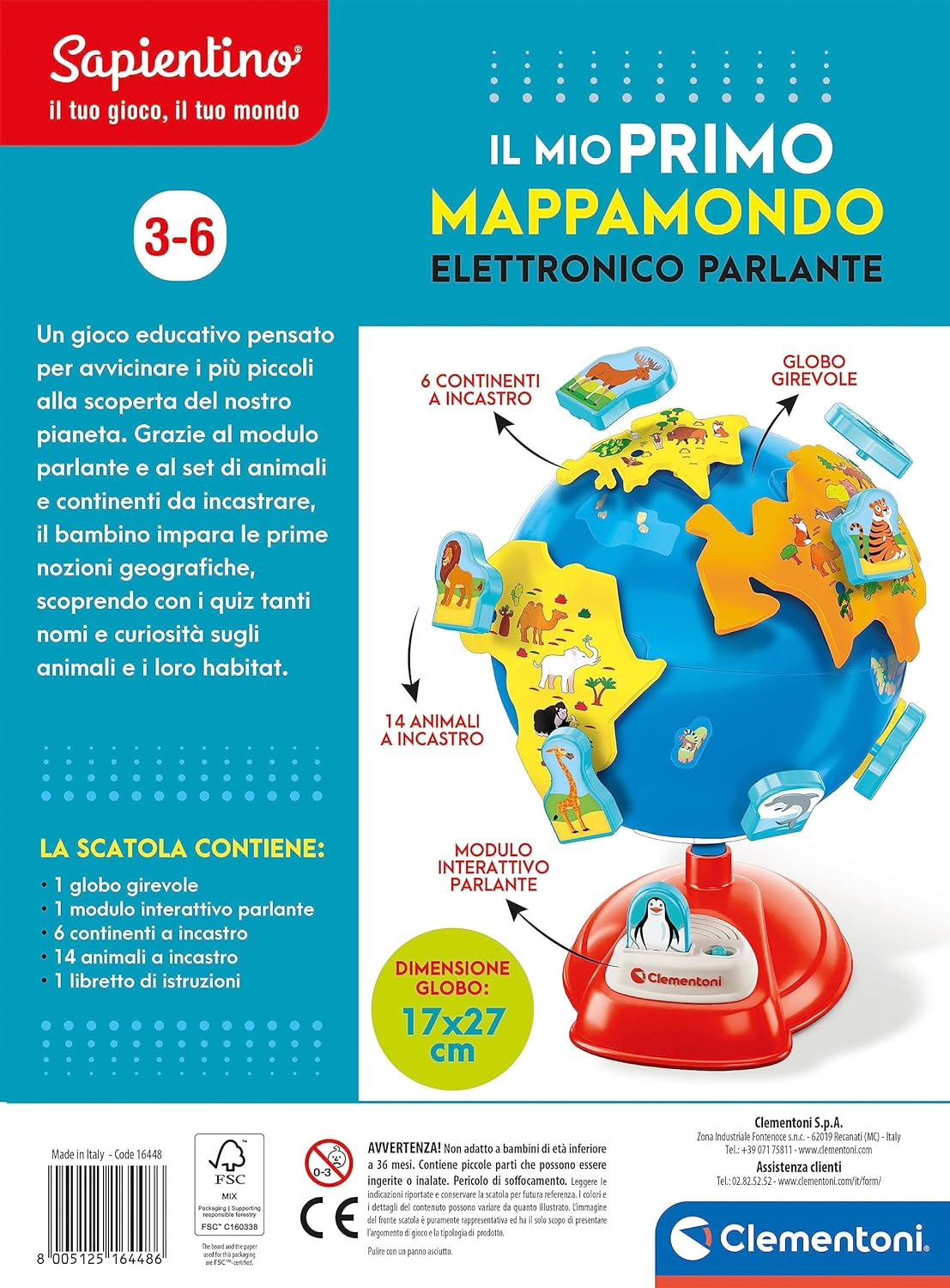 IL MIO PRIMO MAPPAMONDO: un globo elettronico parlante realizzato in plastica riciclata, che permette ai bambini di scoprire animali e continenti; un’avventura educativa che stimola la curiosità e l’apprendimento attraverso il gioco interattivo IMPARARE GIOCANDO: il mappamondo introduce i bambini ai primi concetti di geografia e al mondo degli animali; le attività di inserimento e associazione sviluppano capacità cognitive e sensoriali in modo ludico e coinvolgente COME GIOCARE: i bambini incastrano continenti e animali nel mappamondo, inserendo questi ultimi nel modulo elettronico per scoprire informazioni sugli habitat; il gioco propone quiz stimolanti, rendendo l'apprendimento intuitivo e divertente COSA CONTIENE: gioco educativo Sapientino Made in Italy; adatto per bambini dai 3 ai 6 anni, include un globo girevole, modulo interattivo parlante, 6 continenti e 14 animali a incastro, oltre a un libretto di istruzioni CLEMENTONI SAPIENTINO: divertenti giochi educativi su animali, parole, numeri, colori e emozioni, per stimolare e supportare il bambino durante la crescita, offrendo strumenti per un apprendimento efficace e interattivo in ogni fase dello sviluppo