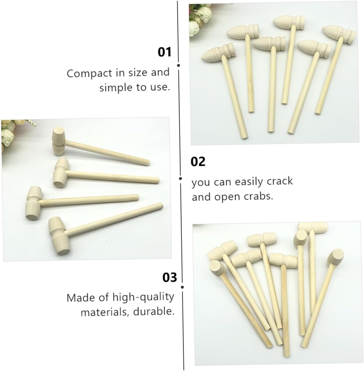 Giocattolo martello: 24 martelli per granchio realizzati in solido legno duro naturale, che possono essere utilizzati a lungo e in grado di soddisfare le esigenze di riunioni di famiglia e riunioni di frutti di mare. Mini giocattoli per bambini con martello da granchio: i mini martelli in legno massiccio ti aiutano ad aprire il guscio duro di vari frutti di mare e a gustare cibi deliziosi. Martello per torta in legno: compatto nelle dimensioni e facile da usare, apre comodamente il guscio duro dei frutti di mare e ti aiuta a gustare facilmente cibi deliziosi, martello per frutti di mare Martelli per aragosta in legno: questi martelli in legno possono essere utilizzati anche come giocattoli per bambini e accessori fai-da-te. martello per frutti di mare Questi martelli per aragoste sono facili da pulire. Dopo l'uso, lavare semplicemente a mano con acqua tiepida e sapone. Suggerimento: mantenere il martello asciutto ne prolungherà la durata. martello di granchio, martello di frutti di mare