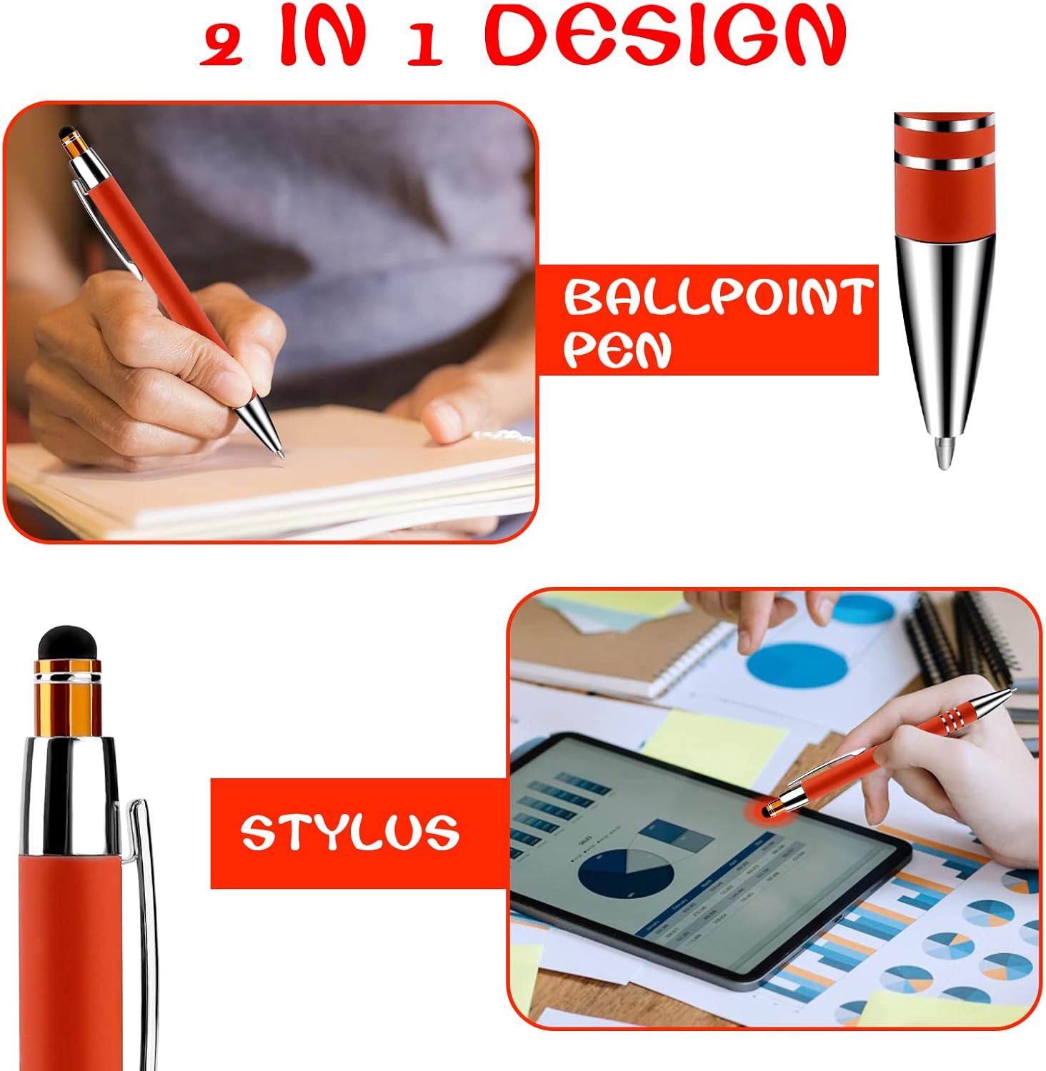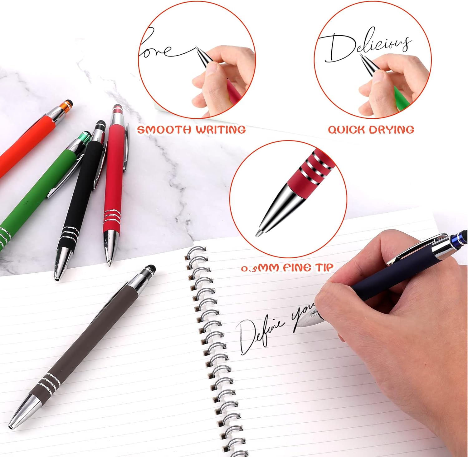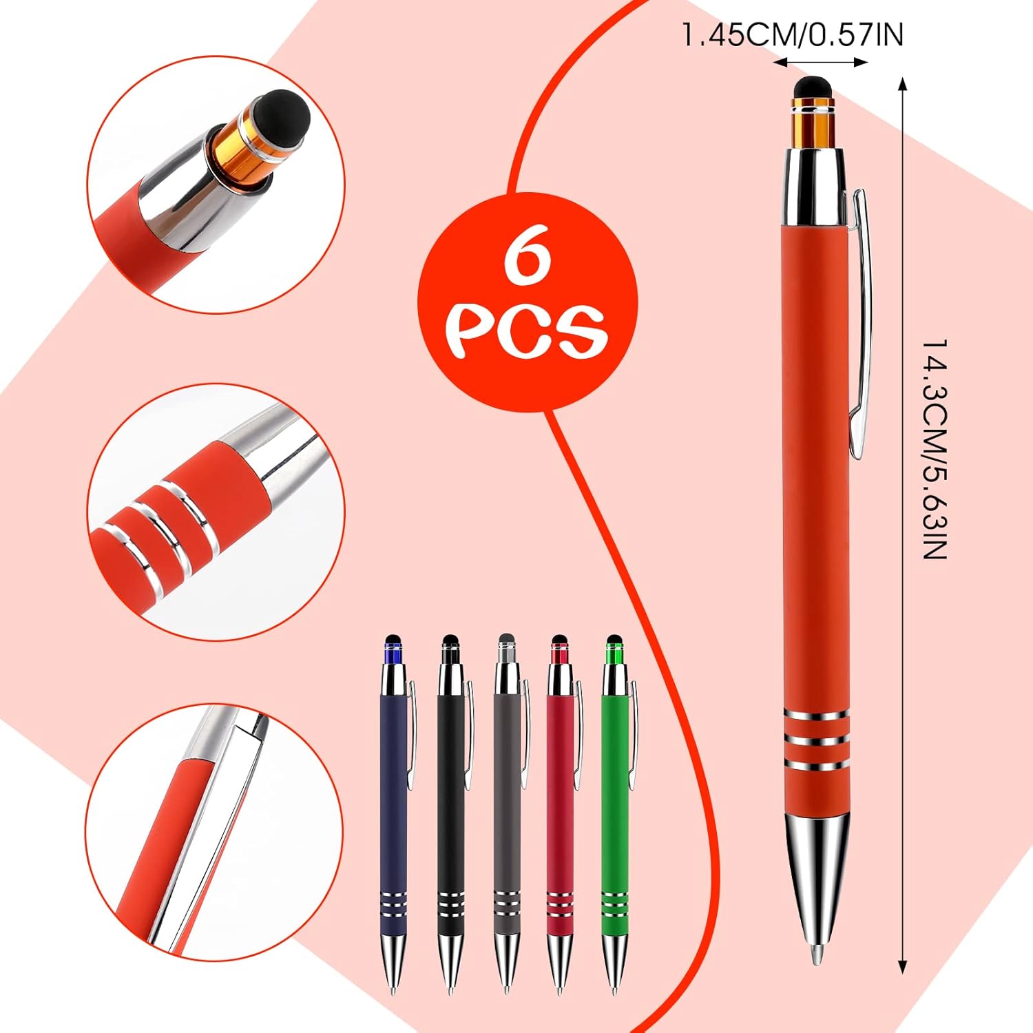 Penna a sfera con punta stilo: la confezione include 6 penne a sfera retrattili colorate con punta stilo per touch screen. È possibile utilizzare queste simpatiche penne per prendere appunti su carta e sullo schermo del telefono o del tablet. Il design a doppio anello dell'impugnatura può aumentare la forza di attrito e impedirti di cadere quando lo afferri. Scrittura liscia: la penna a sfera a inchiostro nero ha un pennino composto da proiettili da 1 mm, che rende la penna a sfera facile da scrivere e assicura un'esperienza di scrittura o disegno incredibilmente liscia e intensa; scrive senza intoppi sulla maggior parte delle superfici ed è eccellente per l'uso quotidiano. Alta qualità: il corpo sottile della penna è realizzato in alluminio robusto, durevole e resistente. La finitura opaca del fusto rende la bella penna a sfera molto unica e di fascia alta, e l'interno del corpo della penna utilizza una molla elastica, assicurando che ogni pressa possa avere un'induzione. Facile da trasportare: il comodo design a clip può agganciare saldamente la penna a sfera retrattile a un libro, un taccuino o una borsa, facile da trasportare, senza preoccuparsi di perdere; design retrattile, premere delicatamente il cappuccio e l'estremità della penna si ritrae automaticamente. Regalo delicato: queste penne per strumenti da scrittura sono un regalo perfetto per il tavolo del libro degli ospiti in occasione di convegni, fiere, feste e molto altro ancora. Perfetto per scuola, ufficio e uso familiare.