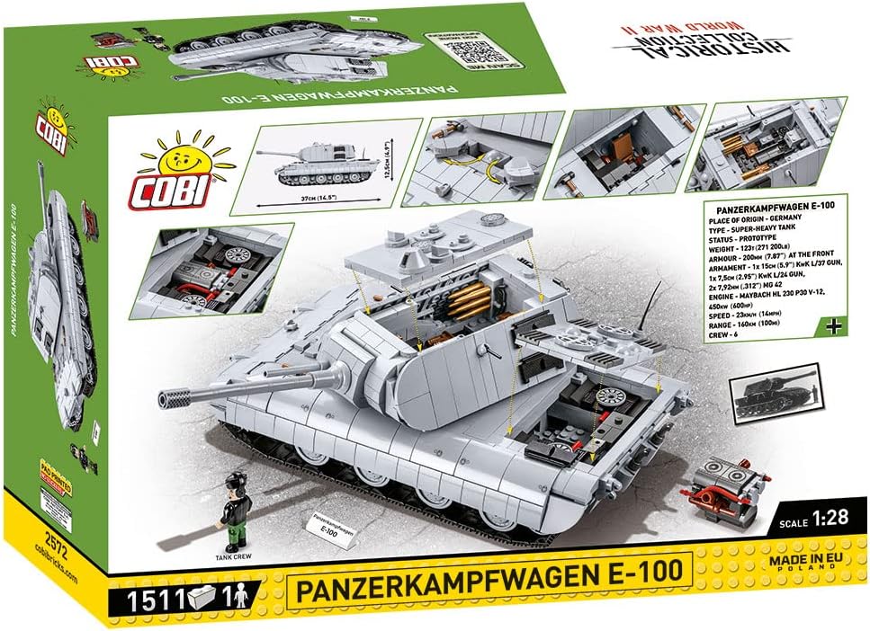 Questa edizione del PANZERKAMPFWAGEN E-100 è stata sviluppata in scala 1:28 da 1.677 elementi e misura ben 37 cm di lunghezza; le dimensioni del modello hanno reso possibile la progettazione degli interni della torretta e del veicolo Il modello consente di accedere al portello di servizio, sotto il quale si trova un motore rimovibile Ulteriori caratteristiche sono: torretta rotante, cannone mobile, accesso ai portelli per l'equipaggio, trazione a catena funzionante; inoltre, comprende 5 figure con accessori. È inclusa una figura femminile; le altre figure comprendono un carrista, un soldato popolare, un soldato in una rara mimetica a fogliame con stampa posteriore e un colonnello; il set include un supporto firmato per un motore a blocco staccabile
