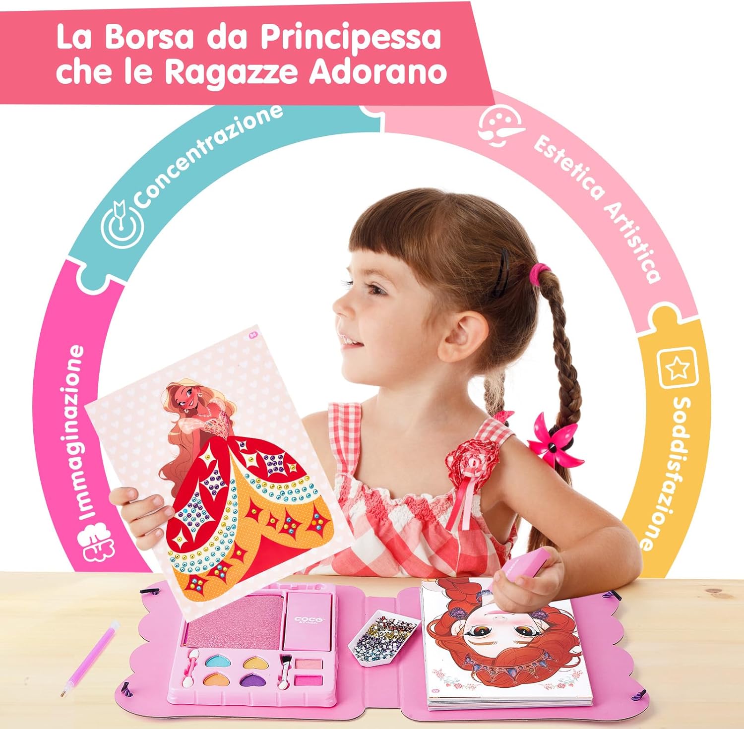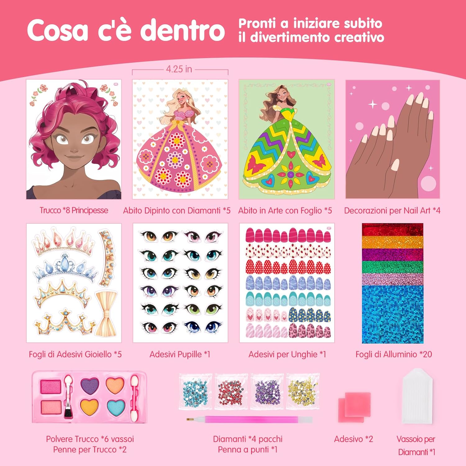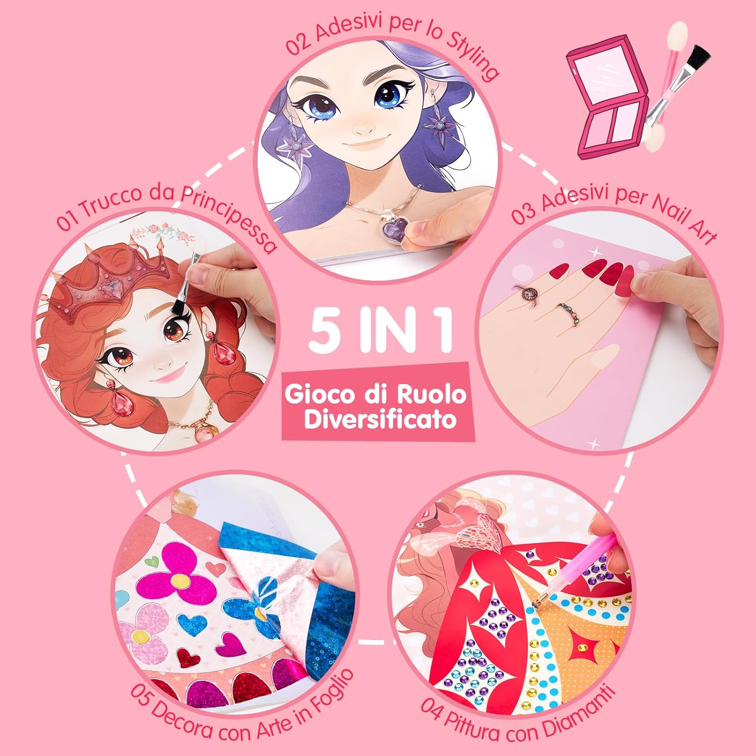 👑【5-in-1 Gioco di Ruolo Creativo】I bambini utilizzano strumenti e accessori per il trucco abbinati per vestire diversi personaggi sul cartone, come ombretti, ciglia, fard, extension per ciglia, lenti a contatto, accessori, ecc. Adesivi con diamanti, carta glitterata, ecc. Lascia che la tua bambina esplori cinque ruoli entusiasmanti: truccatrice, stilista, designer di moda, manicure e costumistaVesti il tuo personaggio per simulare un vera esperienza di travestimento. 🎨【Intrattenimento e istruzione】Include 29 fogli di carta, 4 pacchi di diamanti, 1 vassoio di diamanti, una penna a punti, 6 vassoi di polvere per il trucco, 2 penne per il trucco e 20 fogli di foglio di alluminio, tanti accessori per i bambini per migliorare la loro creatività e l'abilità pratica è di grande importanza educativa affinché i bambini diventino adolescenti. ✨【Progettazione fai da te】I kit fai-da-te possono aiutare i bambini ad alleviare lo stress, aumentare la fiducia in se stessi, regolare le emozioni, sviluppare le capacità artistiche, la pazienza, l'attenzione e la coordinazione visiva dei bambini e arricchire l'immaginazione dei bambini. 🚗【Portatile per i viaggi】Le dimensioni sono 24*24*3,6 cm, dotate di corde facili da trasportare su entrambe le estremità. Perfetto per un intrattenimento tranquillo durante i viaggi in auto, mantenendo attive le manine e i cervelletti in movimento. Perfetto come regalo di compleanno o di Natale per una bambina di 5 anni, promuove lo sviluppo delle abilità senza causare confusione, rumore o tempo trascorso davanti allo schermo. 🎁【Regali originali】Questo set per lo styling magico della principessa è un regalo perfetto per aiutare le ragazze a imparare a truccarsi, stimolare la creatività e l'immaginazione dei bambini ed è adatto a bambini di età superiore a 5 anni per imparare.