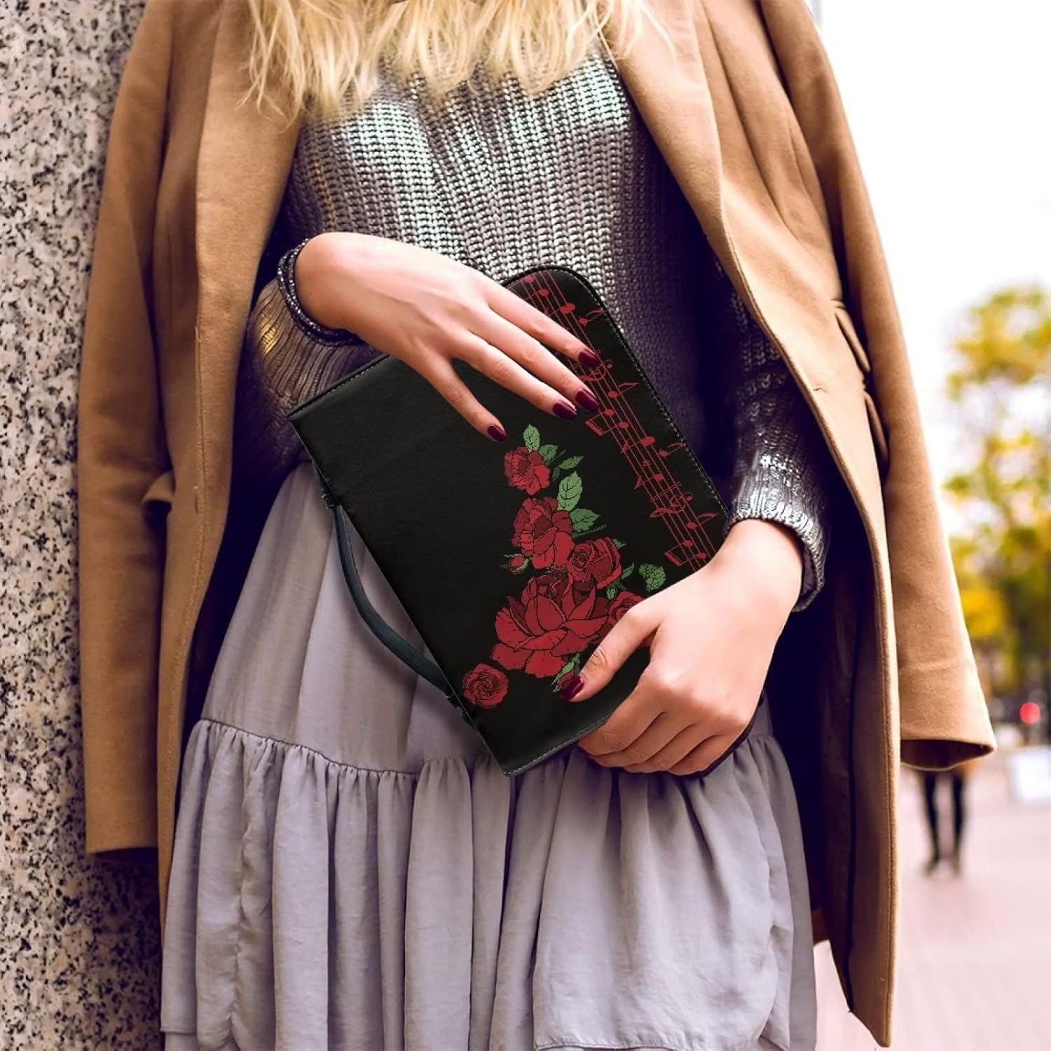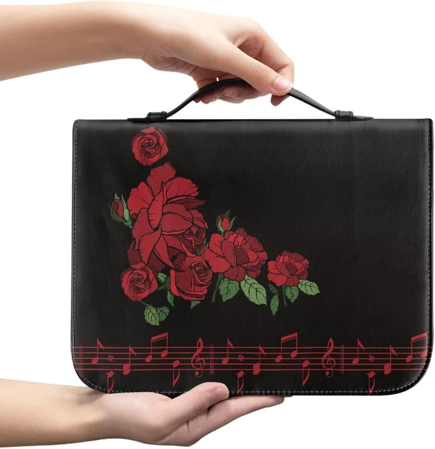 COEQINE Copertina della Bibbia con stampa di rose Copertina in pelle con manici, Copertina di libro in pelle con stampa musicale con scomparto per cellulare per chiesa Taglia L