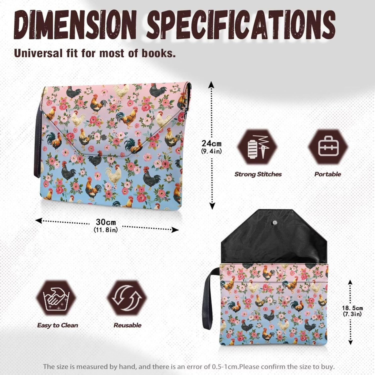 Dimensioni: 30 x 24 cm. Questa borsa per libri non solo può proteggere i tuoi libri di testo, libri, ma anche contenere alcuni dei tuoi articoli di cancelleria. Può essere utilizzato anche come astuccio per penne, custodia per cellulare, trousse per trucchi, portamonete e così via. ✿ Aggiungi tasca organizer: la tasca frontale della custodia per libri ha ancora una tasca organizer aggiuntiva, perfetta per riporre quaderni, piccoli diari, articoli di cancelleria e anche alcuni piccoli accessori decorativi Protezione completa per libri: questa è una copertina leggera e robusta con doppia fibbia con due scomparti interni, c'è molto spazio per proteggere i libri dalla piegatura. E la copertina del libro viene fornita con pulsanti e una maniglia per il trasporto, più comoda da trasportare. amanti dei libri. Pratico e funzionale: la robusta tracolla della copertina per libri lo rende più facile da trasportare, la chiusura a bottone rende i tuoi libri e altri oggetti più sicuri, e il tessuto in poliestere a doppio strato rende la copertina più robusta, rendendola facile da pulire e riutilizzare. Perfetta per i viaggi: bello e leggero per adattarsi al tuo libro quando sei in viaggio, il design ad arco della copertina protegge meglio il libro, molto comodo per gli amanti dei libri che vogliono leggere in viaggio ma sono preoccupati che il loro libro si danneggi.