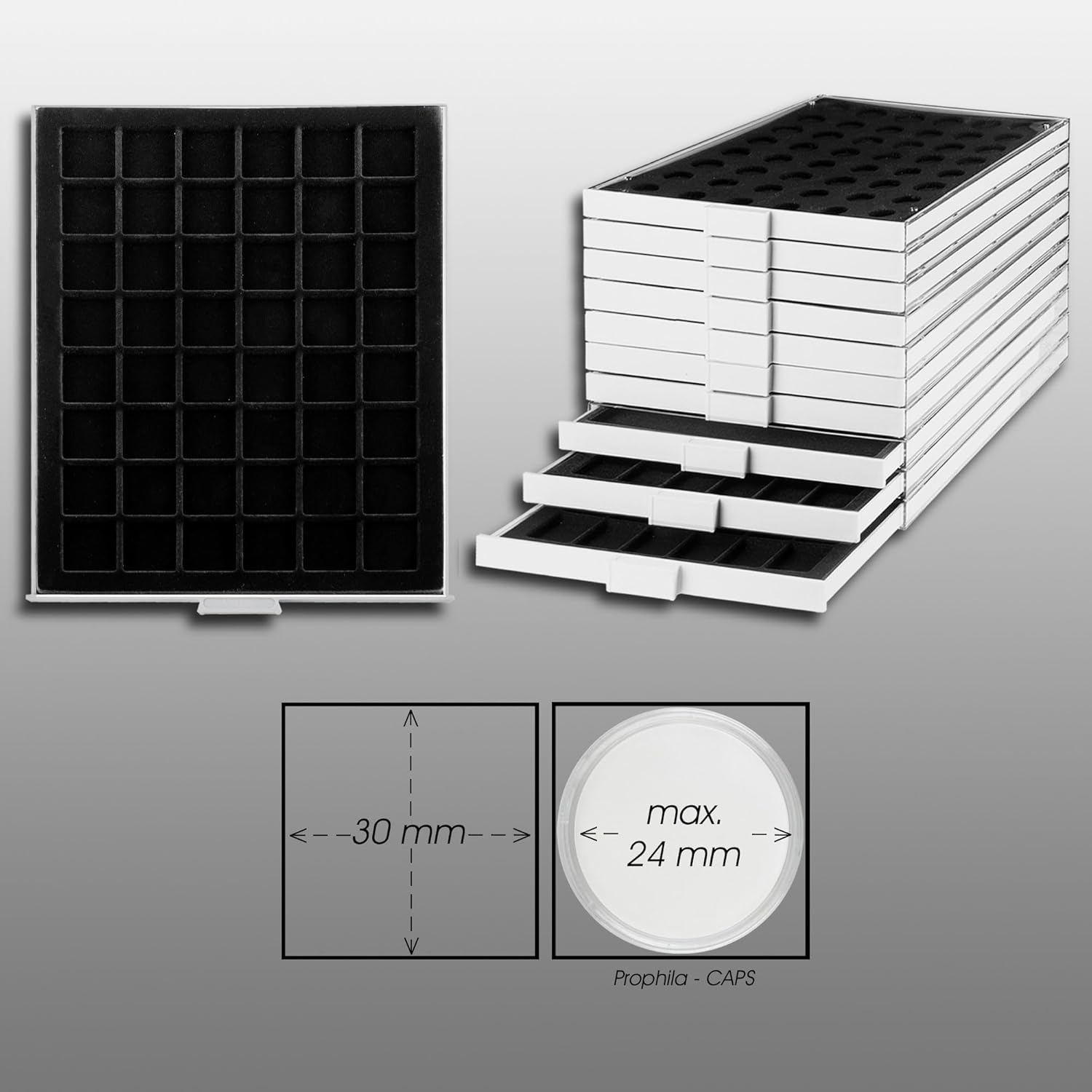 Portamonete con struttura in plastica trasparente, inserto in plastica grigia (cassetto) e inserto in velluto nero con 48 scomparti angolari. Adatto per monete fino ad un diametro di 30 millimetri (1 Oz. Canada/Maple Leaf Gold). Formato: 237 x 296 x 22 mm. Completamente combinabile con Leuchtturm, Lindner ...