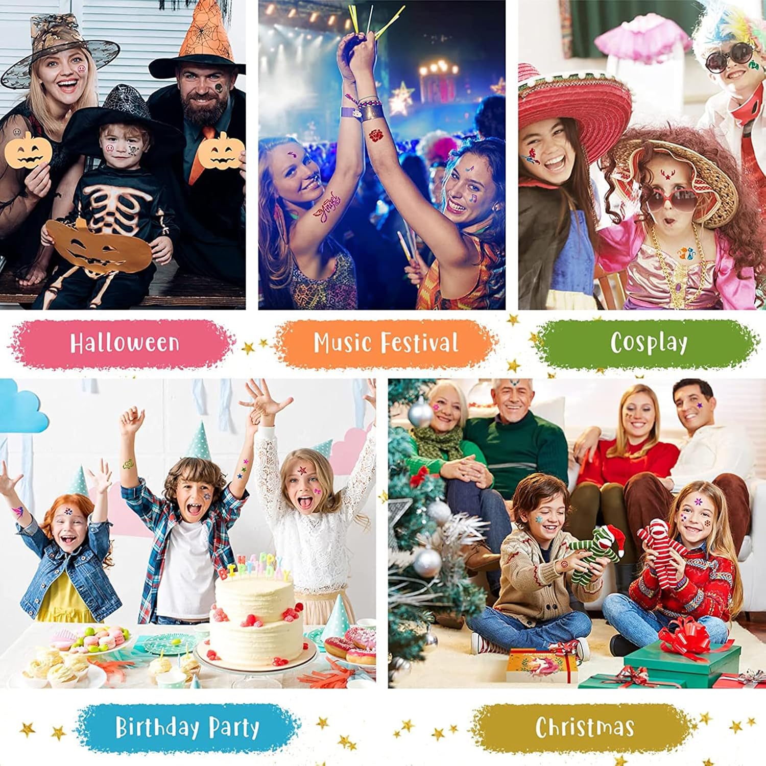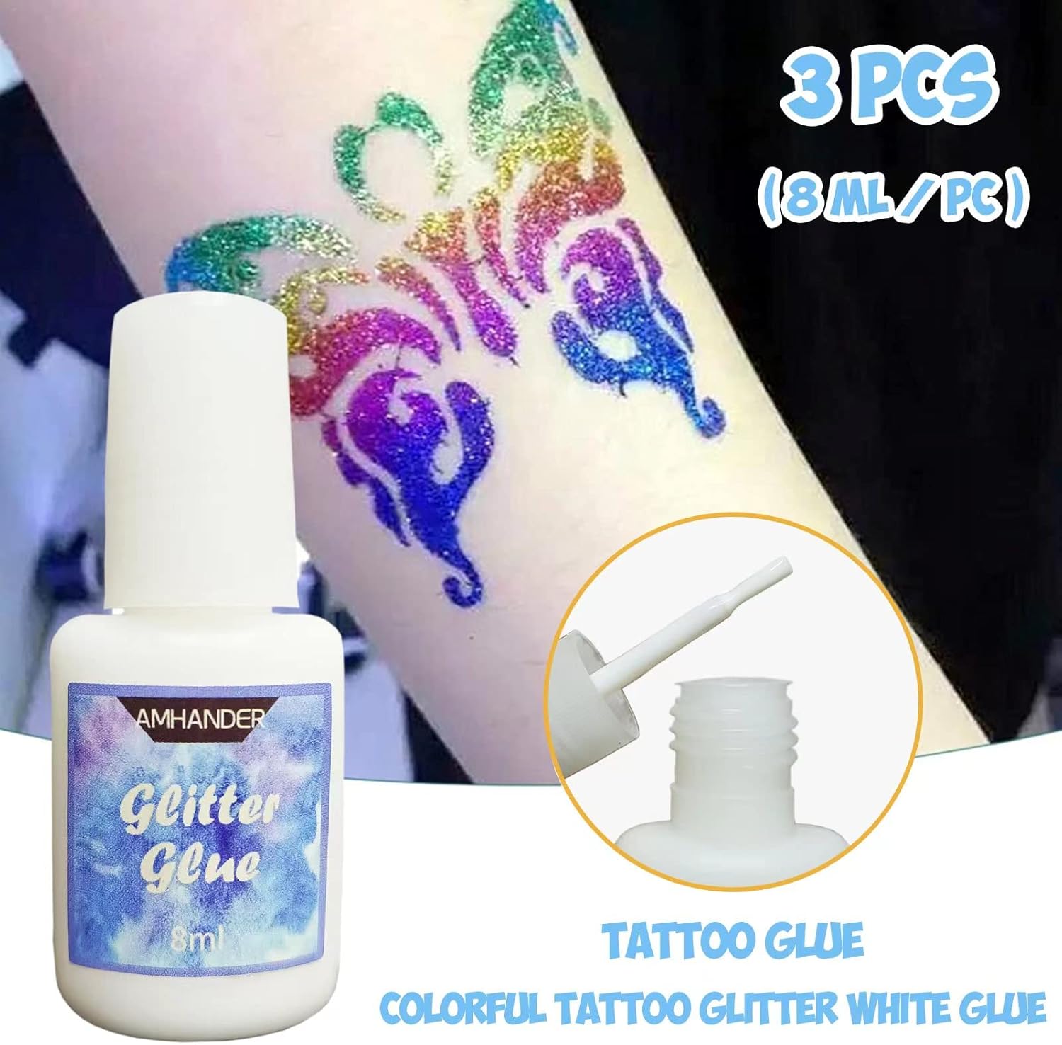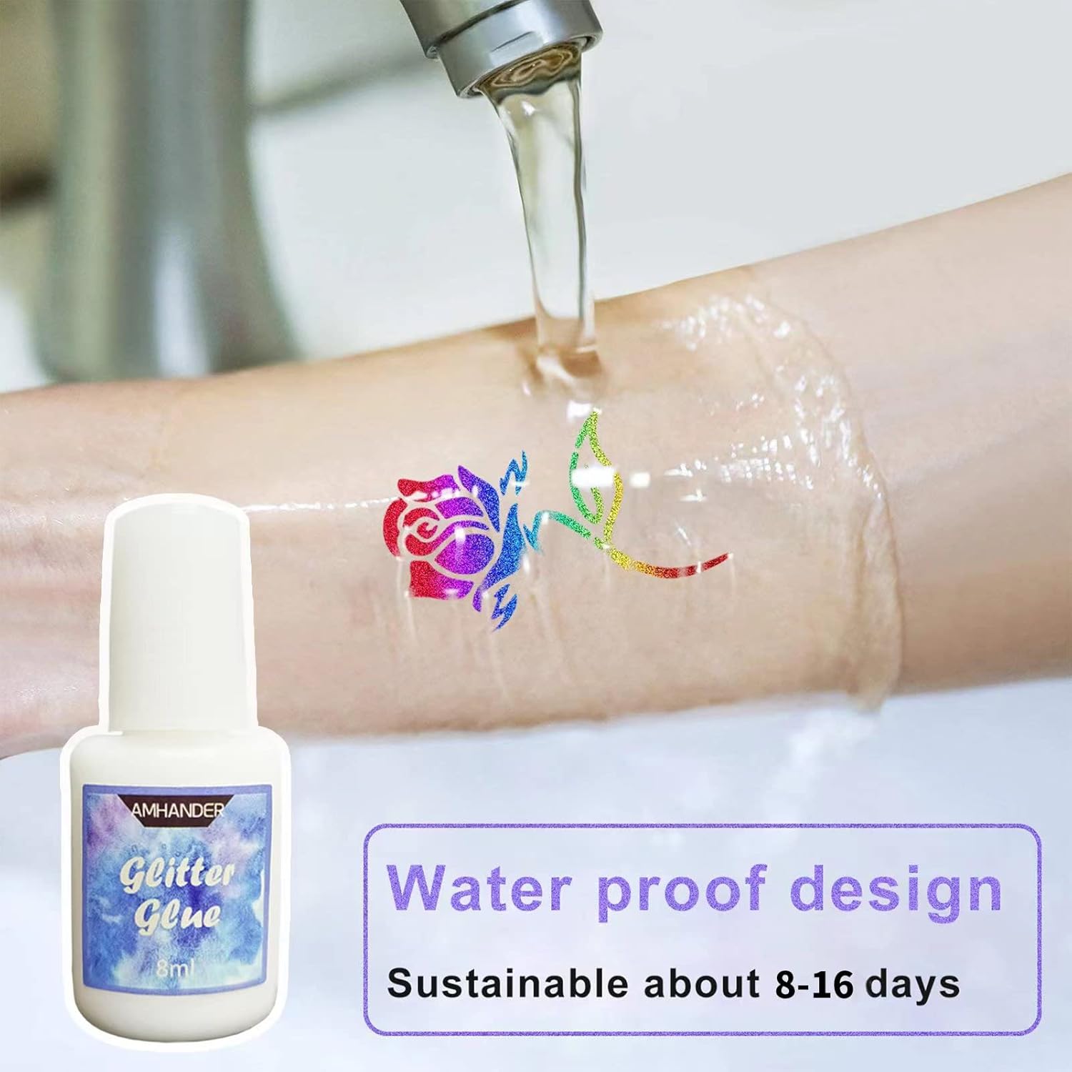 Safty: colla delicata per la pelle a base d'acqua in flacone con pennello da 8 ml, molto facile da usare. (Total 4 pezzi) Ampio utilizzo: la colla glitterata è ideale per incollare oggetti leggeri, come glitter, strass, piume e simili. Ideale per Halloween, carnevale, feste a tema, eventi in costume e make-up. Istruzioni per l'uso: applicare uno strato molto sottile di colla sulle zone della pelle esposte dallo stencil. Attendere (circa 2 minuti), fino a quando la colla diventa trasparente prima di applicare l'oggetto. Facile da pulire: impermeabile (colla per il corpo); dura 8-16 giorni. (Può essere lavato con acqua saponata delicata) Bastano fino a 270 tatuaggi glitterati (8 ml x 4); una volta aperto durano almeno 12 mesi.