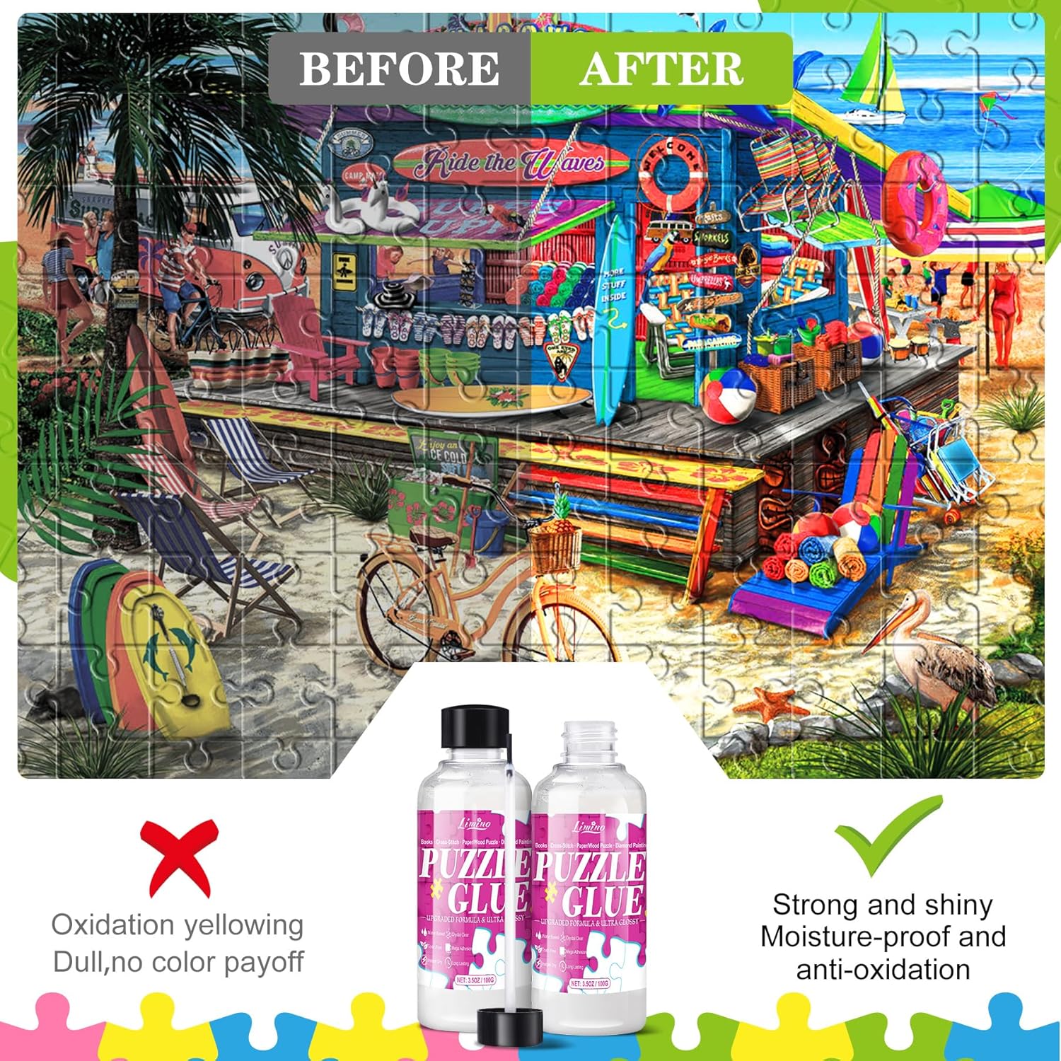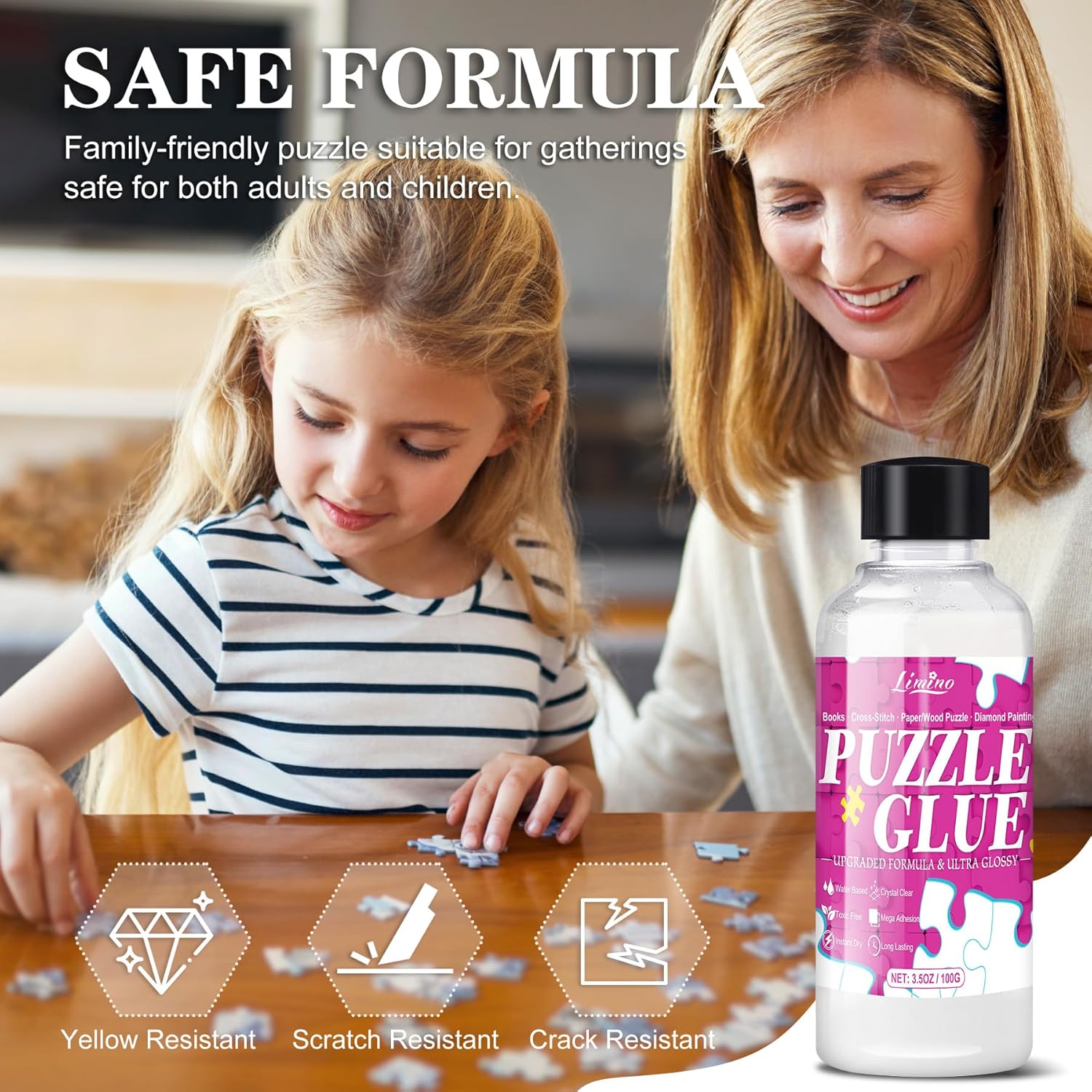 SUPERFICIE CRISTALLINA - Rivestimento trasparente con un aspetto liscio e lucido. Il sigillante per puzzle protegge perfettamente la grafica del tuo puzzle, migliora i colori e mantiene un aspetto cristallino e duraturo senza ingiallimento. Protegge da polvere e umidità, mantenendo il tuo puzzle immacolato e trasformandolo in un capolavoro senza tempo. ADESIONE FORTE E DI LUNGA DURATA – Non dovrai più preoccuparti di parti allentate o sparse. La nostra colla penetra negli spazi tra i pezzi del puzzle e forma un legame forte e permanente che impedisce deformazioni o arricciamenti. Protegge in modo affidabile la vostra opera d'arte e la preserva come opera d'arte permanente. Adatto a vari materiali tra cui carta, legno e persino puzzle con pittura a diamante. NON TOSSICO E SICURO - Una formula a base d'acqua delicata, non tossica e facile da pulire con acqua. Sicuro per anziani, adulti e bambini, ideale per attività familiari insieme. Una parte essenziale per rafforzare i legami tra famiglia e amici. FACILE DA USARE - Il nostro kit di assemblaggio puzzle include 2 flaconi di colla con applicatori di precisione e 2 pennelli aggiuntivi. Innanzitutto, utilizza l'applicatore di precisione per correggere gli spazi tra i pezzi del puzzle. Quindi applicare la colla in modo uniforme sulla superficie con il pennello. La colla si asciuga in 1-2 ore (si consigliano 2-3 mani per risultati ottimali). La colla di grande capacità è adatta per puzzle da 1000/3000/5000 pezzi. SERVIZIO CLIENTI SENZA PREOCCUPAZIONI - La nostra colla per puzzle ti dà la tranquillità di preservare ed esporre con orgoglio il tuo capolavoro. Se hai domande o problemi con la nostra colla trasparente per puzzle, contattaci: ti offriremo soluzioni professionali e soddisfacenti.