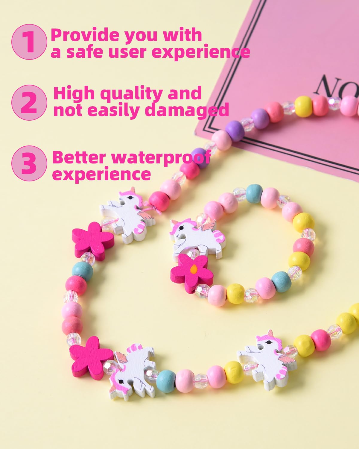 Materiale: Realizzato con perline e legno di alta qualità, comodo e sicuro Il design dell'unicorno arcobaleno è colorato e affascinante, adatto a diversi outfit Ogni set include 1 collana e 1 braccialetto coordinato La misura si adatta alla maggior parte dei polsi delle persone Inoltre, è infrangibile e facile da indossare e togliere, quindi puoi indossarlo e toglierlo facilmente Il braccialetto colorato può essere utilizzato in molte occasioni ed è perfetto come regalo per i bambini Può essere utilizzato anche a casa, per strada, in spiaggia estiva, nella vita di tutti i giorni ecc. Può essere utilizzato