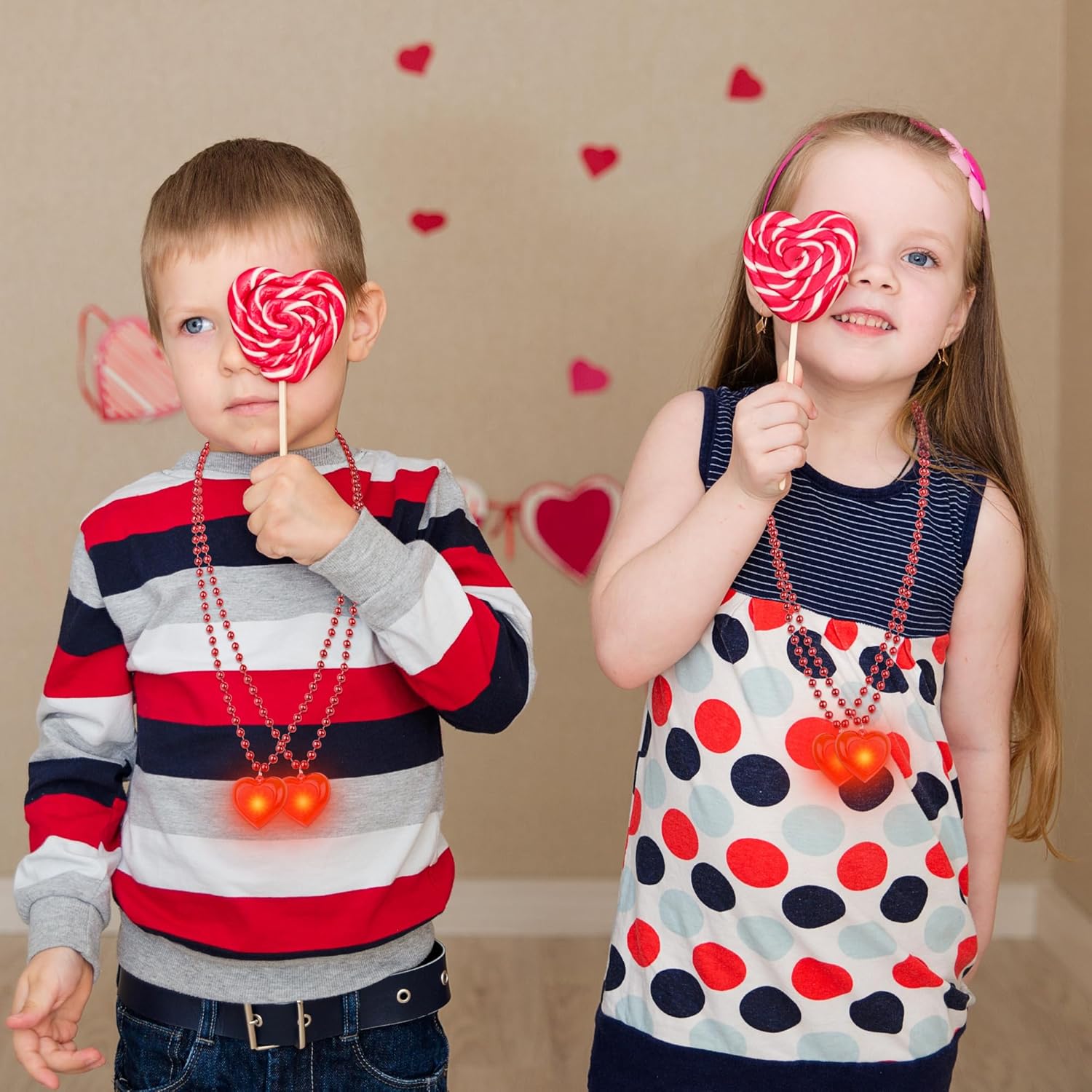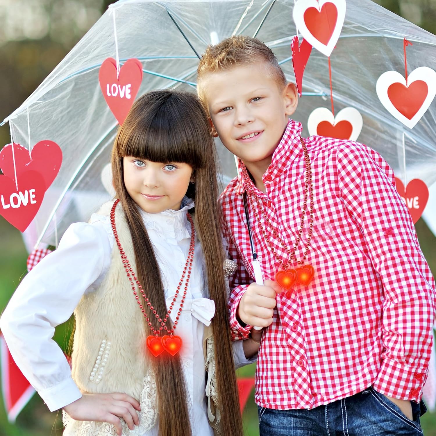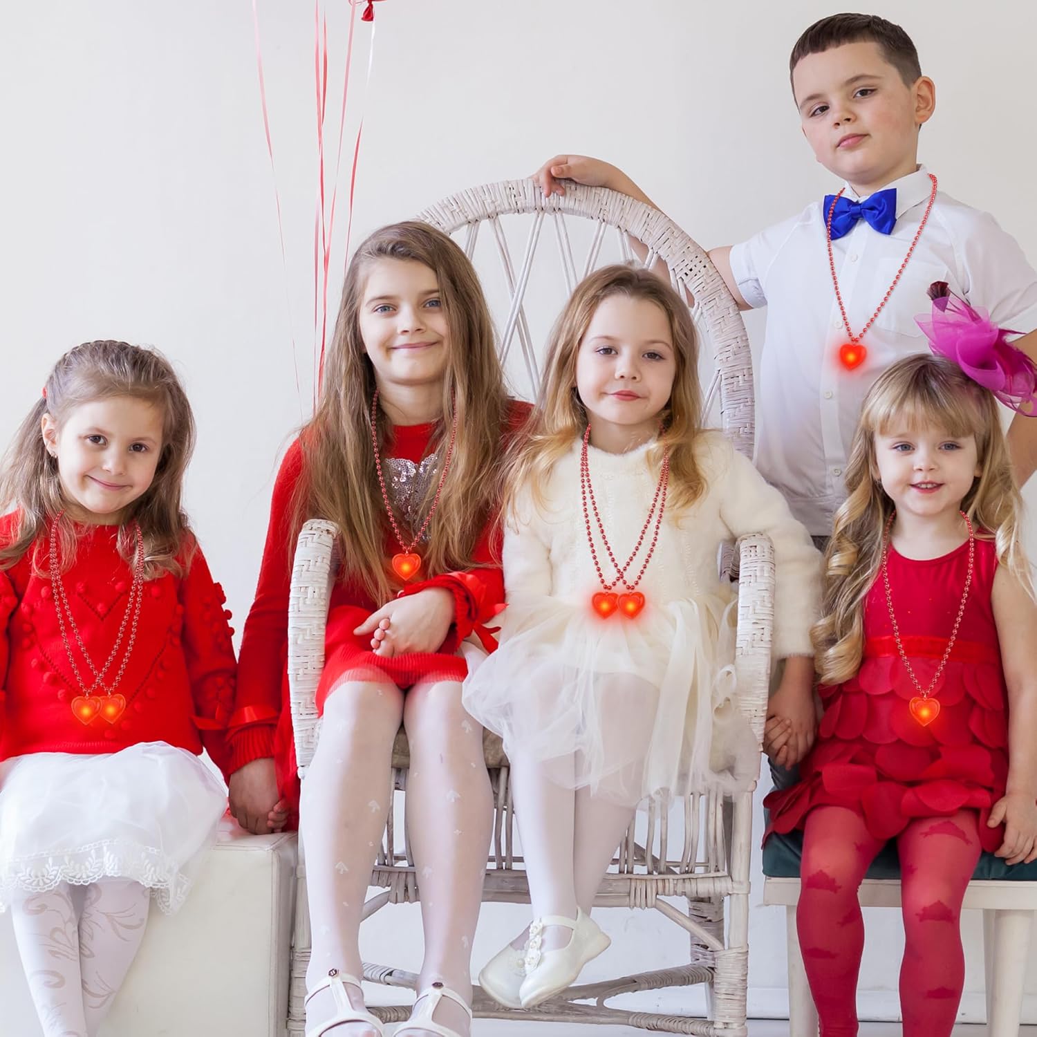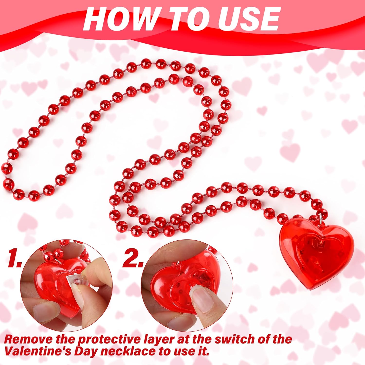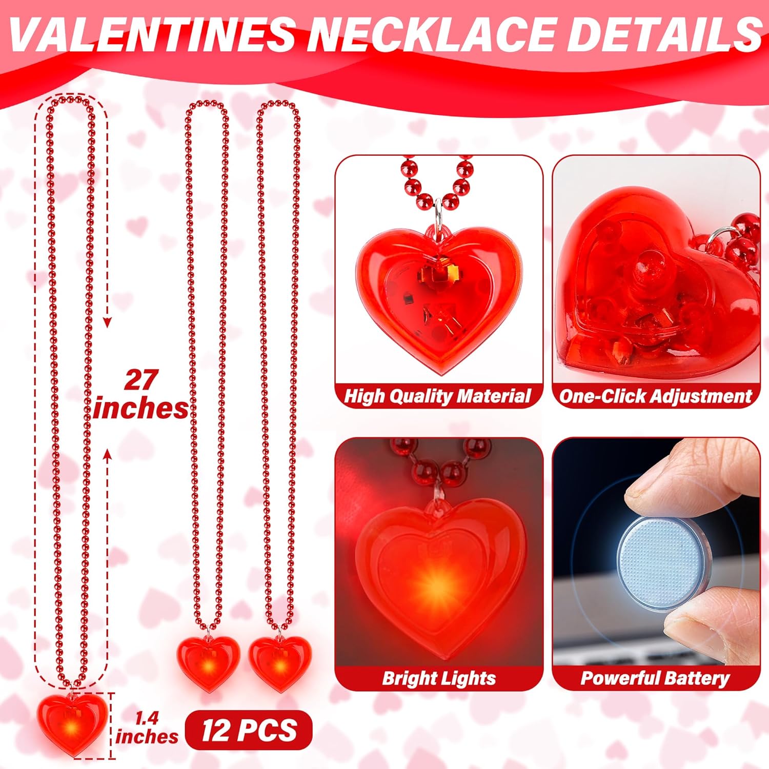 Il pacchetto include: Ogni ordine contiene 12 delle nostre affascinanti collane a cuore. Illumina il tuo San Valentino con questi adorabili accessori fosforescenti. QUALITÀ ECCELLENTE - Realizzate in resistente PVC e filo di rame, le nostre luci a forma di cuore sono progettate per garantire sicurezza e durata. Sono perfetti per chi li indossa dai 3 anni in su. Impostazioni di luce regolabili: con luci scintillanti, la nostra collana di San Valentino aggiungerà un tocco magico alle tue celebrazioni. Scegli tra una varietà di modalità di illuminazione per creare l'atmosfera ideale. CIONDOLO MULTIUSO: Ideale per feste per bambini, attività in classe o come adorabile regalo di scambio, questa collana versatile diffonde gioia ed eccitazione ovunque venga indossata. VESTIBILITÀ IDEALE - Con una comoda lunghezza di 27 pollici, la nostra collana è progettata per adattarsi a tutti. Immergiti nello spirito festivo e lascia risplendere il tuo amore. Età: da 3 anni