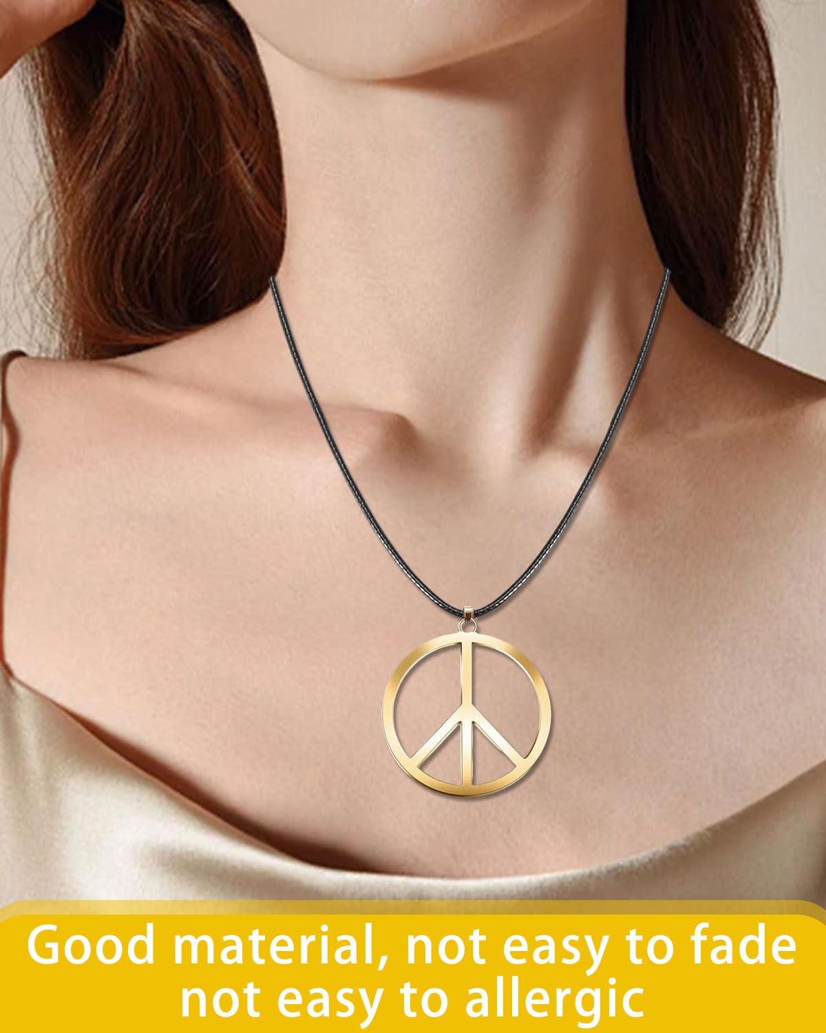 La confezione include: Riceverai una collana dorata con il simbolo della pace, il ciondolo è lungo circa 28 cm/11,02 pollici e il simbolo della pace ha un diametro di circa 3,2 cm/1,26 pollici. Materiali di alta qualità: la collana hippie è realizzata in acciaio inossidabile di alta qualità, leggero, non sbiadisce e non si danneggia facilmente, durevole e riutilizzabile, per offrirti un'esperienza di utilizzo confortevole. Design unico: la collana della pace è dotata di un ciondolo con il simbolo della pace, la sua luce abbagliante può renderti il centro dell'attenzione a qualsiasi festa. La catena nera in dotazione con la collana della pace è regolabile in modo da poterla indossare e togliere facilmente. FACILE DA ABBINARE: la collana Peace Hippie è attualmente uno stile classico e popolare che può essere abbinato a qualsiasi tipo di abbigliamento, ad esempio. Ad esempio, camicie tie-dye, pantaloni, gilet con frange, fasce per capelli, occhiali da sole o altri capi casual possono aggiungere fascino personale e un tocco di stile al tuo look. Occasioni applicabili: la collana hippie della pace è adatta a uomini, donne, adolescenti e bambini ed è un ottimo accessorio per carnevale, costumi vintage, feste in maschera, festival musicali, abbigliamento quotidiano, costumi hippie, feste a tema, Halloween, feste di Natale, feste scolastiche e altri festival e occasioni.