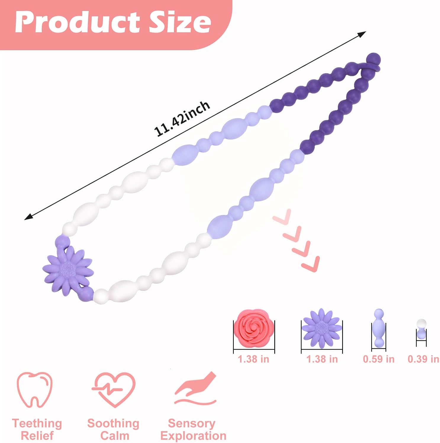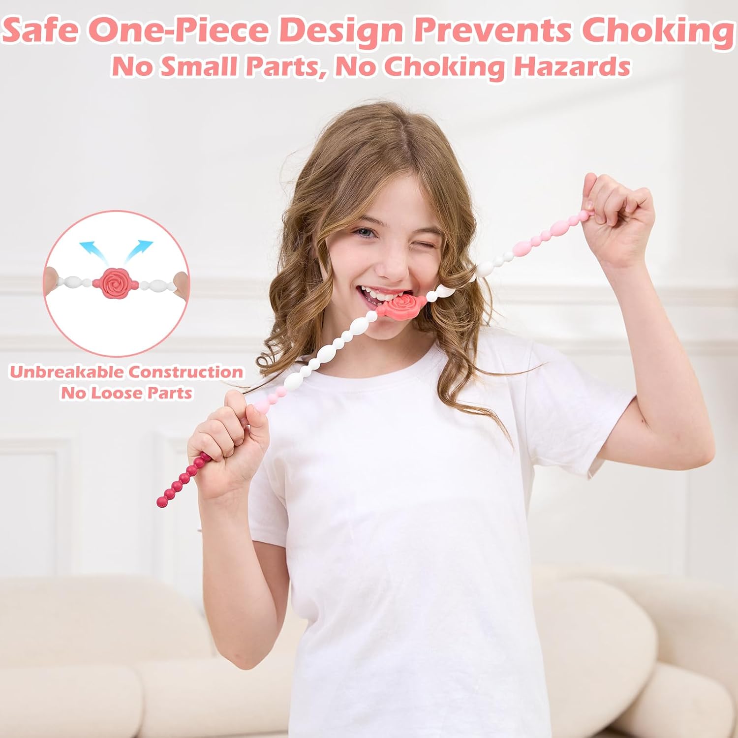 Design monopezzo a forma di fiore: questo set presenta due collane da masticare a forma di fiore dal design accattivante, una con motivo a rosa e l'altra con un design a margherita. Il design monopezzo garantisce la sicurezza eliminando le piccole parti senza rischi di soffocamento Supporta le esigenze sensoriali e la concentrazione: queste collane sono progettate per soddisfare le esigenze sensoriali e aiutare a migliorare la concentrazione. Forniscono un'alternativa sicura e calmante all'abitudine di mordere unghie, capelli, vestiti o penne, riducendo l'agitazione e promuovendo la concentrazione durante attività come i compiti scolastici o il tempo di gioco Sollievo dallo stress e dall'ansia: appositamente progettato per persone con autismo, ADHD e ansia, aiuta ad alleviare lo stress e l'ansia. Forniscono uno sbocco rilassante per agitarsi, offrendo sollievo e comfort durante i momenti di tensione, promuovendo uno stato calmo e concentrato sia per bambini che per adulti Lunghezza regolabile per una vestibilità personalizzata: la chiusura regolabile consente di personalizzare la collana alla lunghezza perfetta, garantendo comfort e facilità d'uso sia per bambini che per genitori. Ideale per le mamme che allattano, fornisce una vestibilità sicura e personalizzata durante le sessioni di allattamento al seno Facili da pulire e durevoli: realizzate in silicone alimentare di alta qualità, queste collane per dentizione possono essere facilmente risciacquate con acqua o messe in lavastoviglie per una pulizia senza sforzo, rendendo la manutenzione rapida e semplice per i genitori