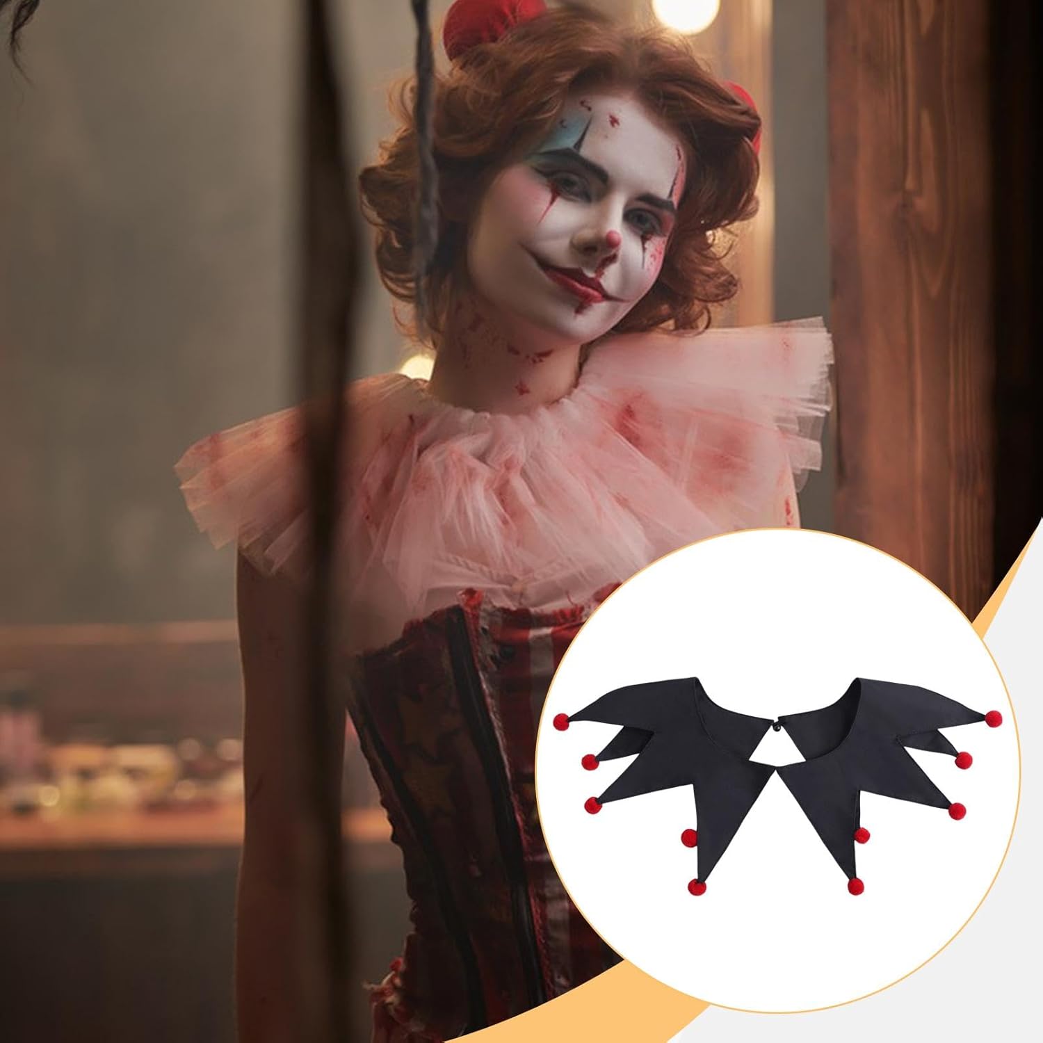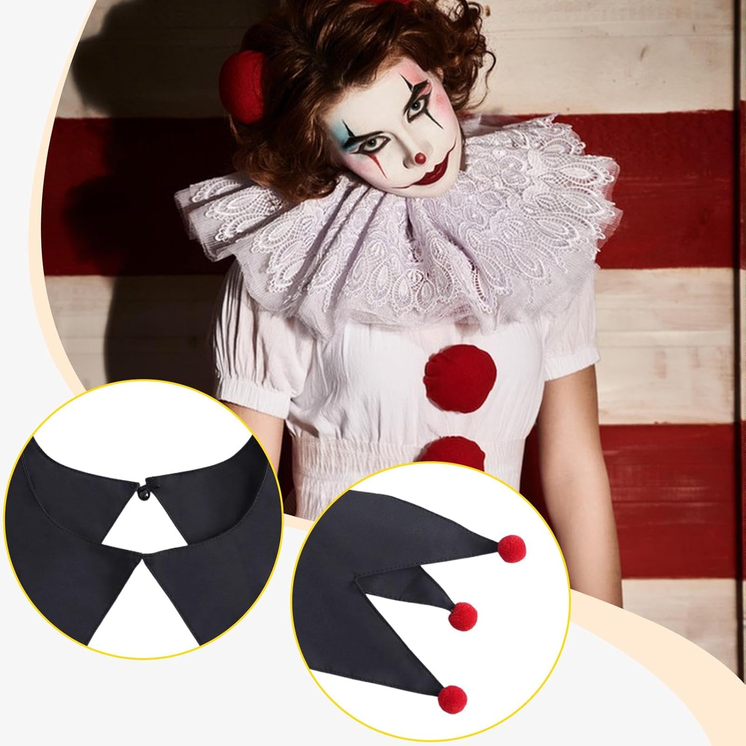 【Materiale】: i collari da clown di Halloween sono realizzati in poliestere, offrendo comfort e traspirabilità per un uso prolungato durante eventi o spettacoli 【Pacchetto】: Riceverai 1 collare da clown di Halloween 【Taglia】: Progettato con una nferenza del collo di 58 cm/22,83 pollici, questo collare da clown da offre una vestibilità aderente ma comoda per la maggior parte degli indossatori 【Accessori per costumi da giullare】: questo colletto da clown è un accessorio sia per uomini che per donne, ottimo per Halloween, cosplay, spettacoli circensi e feste a tema, 【Facile da indossare】: i collari da clown sono facili da indossare e da togliere, progettati per vestirsi velocemente in modo da poter essere pronti in pochi secondi, rendendolo comodo