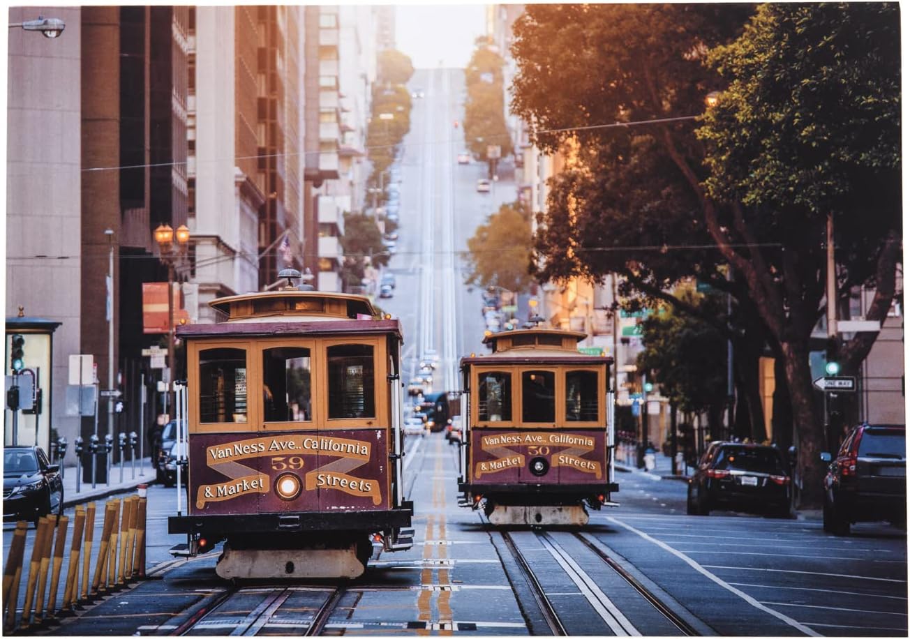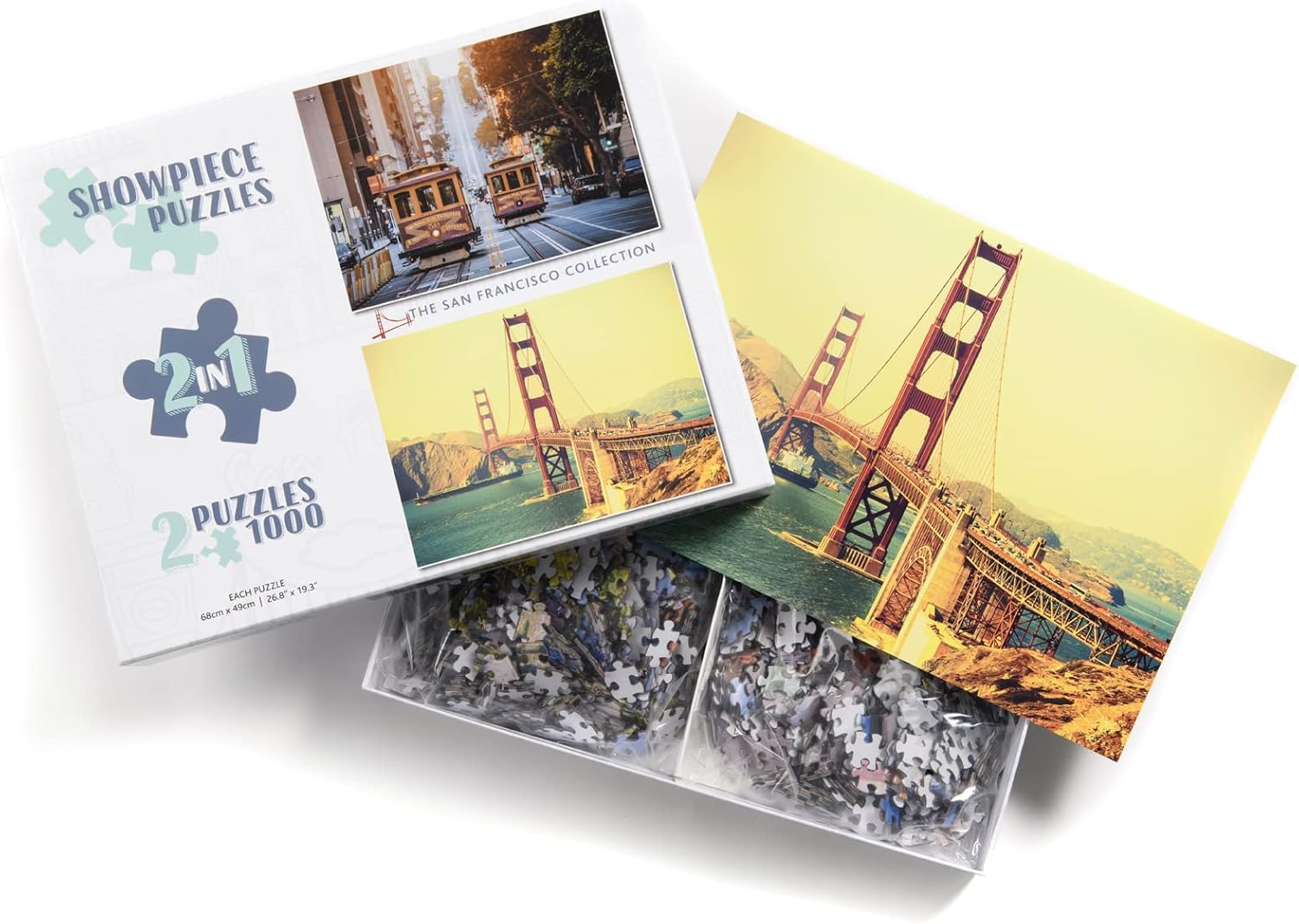 Puzzle 2 x 1000 di qualità premium Include due puzzle da 48 x 68 cm Cartone spesso 2,1 mm, pannello di supporto bianco Inserto fronte-retro gratuito di entrambe le immagini Immagini originali con licenza professionale San Francisco - Vista classica delle tradizionali funivie storiche e del vecchio film retrò Golden Gate Bridge