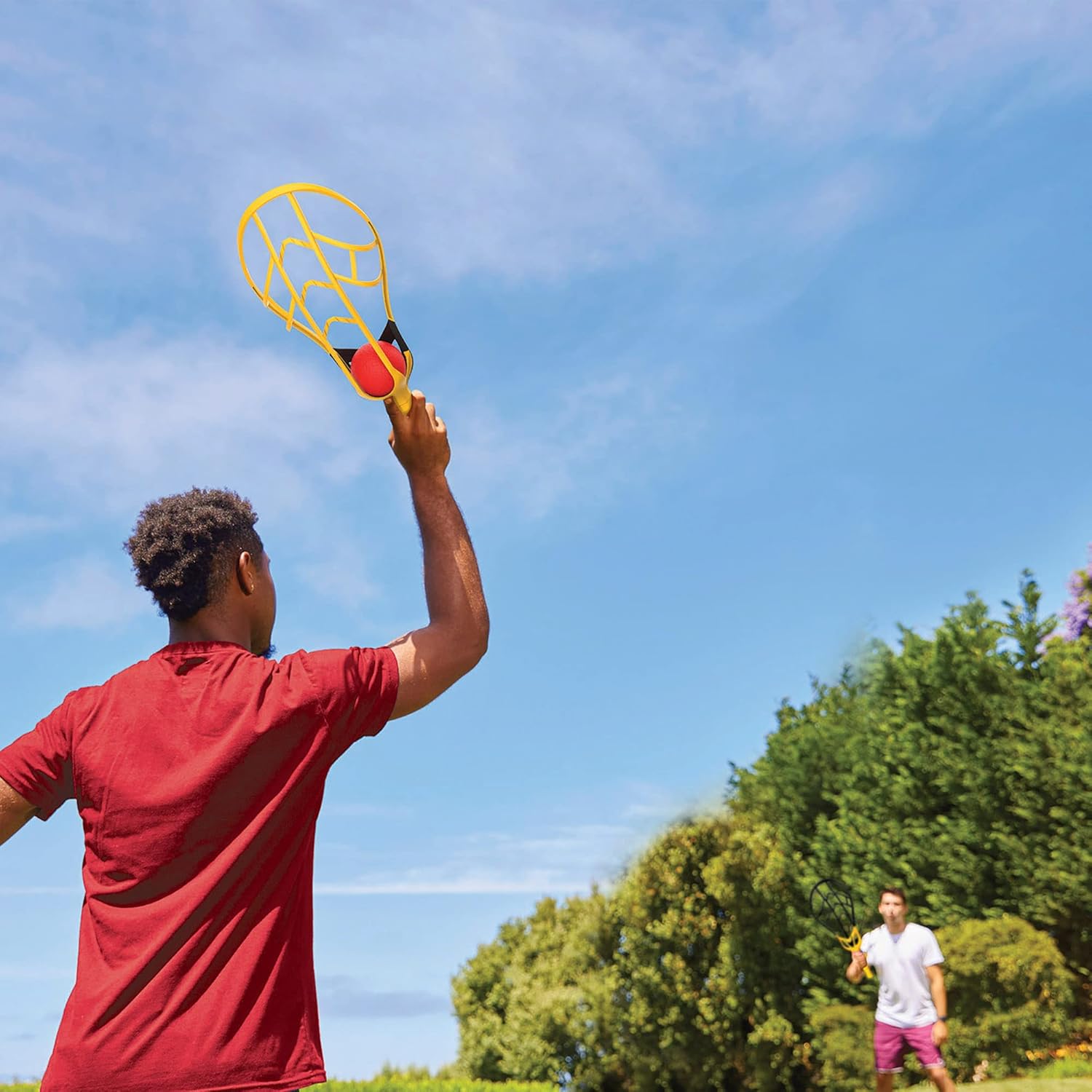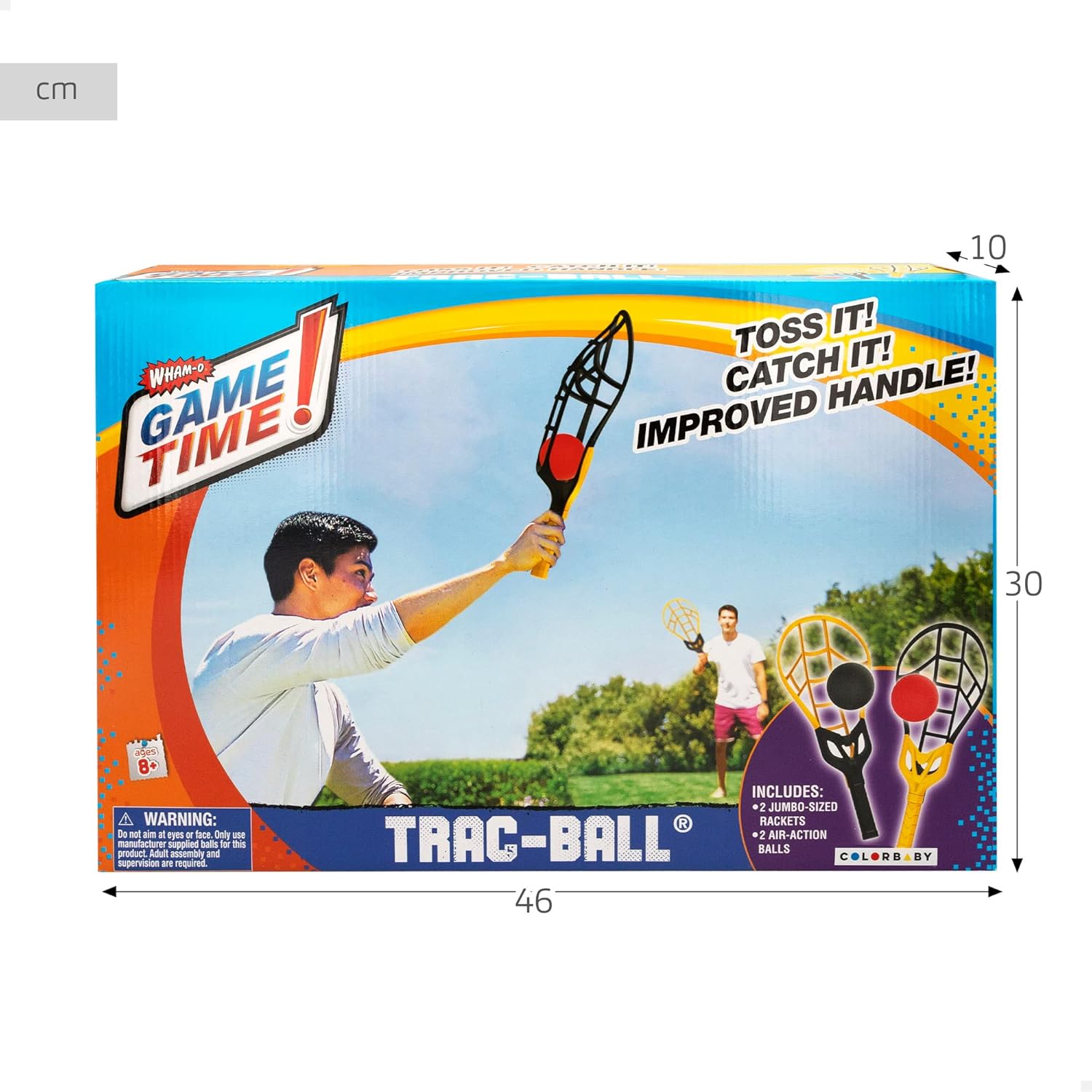 Gioca all'aperto e fai incredibili lanci con questo set di racchette Trac-Ball Wham-O Include: due grandi racchette per lanciare lunghe distanze e due palline Design: racchette nere e gialle lunghe 55,5 cm con design curvo e aerodinamico e palline rosse e nere da Ø 8,9 cm Valori: favorisce il gioco all'aperto, la socializzazione, le capacità motorie globali e l'acquisizione di abitudini di esercizio fisico Età e giocatori: consigliato per intervenire 2 giocatori dagli 8 anni in su