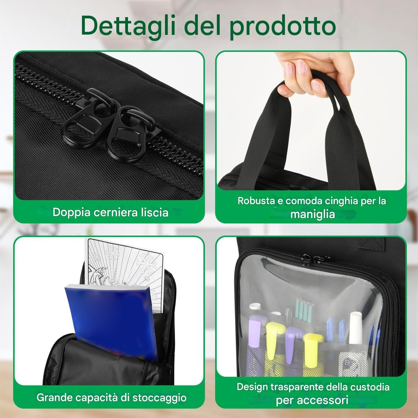 Protective Build: Made with premium water-resistant fabric and reinforced stitching, this coloring book holder protects art books and school supplies from moisture, bending, and daily wear, ensuring a long-lasting and neat storage solution Portable & Lightweight Design: Features a compact and travel-friendly structure with an easy-grip handle, making it convenient for kids to carry their coloring books, notebooks, and supplies to school, daycare, playdates, or family trips Spacious & Organized Interior: The main compartment fits standard-sized coloring books, notebooks, and folders, while the side pockets are perfect for storing crayons, pencils, markers, or erasers in secure and tidy space Gender Neutral Stylish Look: The sleek black design appeals to both boys and girls, making it a versatile choice for school or home use, and ensuring it blends seamlessly with other school accessories and personal items Eco Friendly & Reusable Choice: Designed as a sustainable alternative to storage bags, this reusable book pouch promotes eco-conscious habits in children while providing a dependable and stylish everyday solution