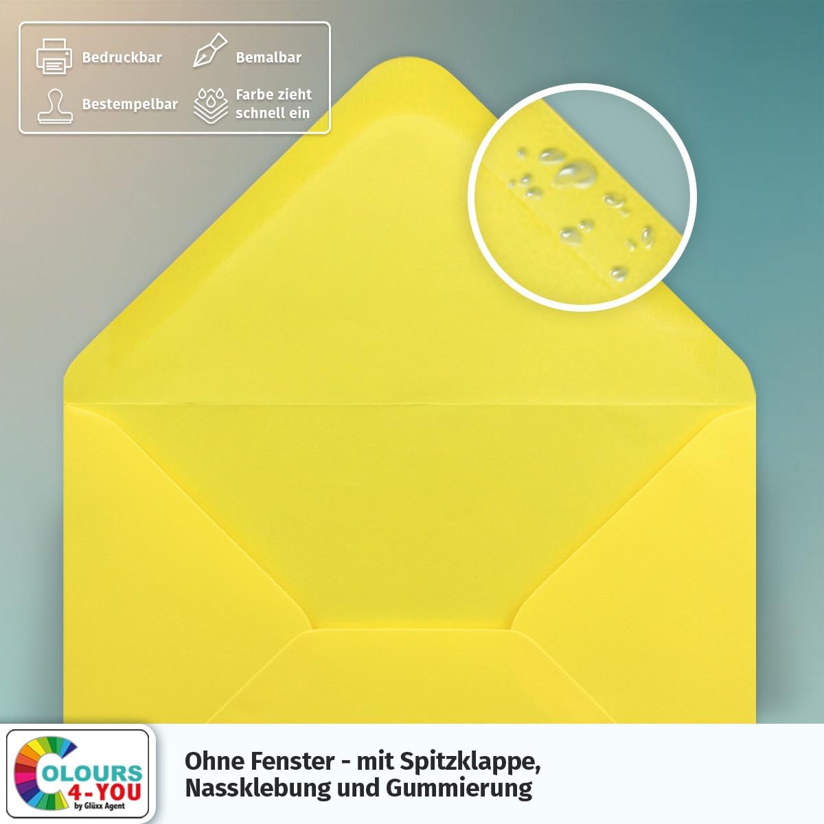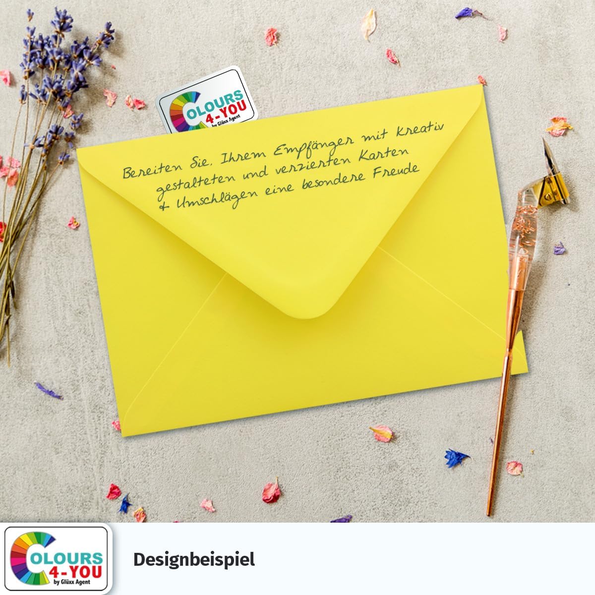 Formato: DIN C6 – 114 x 162 mm (11,4 x 16,2 cm) – con incollaggio a umido e gommatura, senza finestra Colore e grammatura: giallo – 100 g/m² Al tatto: piacevole al tatto con una superficie opaca, bella profondità di colore Ideale per le occasioni: matrimoni, lettere standard, Natale, lutto, lettere d'amore, inviti, compleanni, nascite e bricolage (fai da te) Contenuto: 200 buste della serie – COLOURS-4-YOU