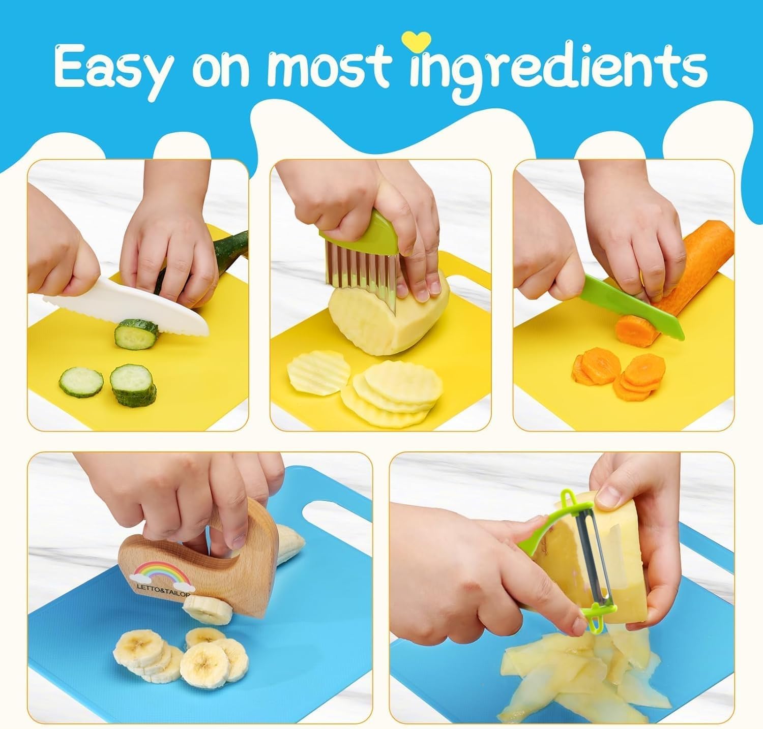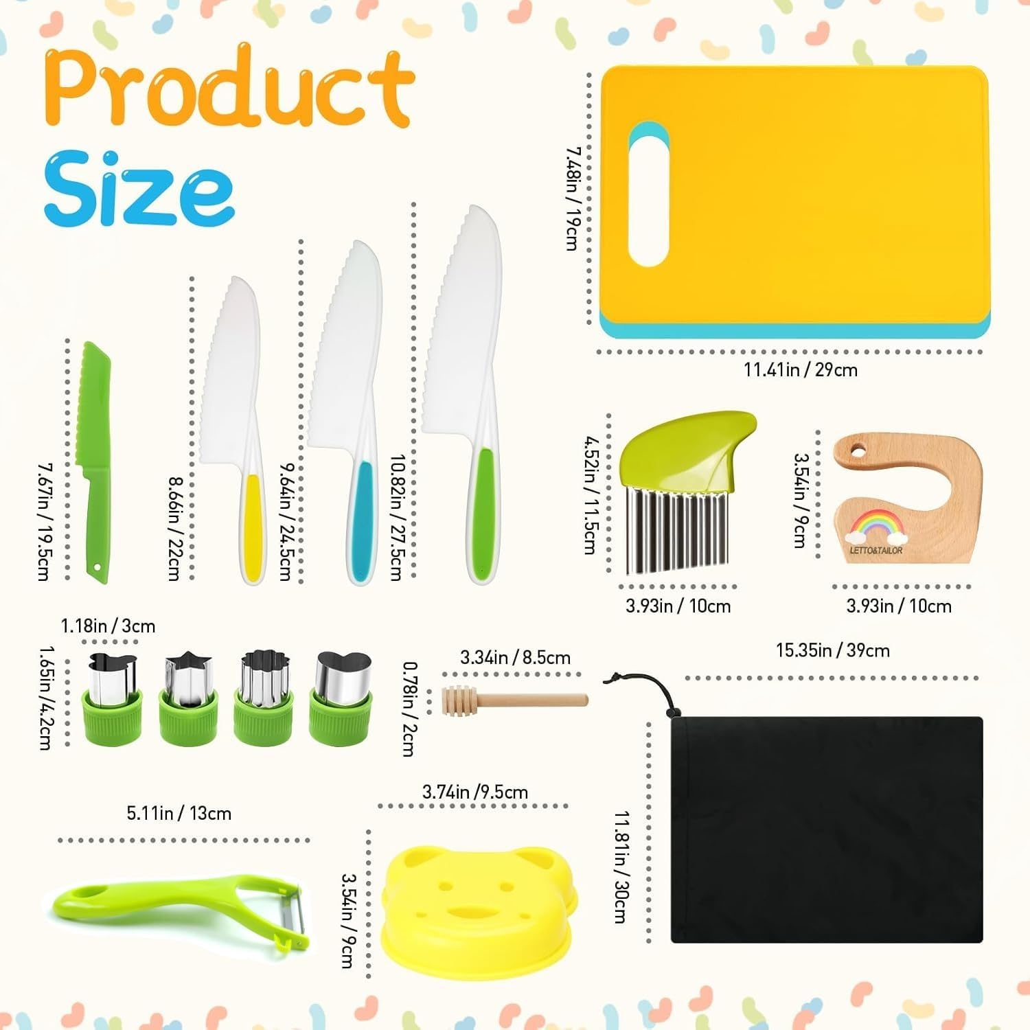 🌞 【Cosa è incluso nel set】 Riceverai 1 coltello per bambini in legno, 1 taglia sandwich grande, 4 coltelli per bambini con bordi seghettati in diverse dimensioni/colori, 4 * stampi per tagliare la frutta, 1 * pelapatate a Y, 1 * tagliere, 1 * spazzola per la pulizia, 1 * custodia, ecc. Una varietà di coltelli per bambini può aumentare il divertimento dei giochi di cucina per bambini. 🌞【Materiale durevole e sicuro】I coltelli per bambini per la vera cucina sono realizzati in legno e polipropilene alimentare di alta qualità. Il coltello per bambini per tagliare le patate è realizzato in acciaio inossidabile di alta qualità e materiale PP. Questi coltelli per bambini sono materiali atossici, privi di BPA, sicuri da usare, lavorazione squisita, non facili da rompere e deformare. Il nostro set di coltelli da insalata ti offre una buona esperienza utente. 🌞【Design ergonomico】Il coltello per bambini in legno ha un design della maniglia integrato, la forza del bambino può essere completamente applicata alla lama, il che è sicuro e fa risparmiare lavoro. Il design sottile della maniglia rende la maniglia comoda e leggera. 🌞 【Allenamento delle competenze】 I coltelli a prova di bambino sono progettati appositamente per i più piccoli, i bambini possono cucinare in cucina con la madre, rendere i tuoi figli più partecipativi, allo stesso tempo allenare la coordinazione occhio-mano dei bambini e migliorare la percezione. 🌞【Multifunzione】Gli utensili da cucina in legno per bambini possono tagliare facilmente diversi tipi di verdura, frutta, formaggio e altri alimenti, adatti affinché i bambini imparino a tagliare. Questi coltelli per bambini possono essere utilizzati in molte occasioni, come ad esempio: riunioni di famiglia, picnic, feste di compleanno, attività genitore-figlio, ecc., aggiungendo fascino a queste occasioni.