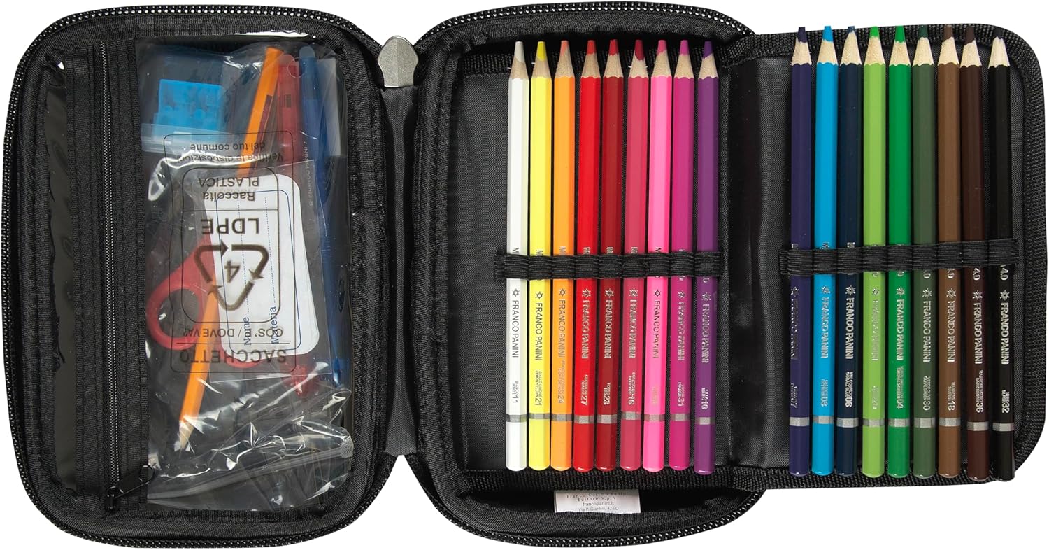 Molto carino e comodo, essendo rigido con il carico dello zaino il materiale al suo interno resta intatto e non rischia di prendere colpi. Pastelli pennarelli e penne di ottima qualità.. astuccio completo di tutto. Consiglio!
