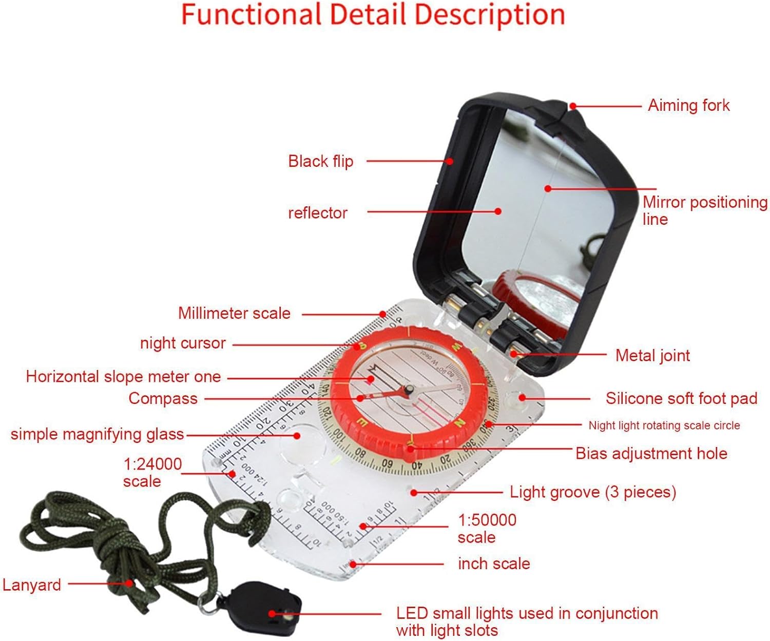 Portable Navigation Compass: Ideal for hiking, camping, and outdoor exploration, this portable compass ensures you with accurate directions Bias Adjustment for Accuracy: Featuring bias adjustment, this compass enhanced accuracy in map reading and navigation, making it perfect for difficult terrains Field Base Plate Design: The field base plate compass provides stability and ease of use during outdoor activities like trekking, camping, or orienteering Compact with Built-in Light: With a light/white color and built-in light, this compact compass provides visibility even in low-light environments, ideal for use in varying lighting conditions Sturdy Construction: Crafted from acrylic and ABS materials, this compass is lightweight, tough, and designed for rugged outdoor conditions, ensuring longevity and reliability