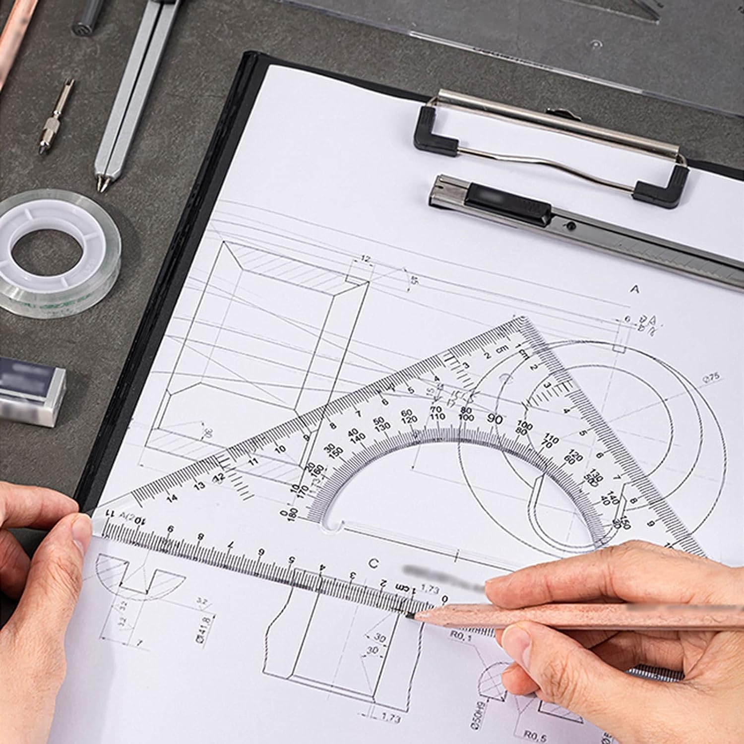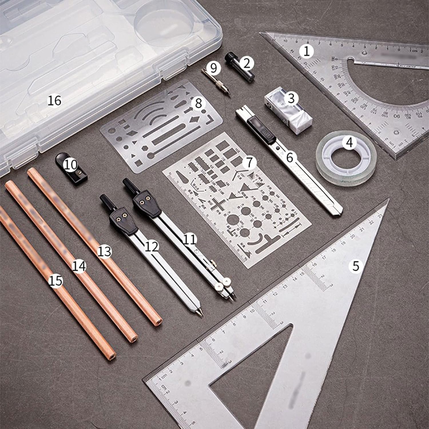 Realizzati con materiali durevoli, i nostri strumenti sono progettati per garantire precisione e durata costanti, sia che tu sia uno studente alle prese con i compiti di geometria, sia che tu sia un professionista che lavora su progetti complessi. Il set contiene: 2 triangoli (45° e 30°/60°), anima in mina, gomma, nastro adesivo, taglierino, modello da disegno, foglio di cancellazione, testina di ricambio per compasso, temperamatite, compasso, divisore, matita, scatola di imballaggio. Le dimensioni della scatola di immagazzinaggio sono 155*265 mm/6,10*10,43 pollici. Le bussole e i divisori in metallo hanno linee arrotondate e risultano confortevoli. La scala è chiara, il righello è multifunzionale, può misurare angoli specifici, tracciare linee ausiliarie, ecc.