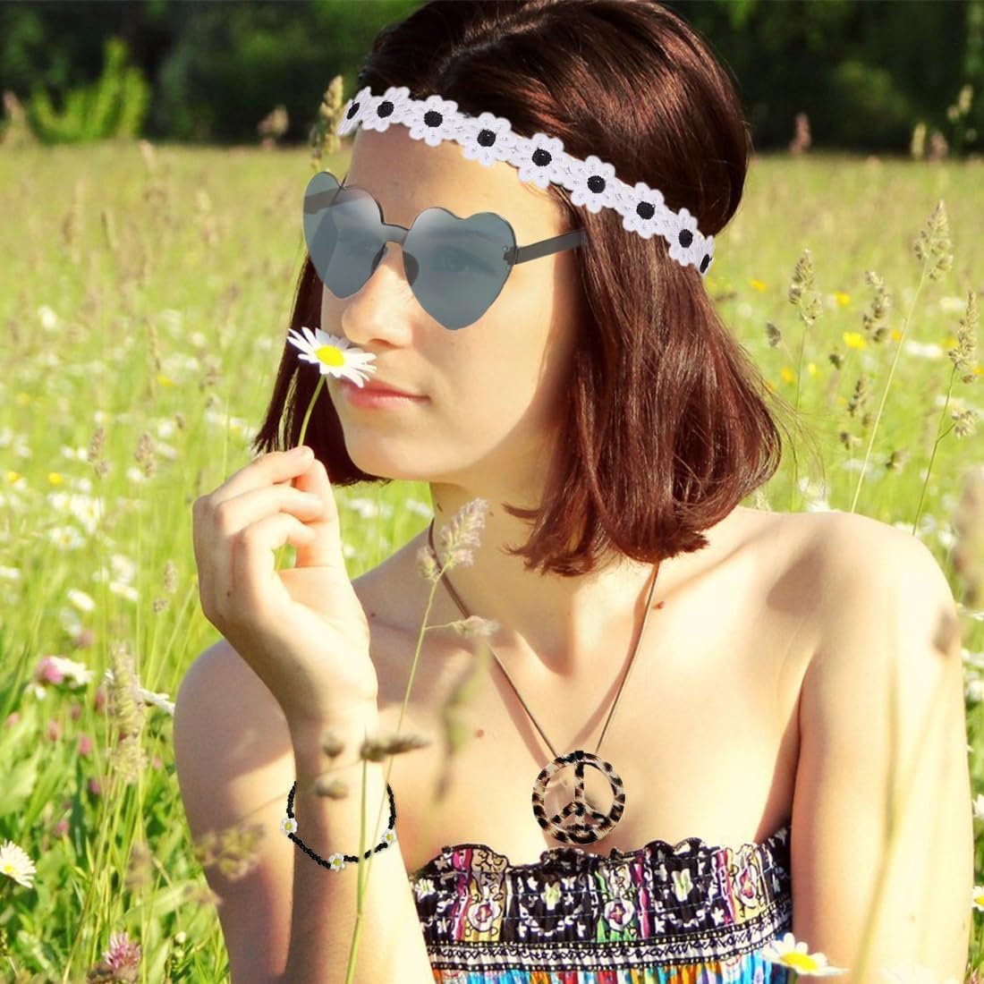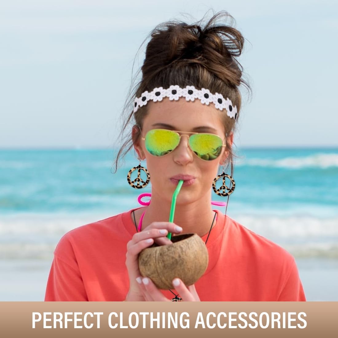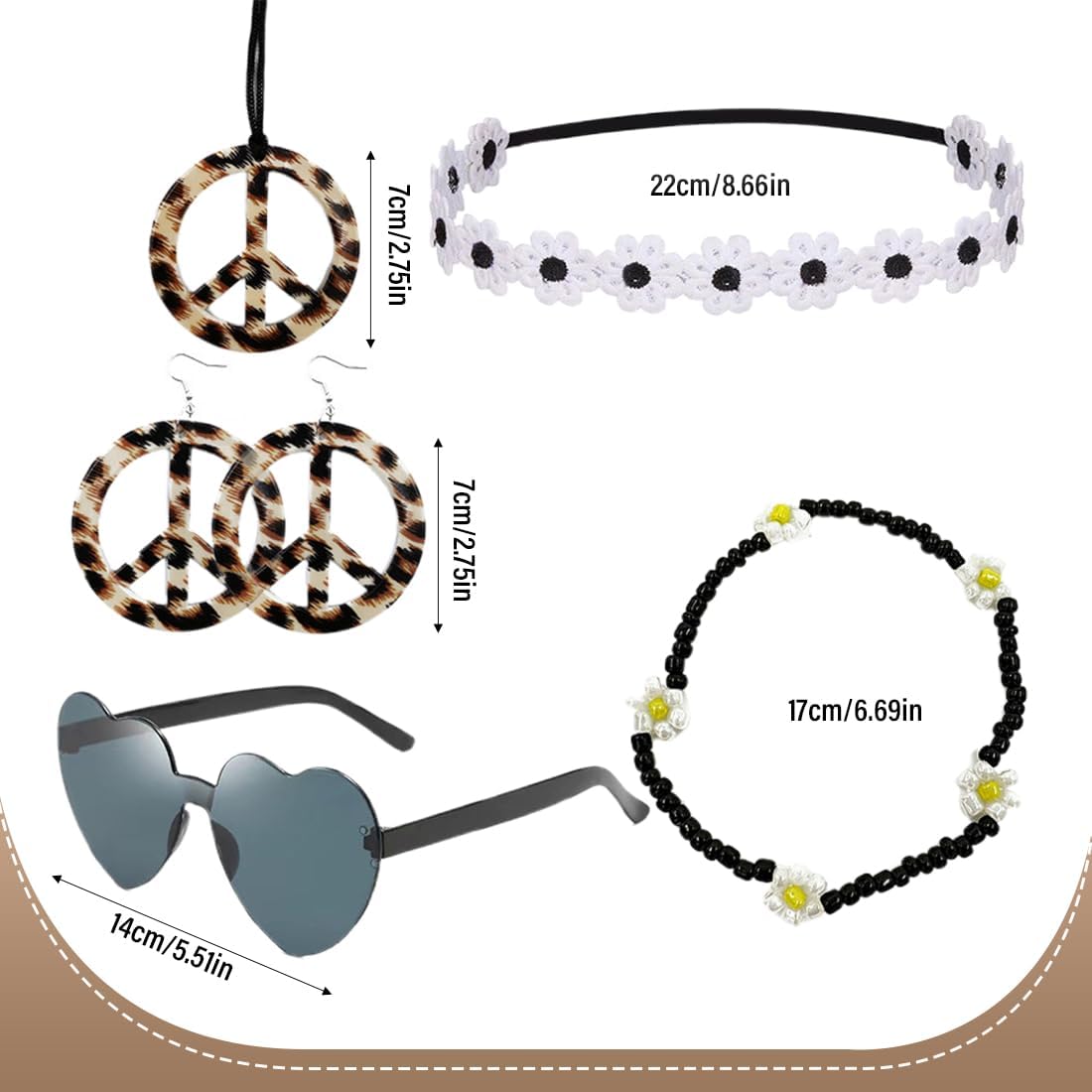 【Set costume hippie】: Riceverai 1 fascia per capelli a forma di girasole, 1 paio di occhiali da sole neri, 1 collana con il simbolo della pace, 1 paio di orecchini con il simbolo della pace e 1 braccialetto con il simbolo della pace. Questi accessori hippie, stravaganti e divertenti, soddisferanno la tua voglia di accessori. 【Chic e retrò】: questo set di accessori per feste hippie retrò è molto chic e retrò, ma allo stesso tempo vivace e carino, riportandoti agli hippy degli anni '60 e '70, mostrando la tua bellezza e il tuo fascino. 【Affidabile e robusto】: la fascia per capelli è realizzata in tessuto elastico, morbido e colorato; gli occhiali da sole vintage sono realizzati in lega e plastica, robusti ma leggeri; gli orecchini con collana con simbolo della pace sono realizzati principalmente in lega, garantendo un utilizzo a lungo termine. 【Taglia universale】: gli accessori Hippie sono di taglia universale per adulti e bambini, comodi e facili da indossare. Utilizzateli per creare un look hippie per adulti e bambini. 【Renditi il centro dell'attenzione】: gli accessori per costumi da discoteca hippie sono una scelta alla moda e accattivante per feste in costume a tema retrò, feste di Natale, feste di gioco di ruolo, festival musicali, carnevali, club, spettacoli teatrali e altri eventi a tema, soddisfacendo il tuo travestimento per aumentare l'interesse e portare divertimento alla festa