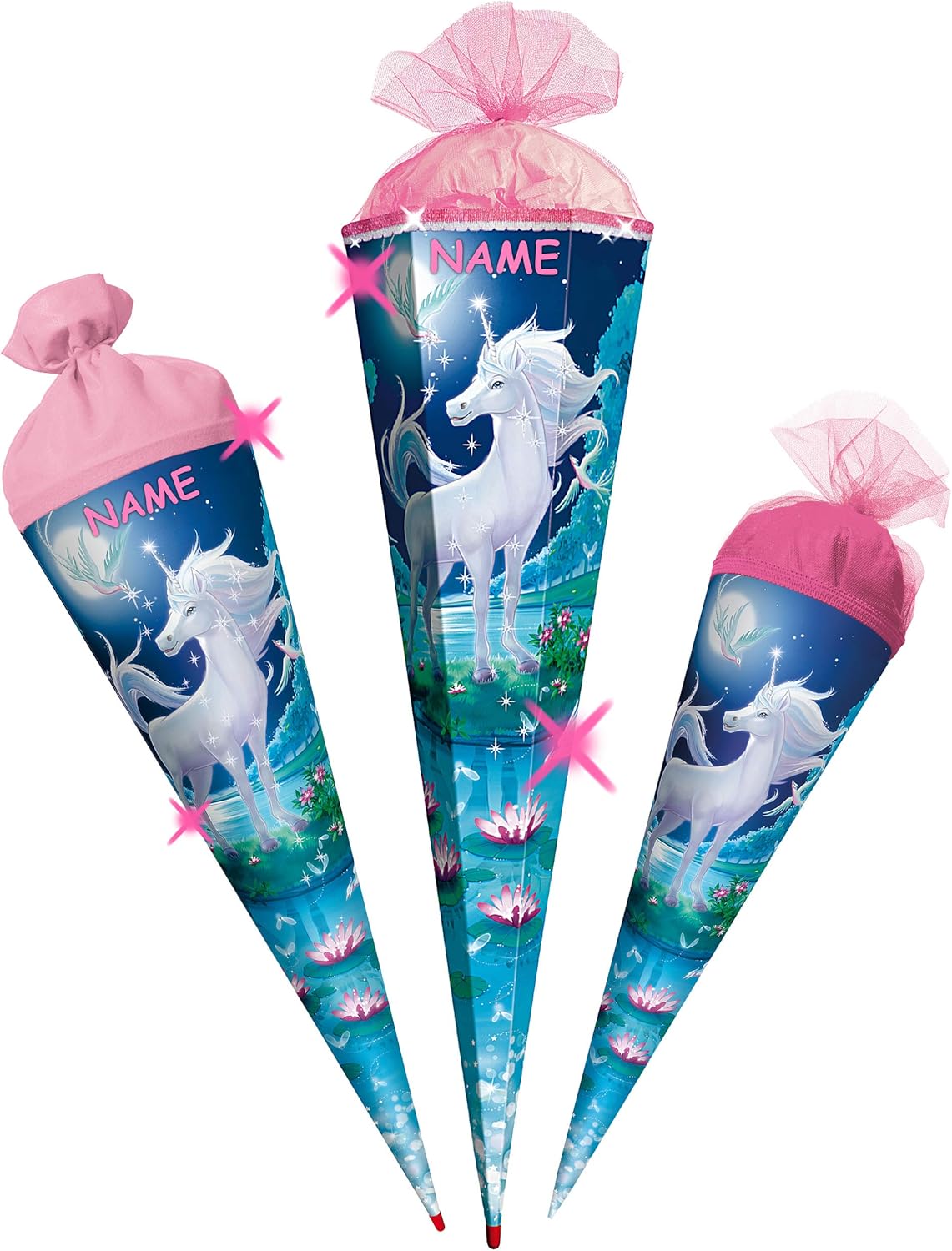 con fantastica stampa mica effetto 3D e stampa glitter!! ____ stabile e di alta qualità - cono scolastico ___ 35 cm di lunghezza ___ forma: ROTONDO ____ il bordo superiore ha un'elegante finitura in tulle ____ motivo: "unicorno in riva al lago" l'OCCHIO: ______ il tuo cono scolastico personalizzato ___ compreso: individualmente con il tuo NOME DESIDERATO - il nome verrà fatto corrispondere ___ la richiesta del nome verrà effettuata - AUTOMATICAMENTE entro 4 ore - NON inviare un messaggio in anticipo ___ incl. grande effetto 3D in coordinato con i colori _ fiocco: questo rende il tuo cono scolastico ancora più bello per attirare l'attenzione ______ la consegna dei bellissimi modelli di fiocchi è mista (puoi vedere esempi nelle immagini) made in Germany! __ con punta in legno stabile e fissata (originale Roth) ___ Materiale: cartone rivestito e di alta qualità - SUPER stabile! - idrorepellente! __ fantastici colori di stampa!_____ OPZIONALE è disponibile una punta in plastica abbinata, trasparente e solida da attaccare (questo rende la punta del cono scolastico molto stabile e stabile) ---- (questo articolo deve essere ordinato EXTRA al cono scolastico) e come extra: IL LOOP individuale con il nome DESIDERATO - aggiungi semplicemente l'articolo "nome desiderato" come extra nel carrello, il nome verrà poi applicato al fiocco