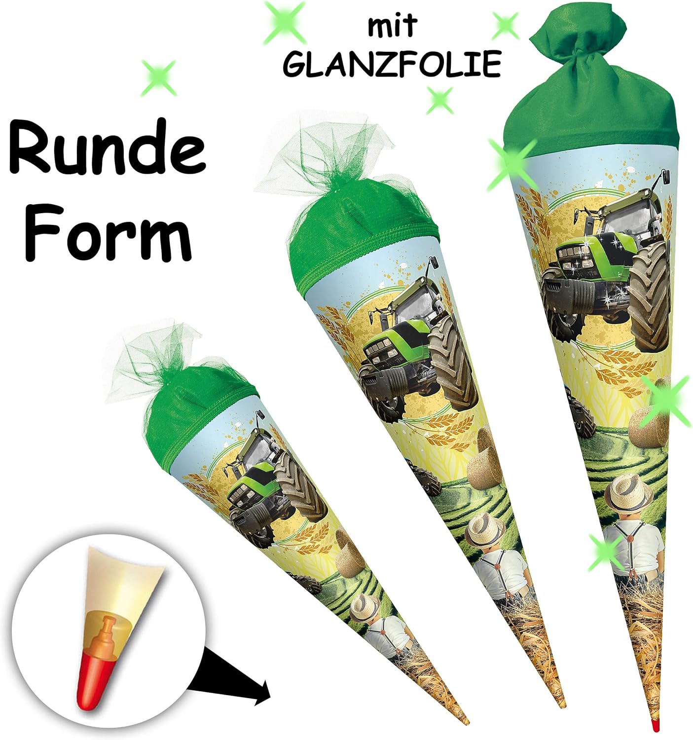 con fantastico effetto 3D GLITTER!! ____ fantastico set _____ stabile e di alta qualità - cono scolastico ___ 35 cm di lunghezza ___ Forma: ROTONDO ____ il bordo superiore ha una finitura in tulle ____ Motivo: "trattore verde" + 5 pezzi - coni scolastici extra in un colorato mix di colori da appendere o decorare _ Fiocco - con il tuo NOME DESIDERATO - il nome sarà fatto su misura! ___ viene richiesto il nome - AUTOMATICAMENTE entro 4 ore - NON inviare un messaggio in anticipo ___ i modelli di fiocco vengono consegnati misti / cercheremo un bellissimo fiocco effetto 3D abbinato per il tuo cono scolastico (puoi vedere esempi nelle foto) prodotto in Germania! __ I coni scolastici lunghi 70 e 85 cm hanno una punta di legno stabile e fissata in modo permanente (originale Roth) ___ Materiale: cartone rivestito e di alta qualità - SUPER stabile! - idrorepellente! __ fantastici colori di stampa!_____ OPZIONALE è disponibile una punta in plastica abbinata, trasparente e solida da attaccare (questo rende la punta del cono scolastico molto stabile e stabile) ---- (questo articolo deve essere ordinato EXTRA al cono scolastico) e come extra: IL cono scolastico individuale con il vostro NOME DESIDERATO - aggiungete semplicemente l'articolo "nome desiderato" come extra nel carrello, il nome verrà poi applicato al cono scolastico